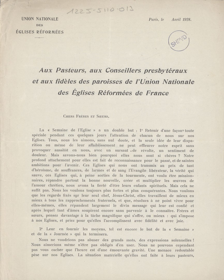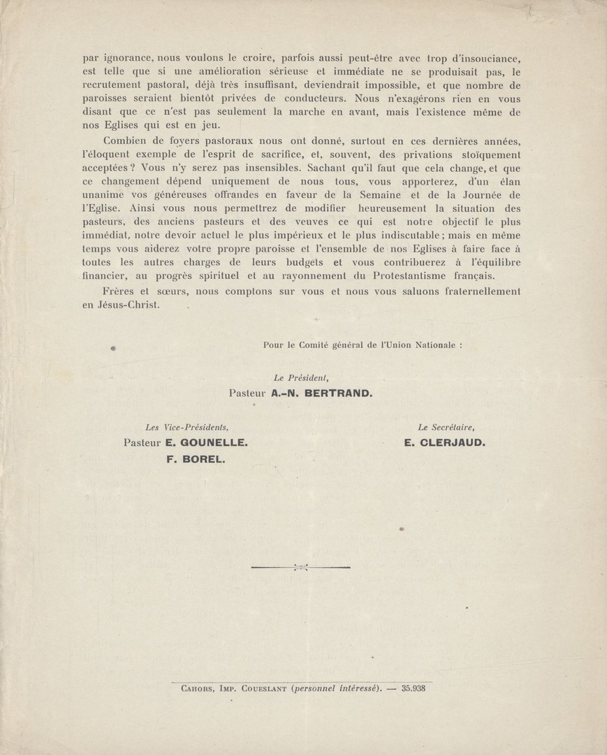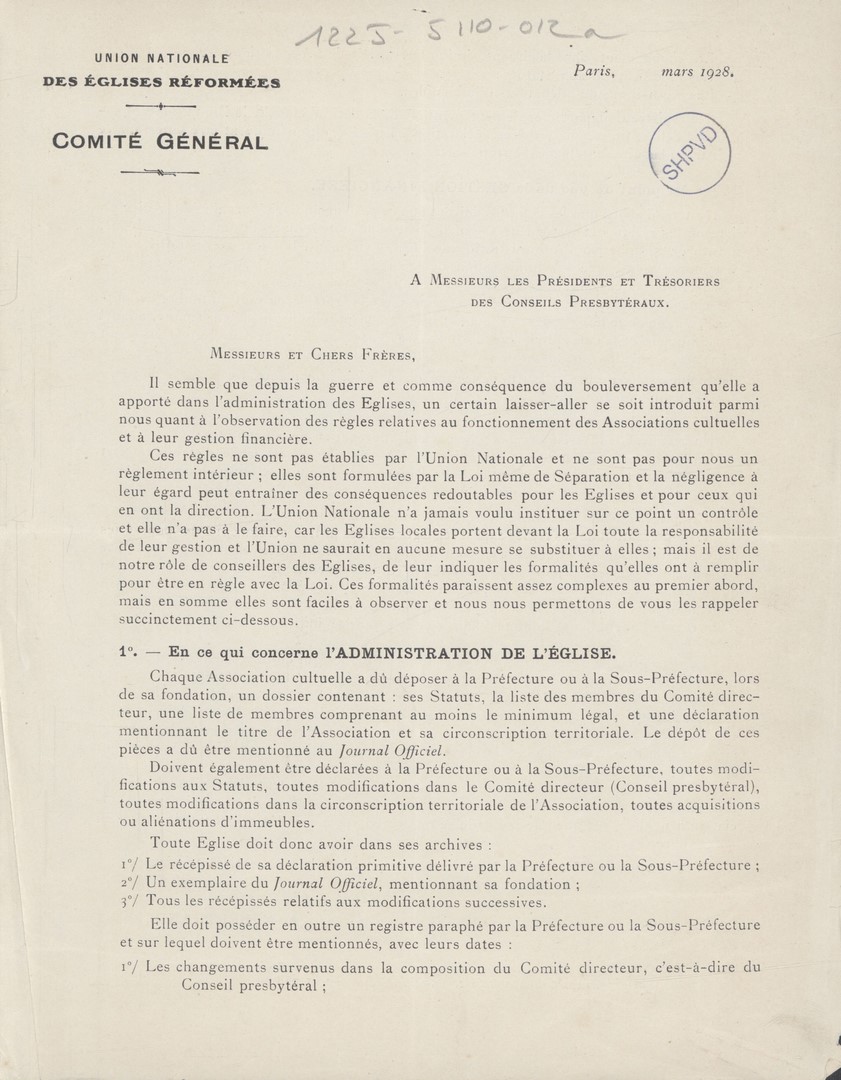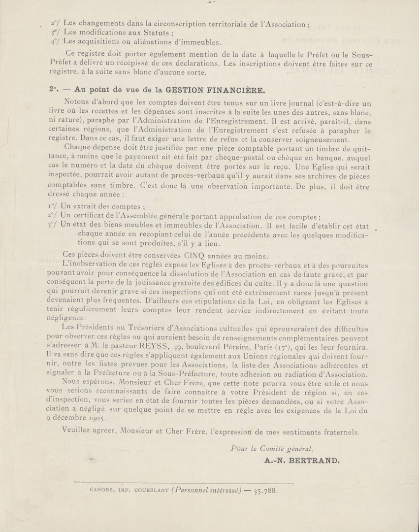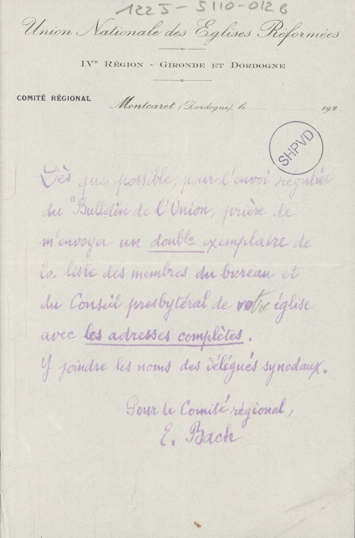 Comité Général de l'Union nationale des Églises réformées : circulaire adressée aux présidents et trésoriers des Conseils presbytéraux, concernant l'administration et la gestion financière des Eglises. "Il semble que depuis la guerre [...] un certain laisser-aller se soit introduit parmi nous quant à l'observation des règles relatives au fonctionnement des Associations cultuelles et à leur gestion financière". + circulaire du comité régional de l'Union nationale des Églises réformées (IV° région, Gironde et Dordogne) demandant la liste des membres du bureau et du Conseil presbytéral. Signée E. BACH