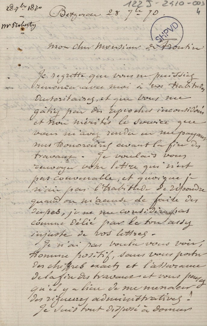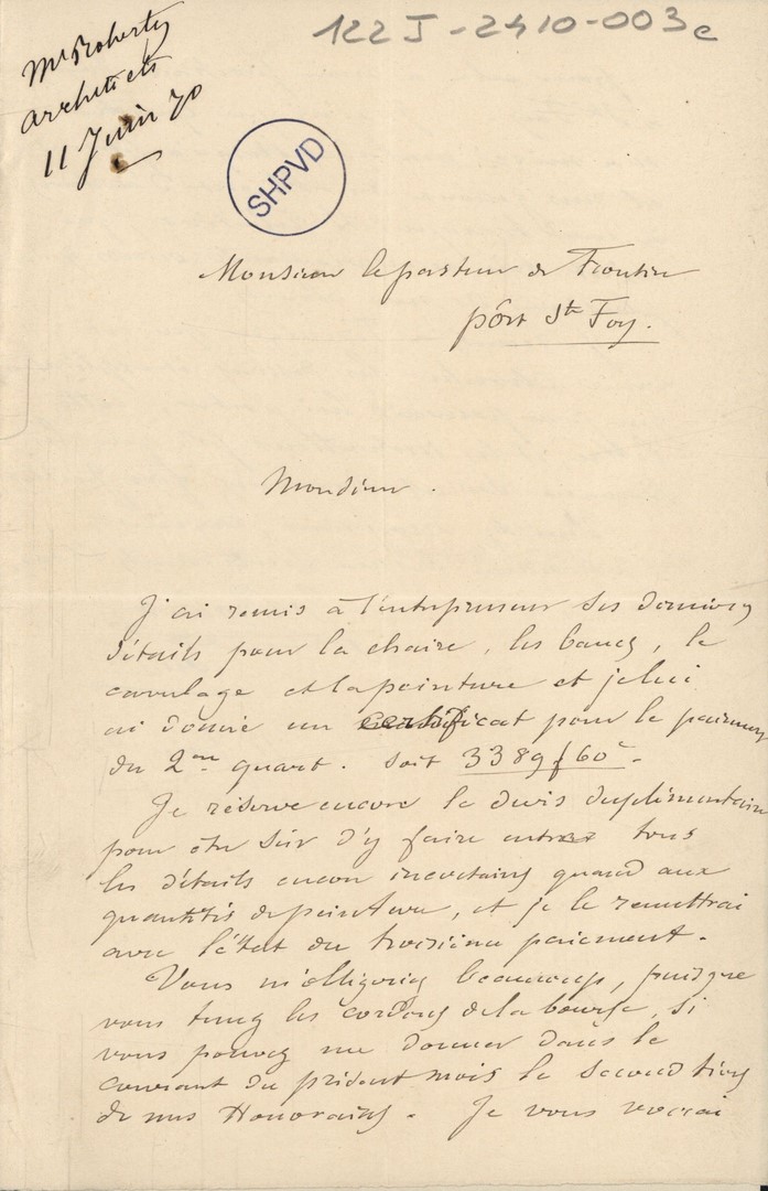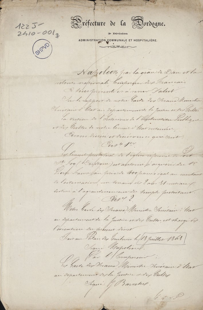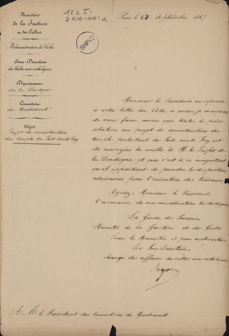 Dossier de décision de construction du temple de Port Sainte Foy, Consistoire, Ministère des cultes, Préfecture, 1867-1870