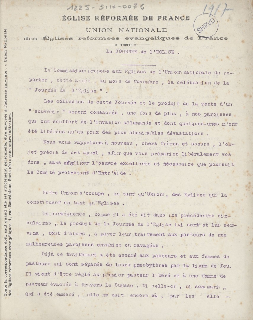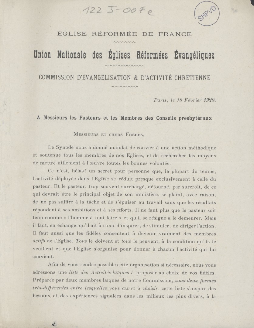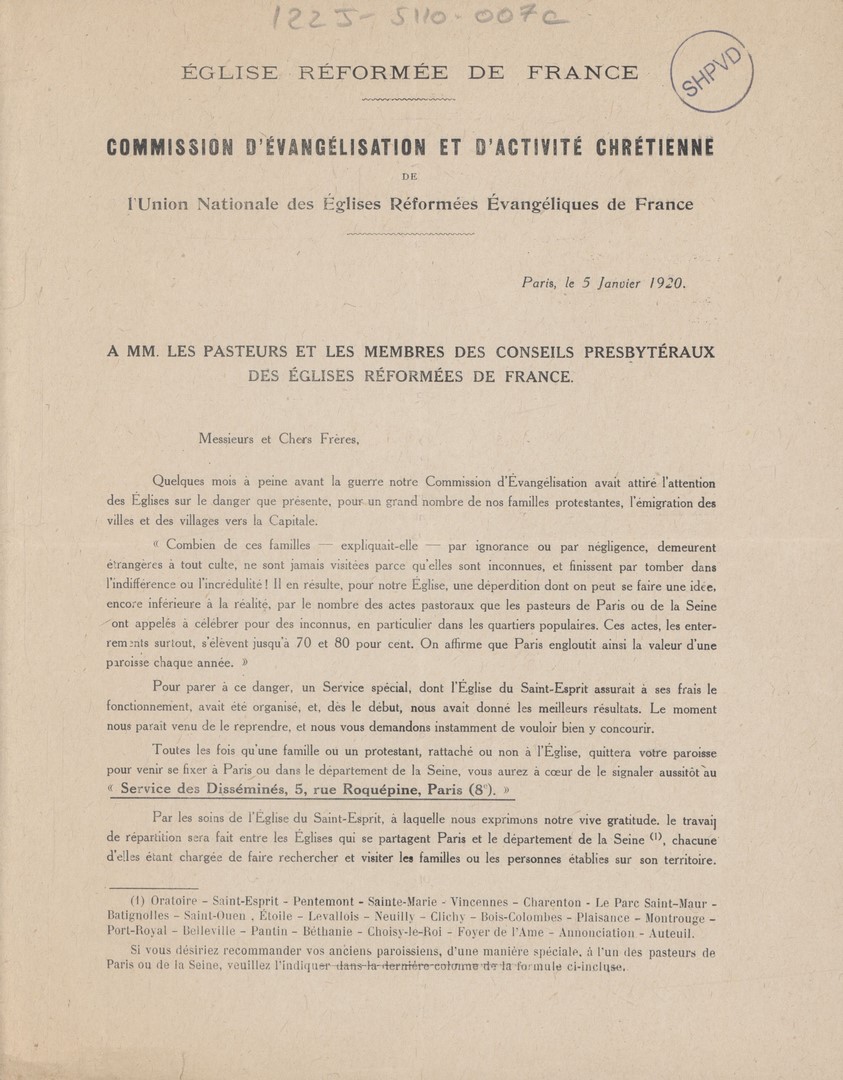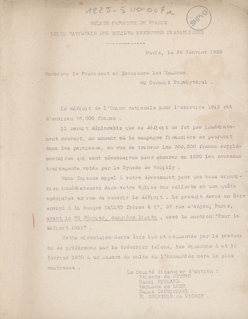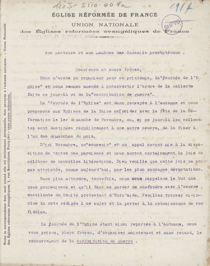 Union nationale des Églises réformées Évangéliques de France. Cinq circulaires adressées aux pasteurs et membres du Conseil presbytéral portant sur les contributions et l'évangélisation, 1917-1920