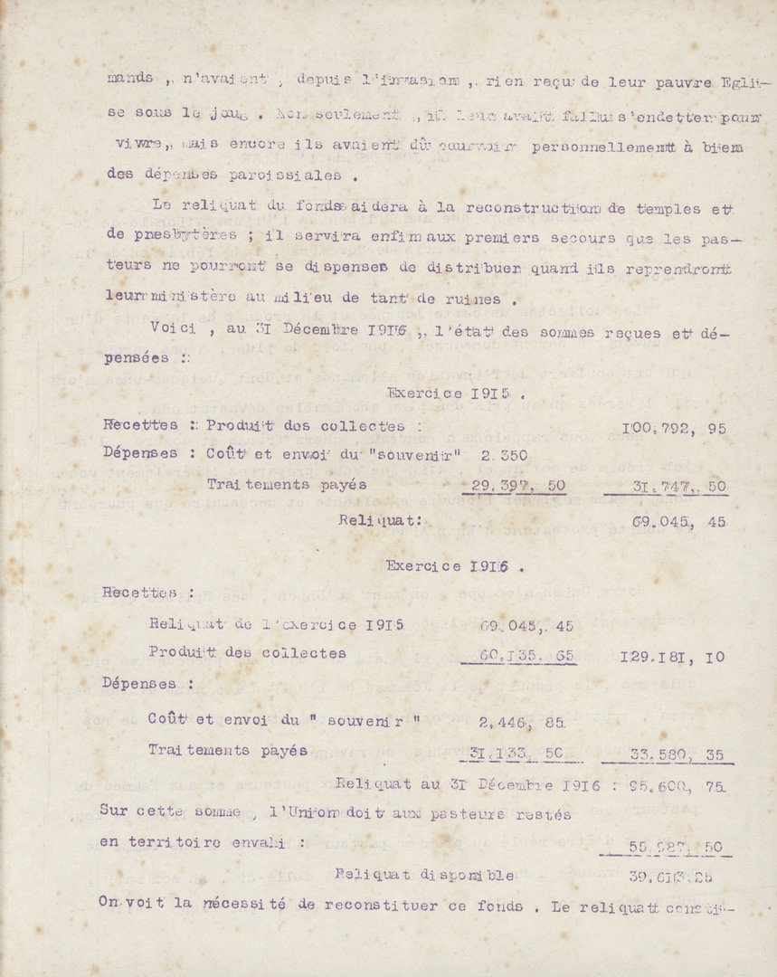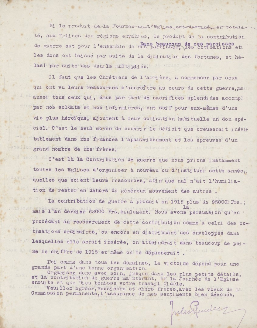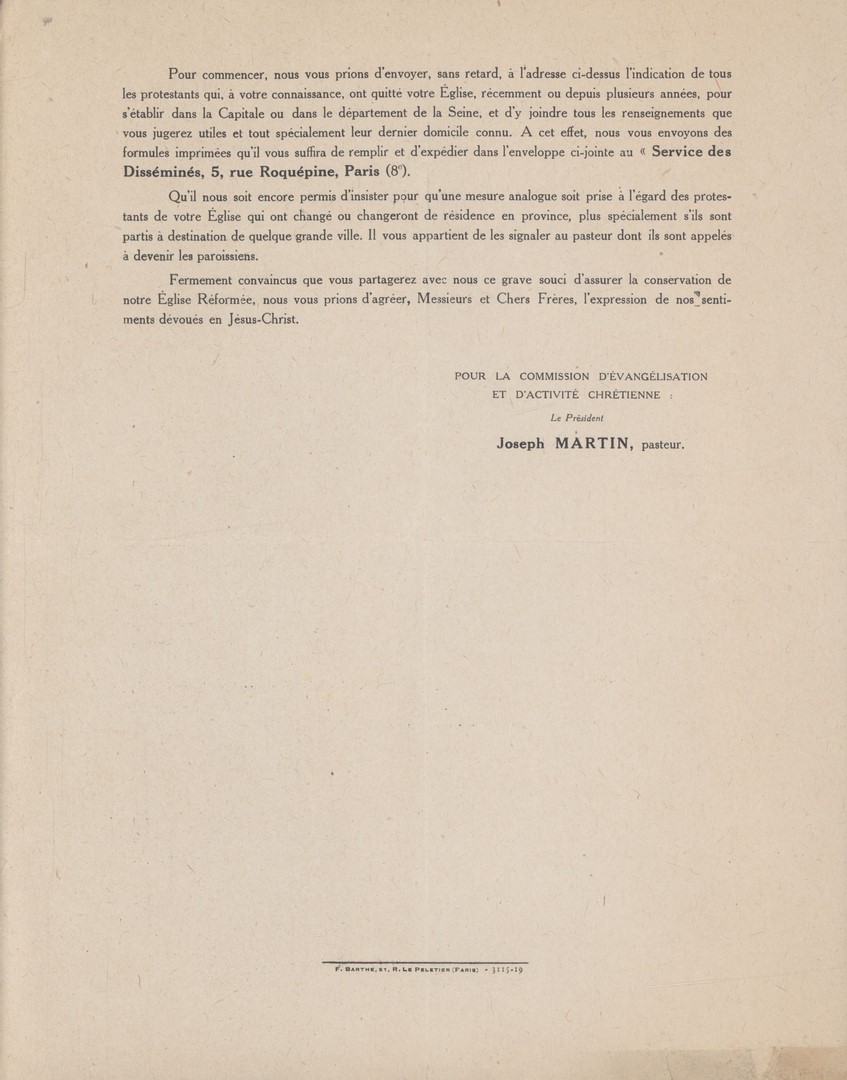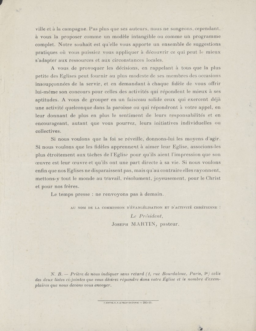 Union nationale des Églises réformées Évangéliques de France. Cinq circulaires adressées aux pasteurs et membres du Conseil presbytéral portant sur les contributions et l'évangélisation, 1917-1920