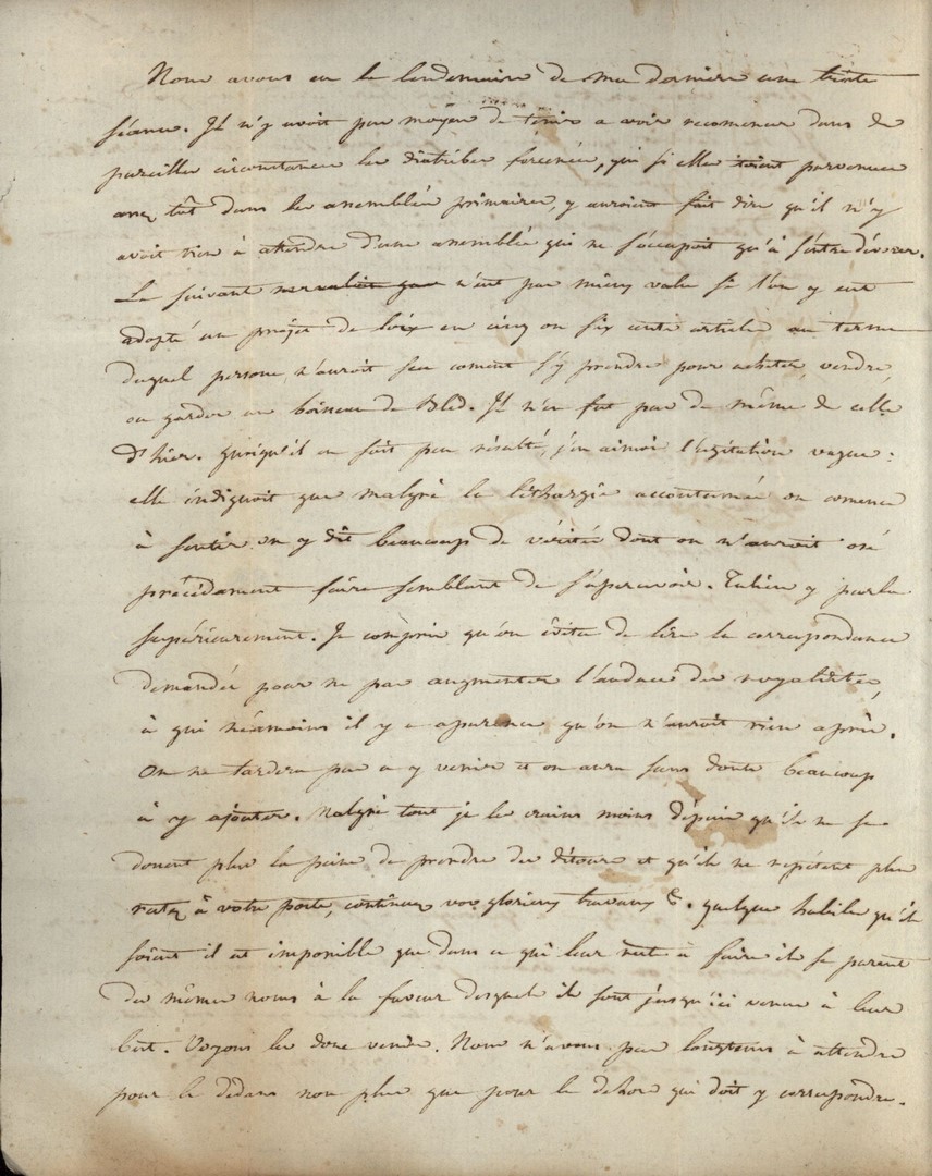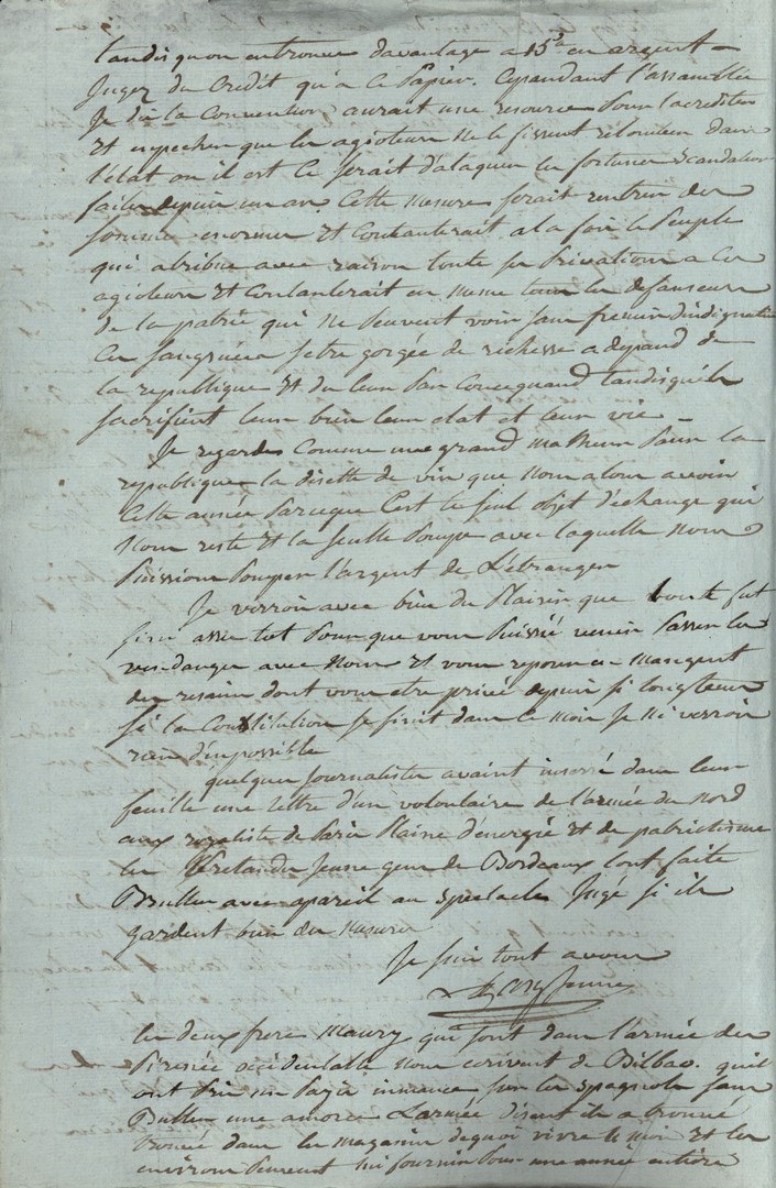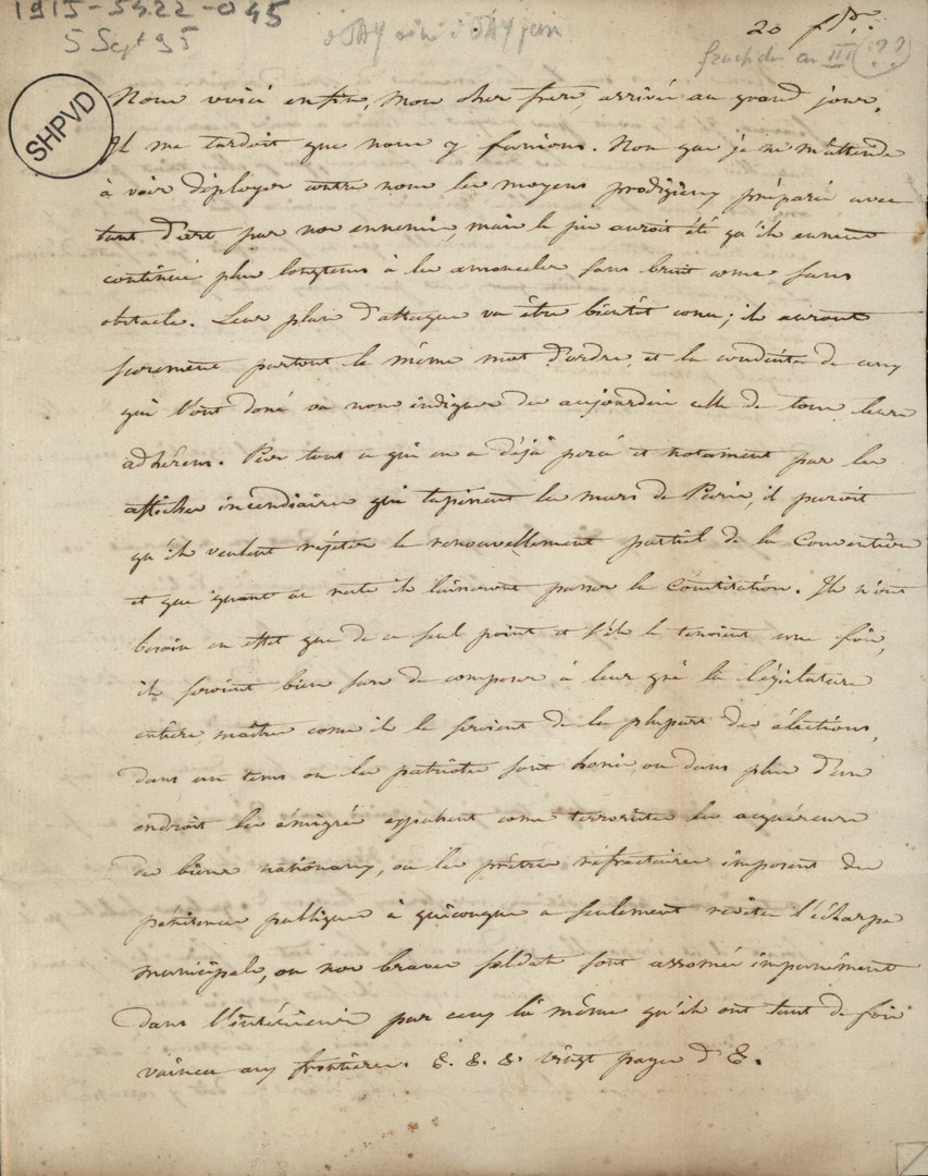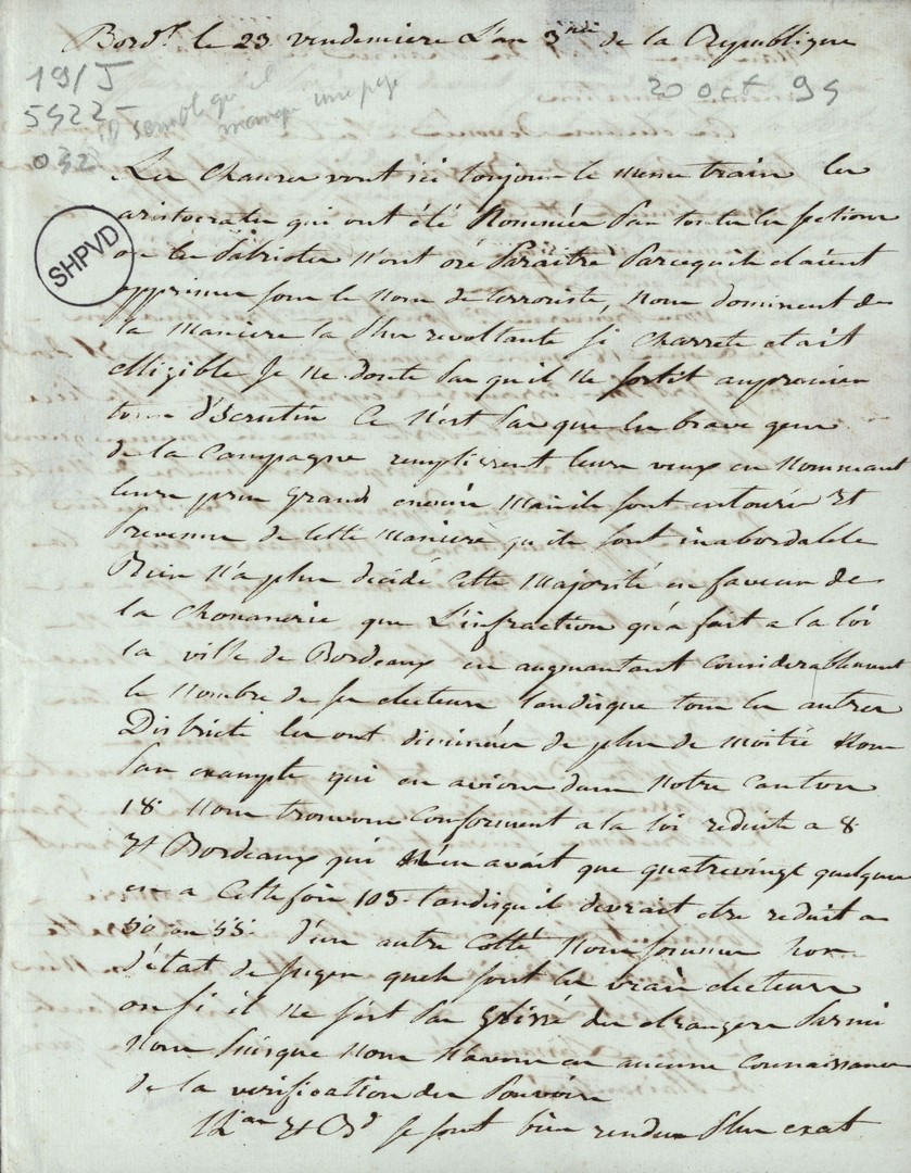 Cote du document: SHPVD-BN-191J-5422-042-00-00-00Lettre de Jay Jeune (Delile), Bordeaux, à Jean Jay, Député à Paris, 29 vendémiaire an 3