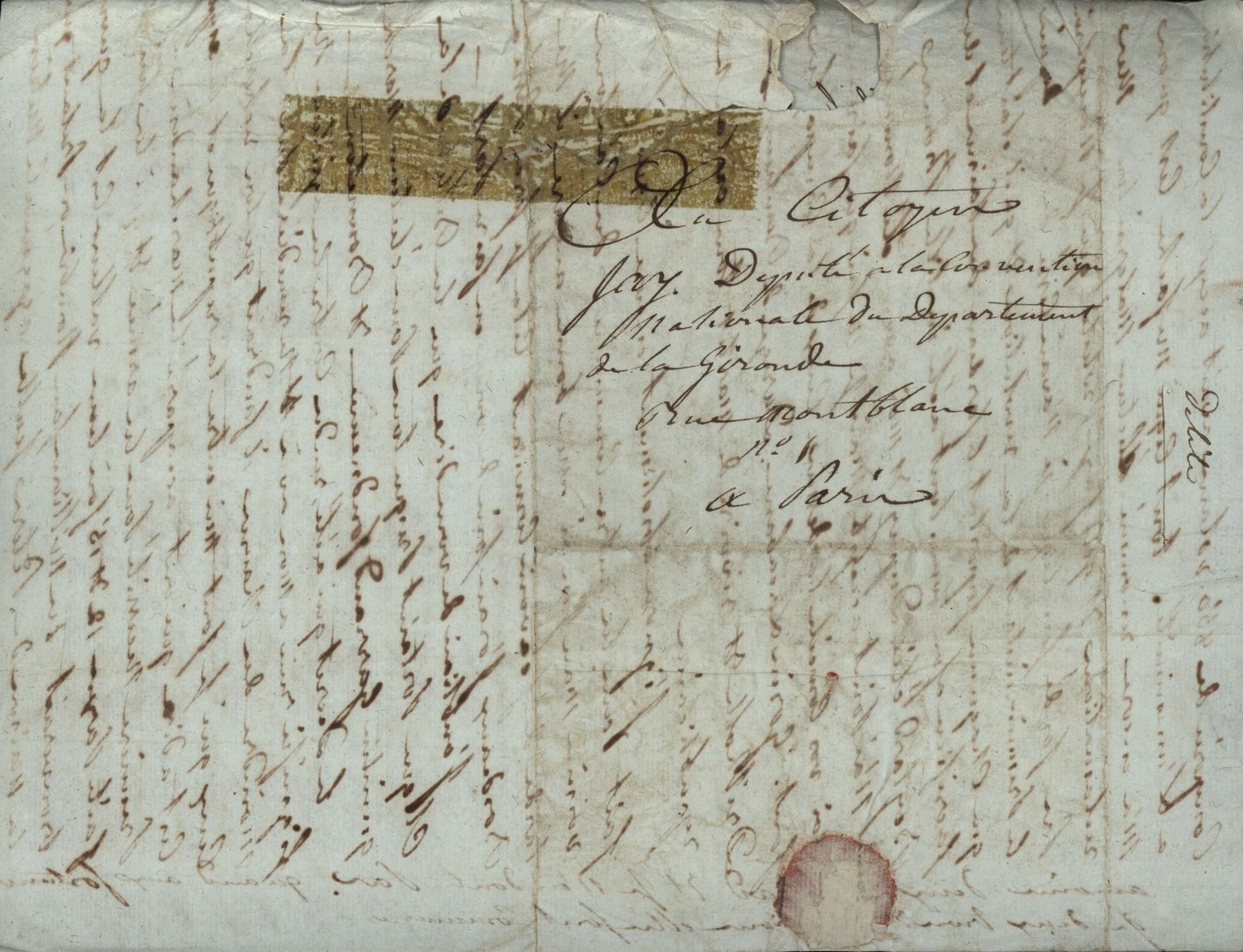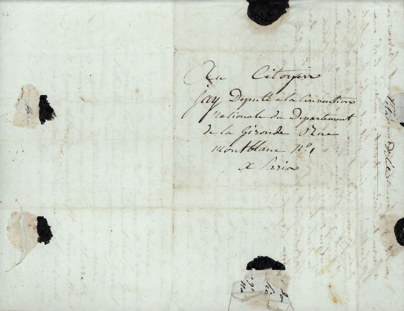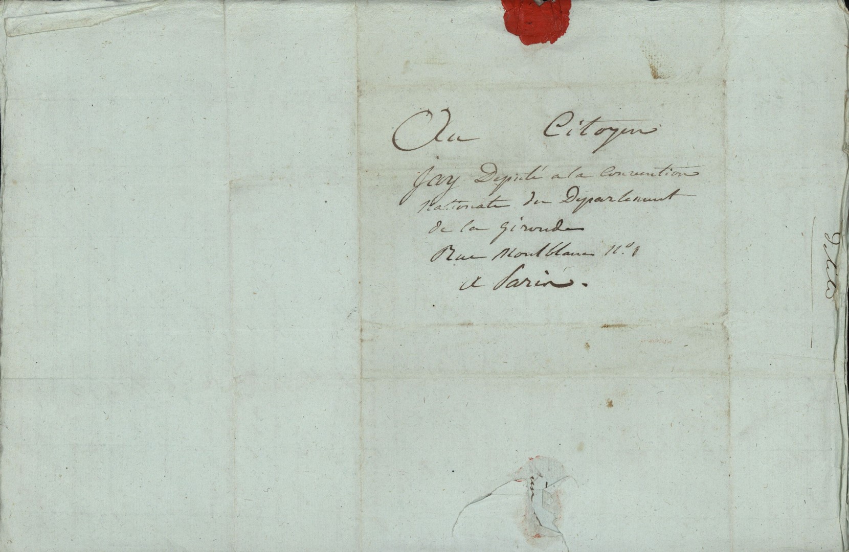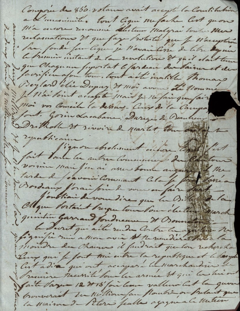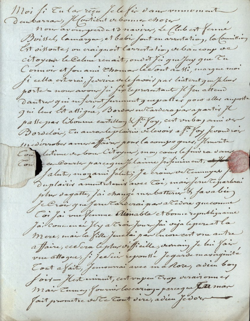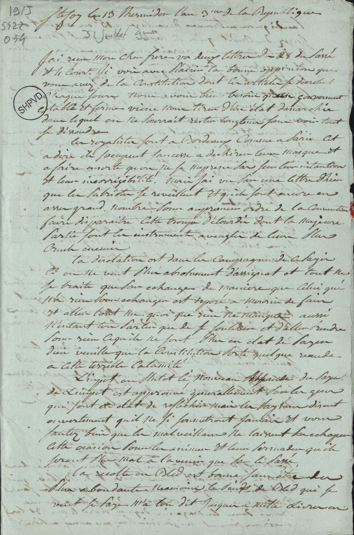 Cote du document: SHPVD-BN-191J-5422-044-00-00-00Lettre de Jay Jeune (Delile), Bordeaux, à Jean Jay, Député à Paris, 13 thermidor an 3