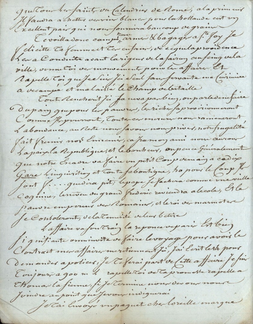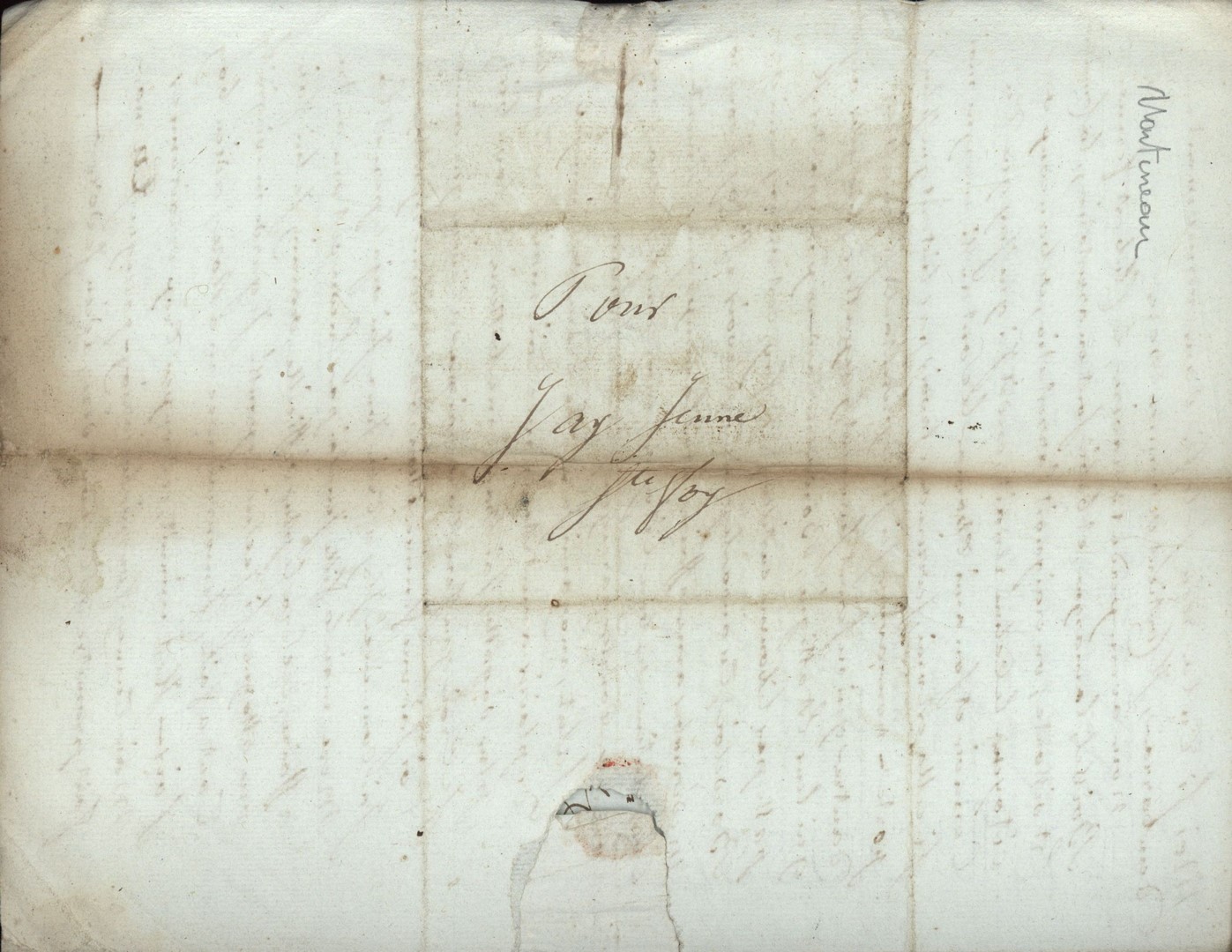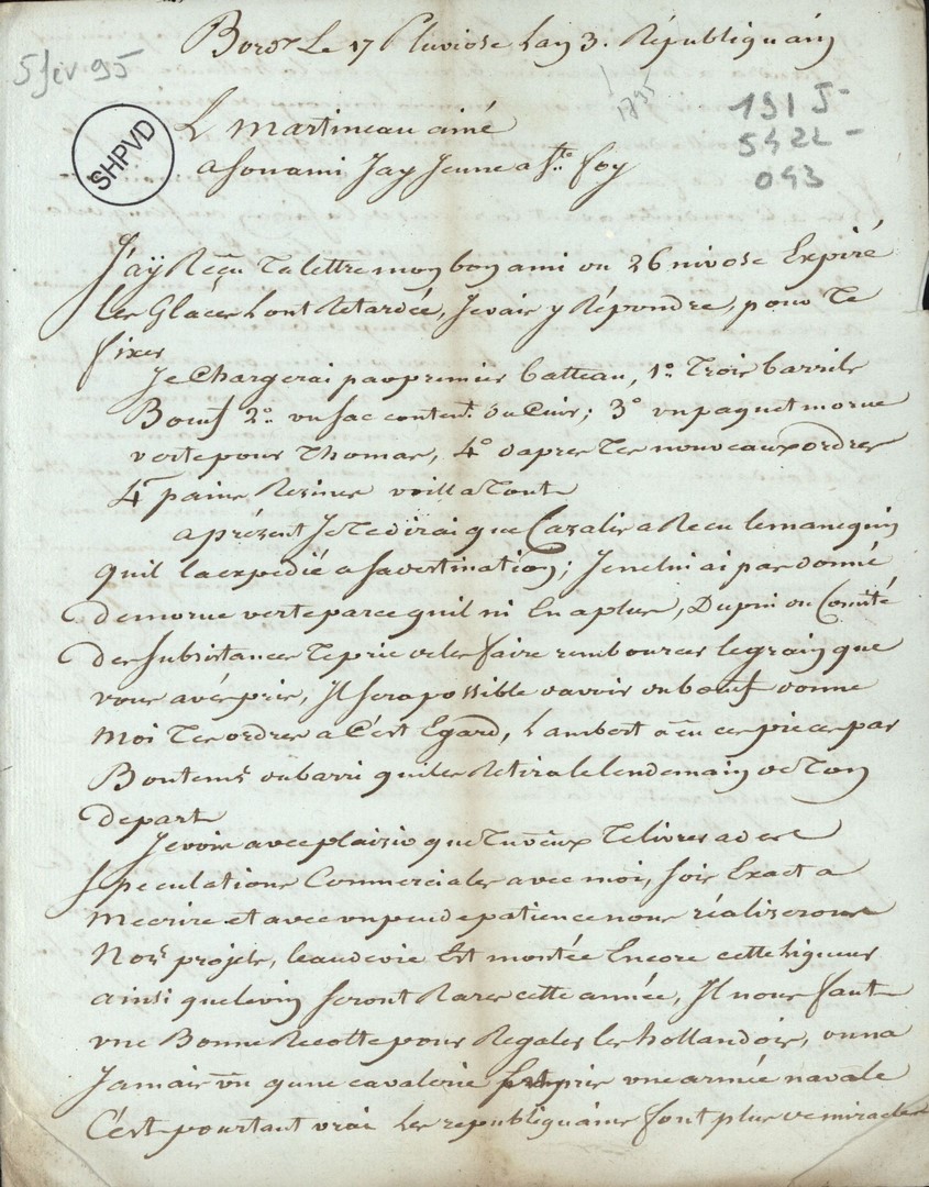 Cote du document: SHPVD-BN-191J-5422-043-00-00-00Lettre de Martineau aîné, Bordeaux, à Jay jeune, Sainte Foy, 17 pluviôse an 3