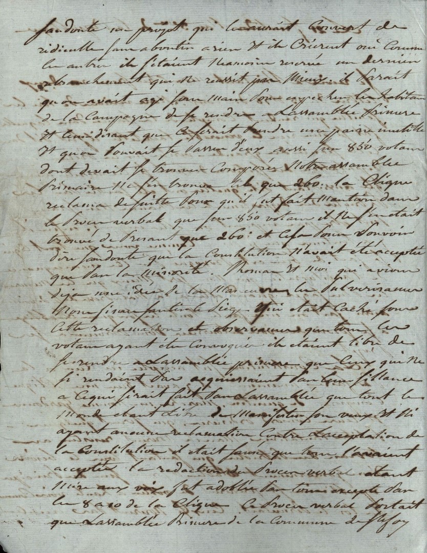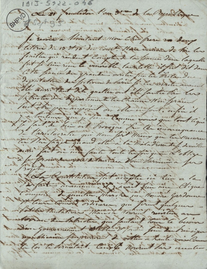 Cote du document: SHPVD-BN-191J-5422-046-00-00-00Lettre de Jay Jeune (Delile), à Jean Jay, Député à Paris, 21 fructidor an 3