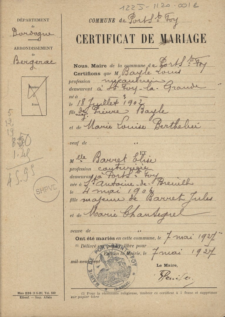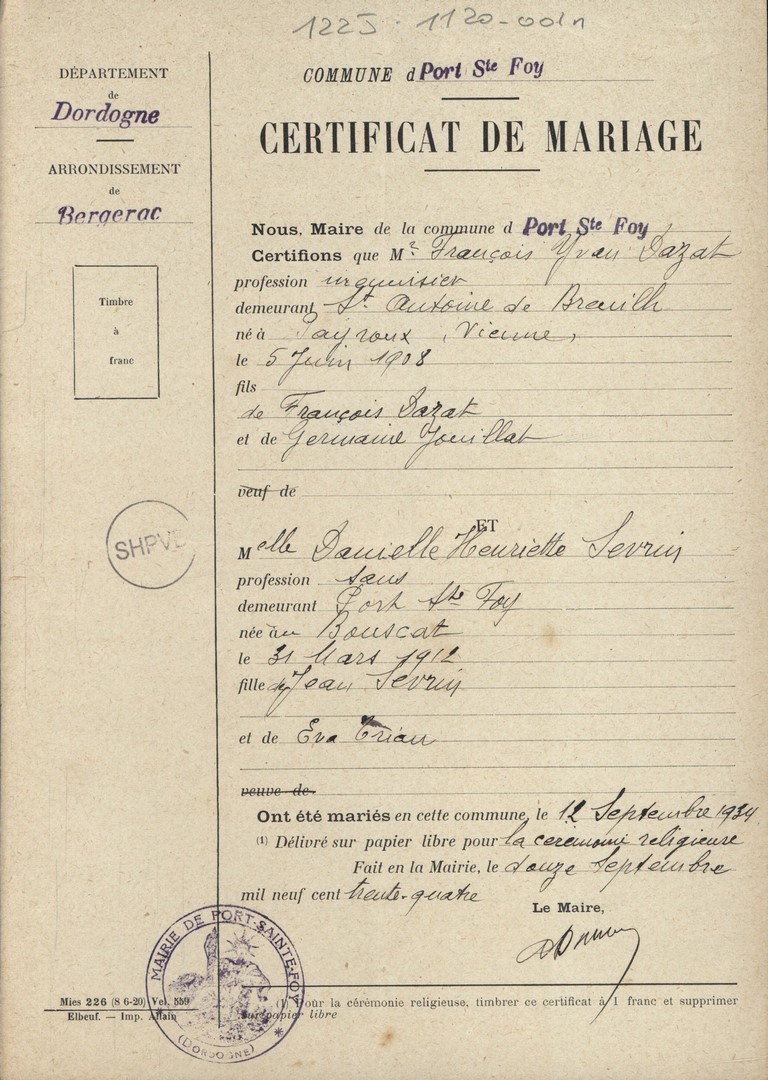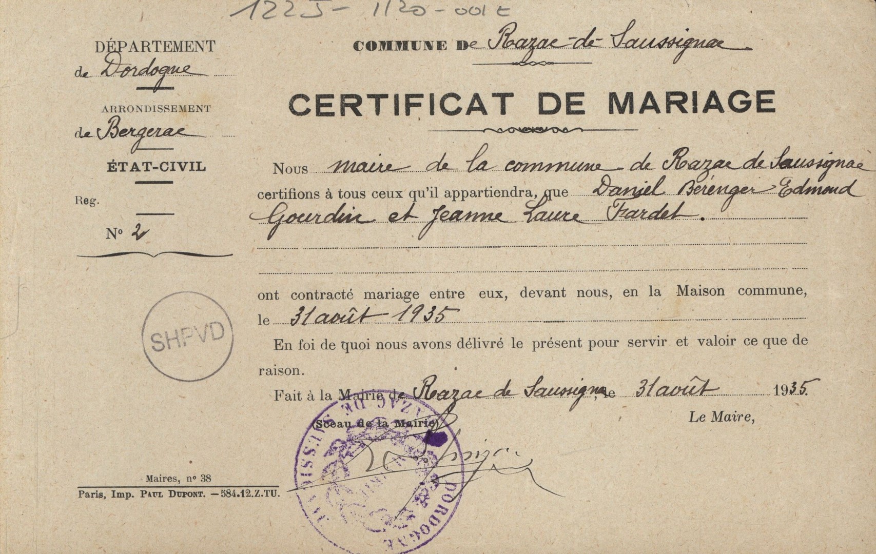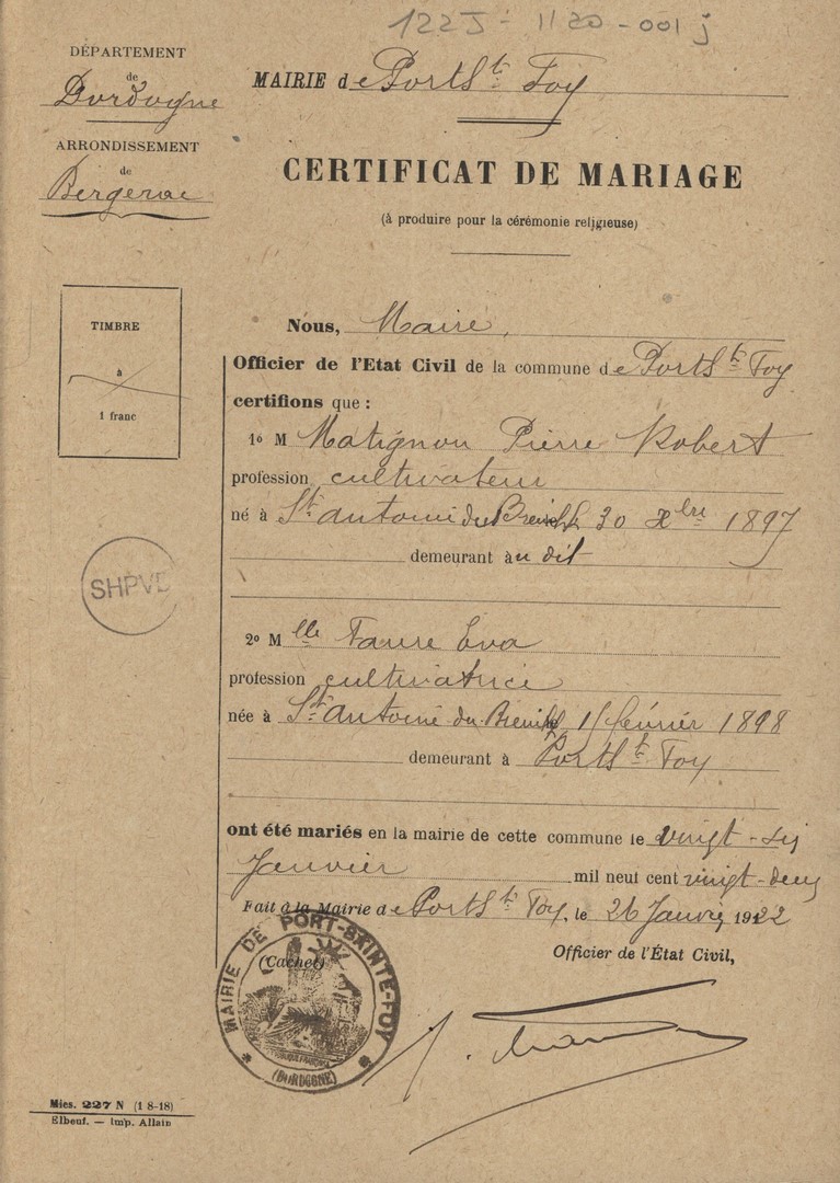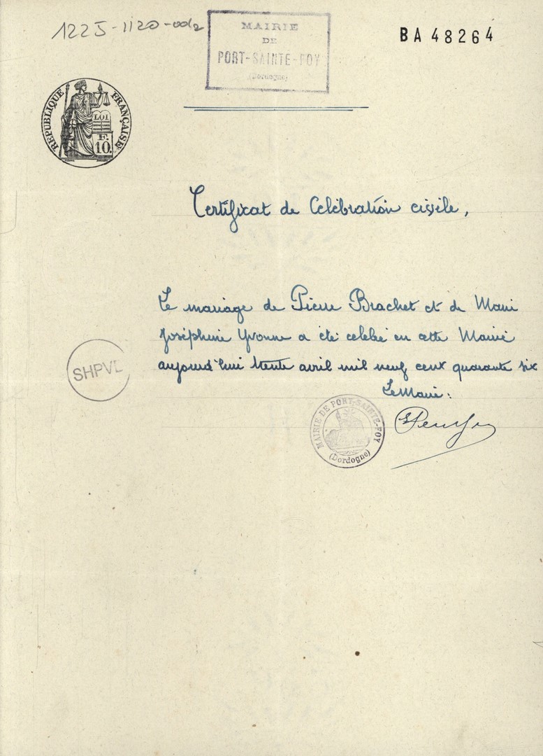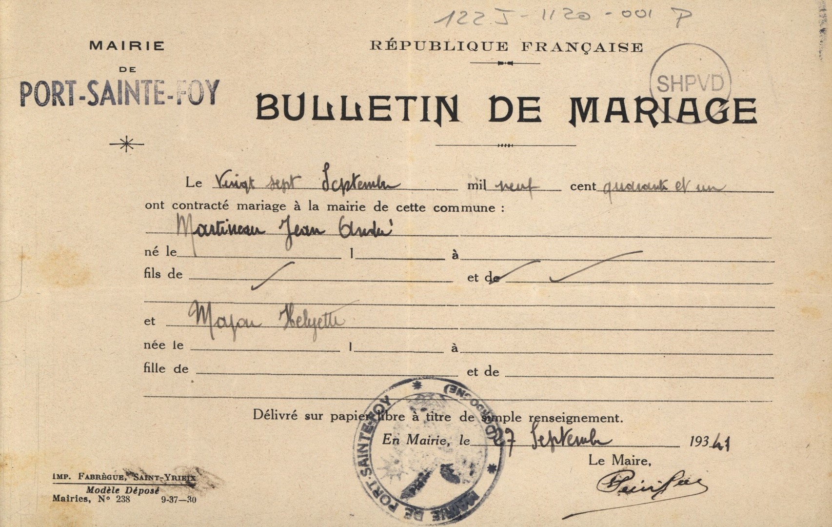 23 Bulletins de mariage civil. 1920-1950. Corrèze (1, 1942), le Fleix (1, 1947),Fougueyrolles (2, 1930), Pineuilh (1, 1927), Port-Ste-Foy (14, 1920 à 1950), Razac-de-Saussignac (1, 1935), St-Méard-de-Gurçon (2, 1930), St-Rémy (1, 1927). A noter: le mariage célébré en Corrèze est celui d'Olivier Hatzfeld habitant Port-Ste-Foy avec une jeune fille de Versailles, en 1942. Zone libre? + formulaire de certificat de mariage religieux (vierge), années 1900. (2 ex.)