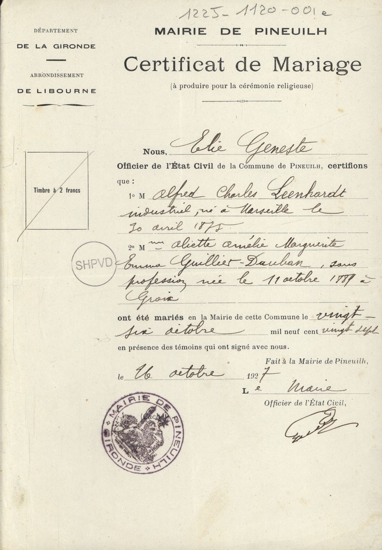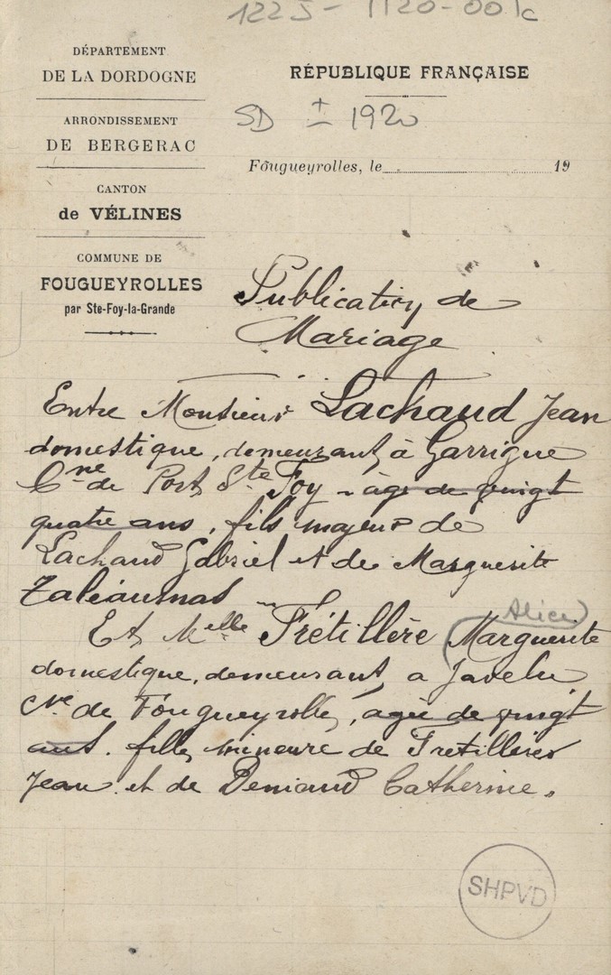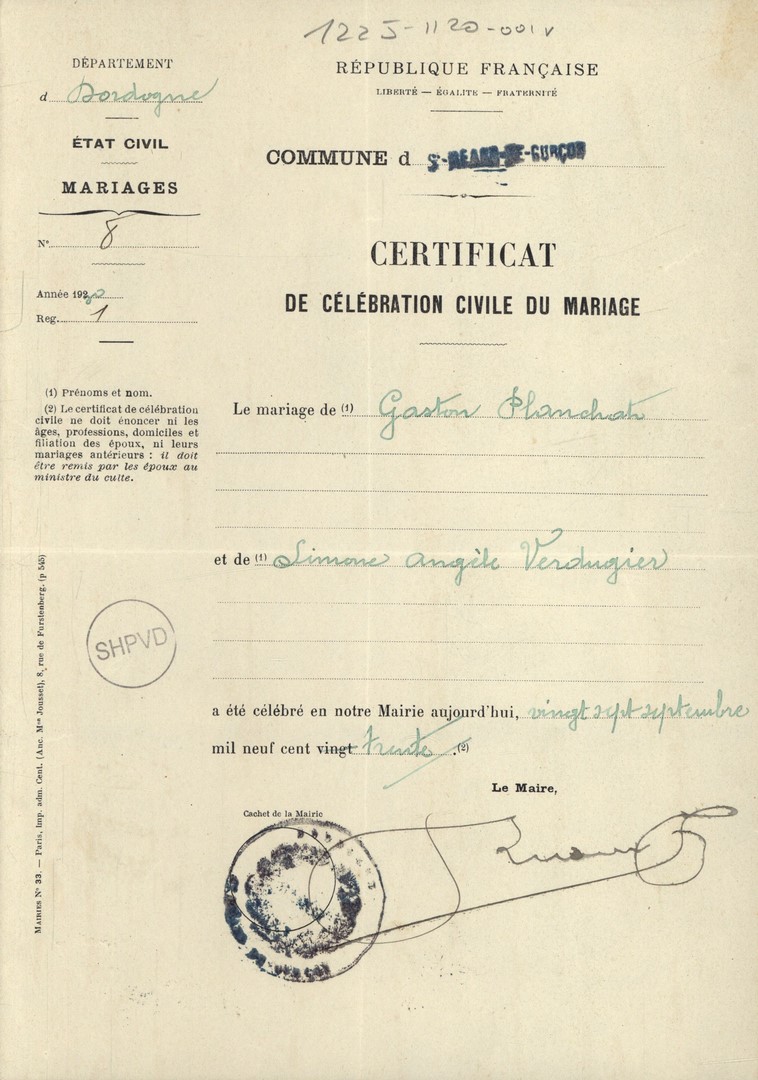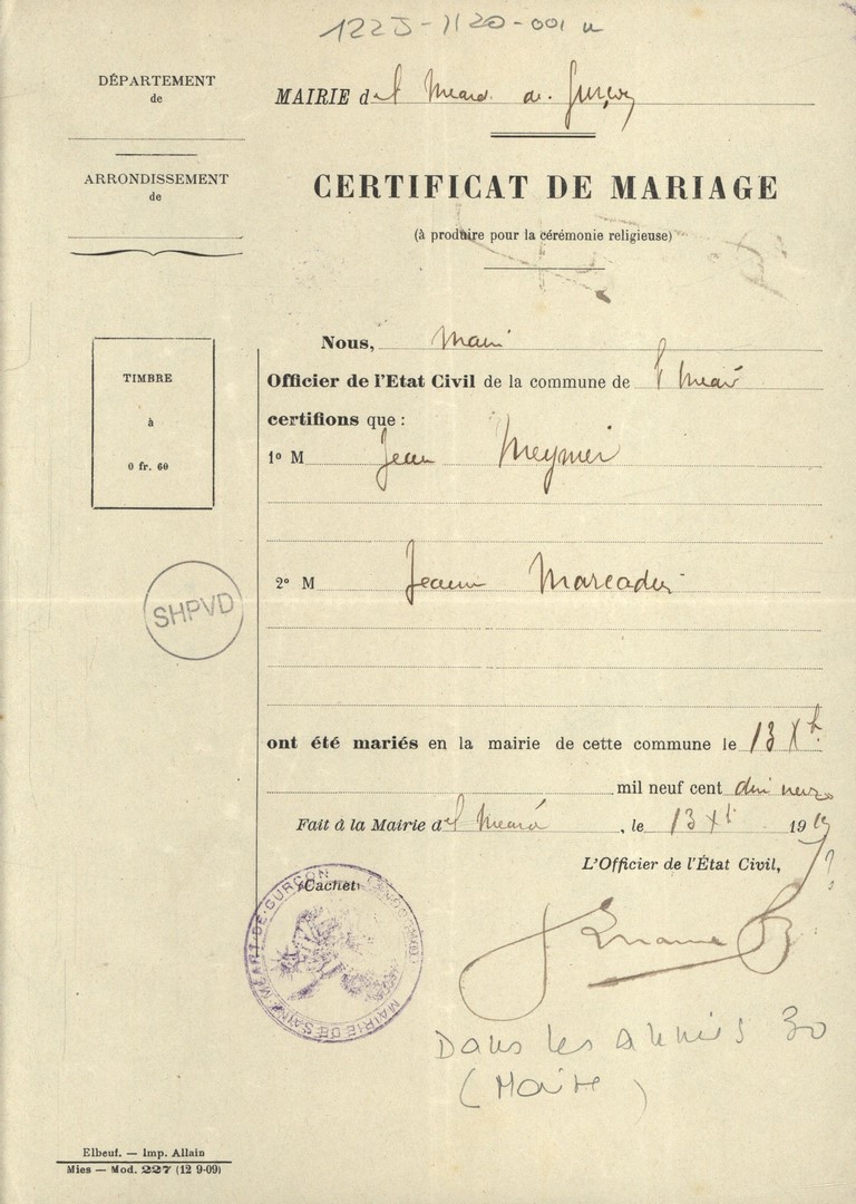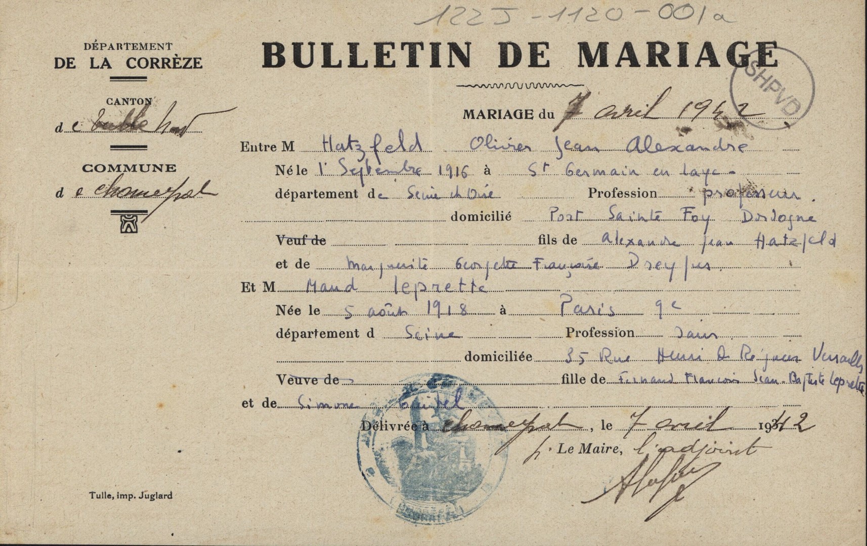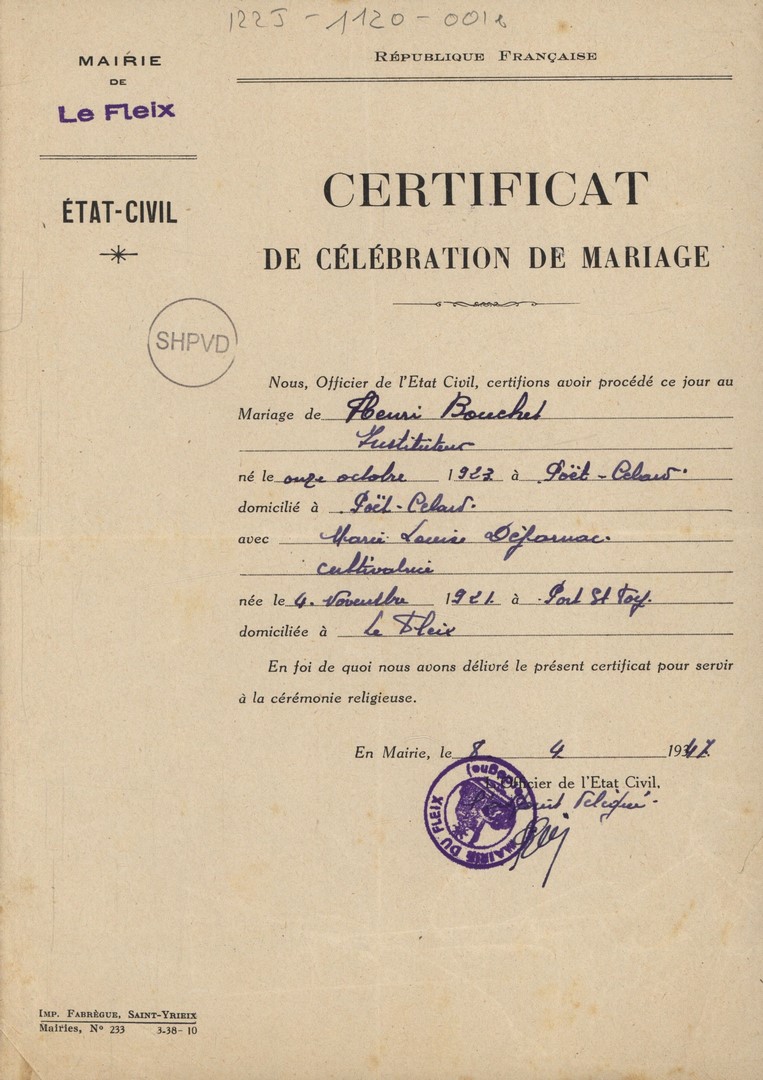 23 Bulletins de mariage civil. 1920-1950. Corrèze (1, 1942), le Fleix (1, 1947),Fougueyrolles (2, 1930), Pineuilh (1, 1927), Port-Ste-Foy (14, 1920 à 1950), Razac-de-Saussignac (1, 1935), St-Méard-de-Gurçon (2, 1930), St-Rémy (1, 1927). A noter: le mariage célébré en Corrèze est celui d'Olivier Hatzfeld habitant Port-Ste-Foy avec une jeune fille de Versailles, en 1942. Zone libre? + formulaire de certificat de mariage religieux (vierge), années 1900. (2 ex.)