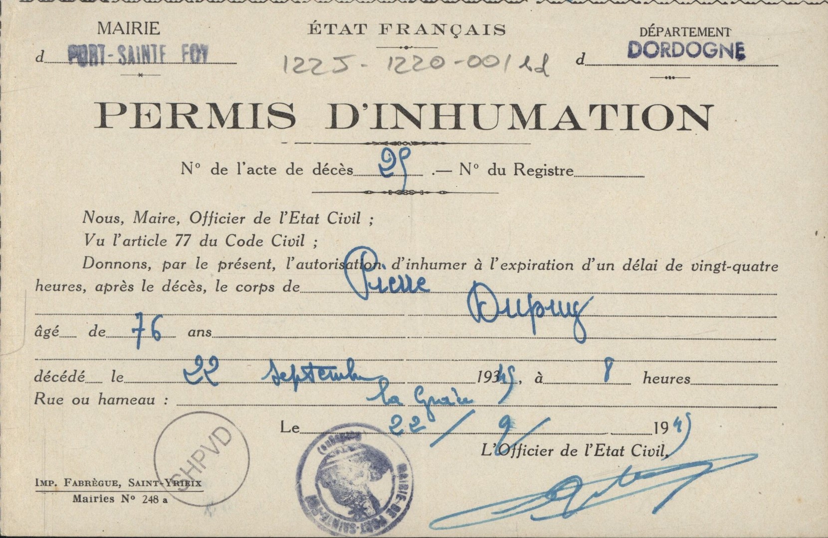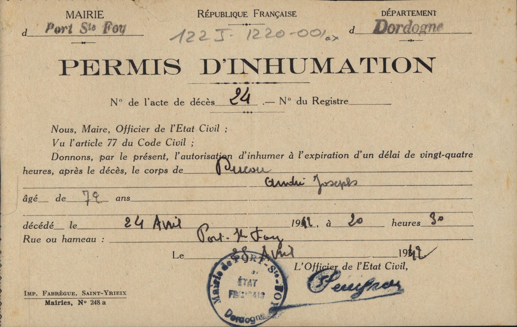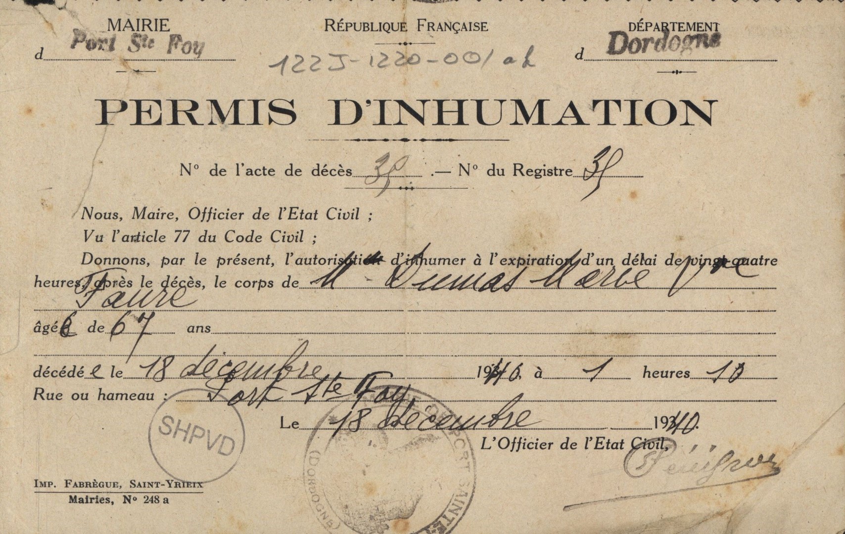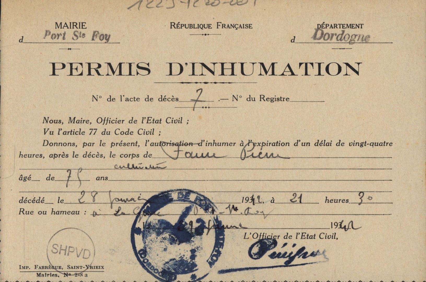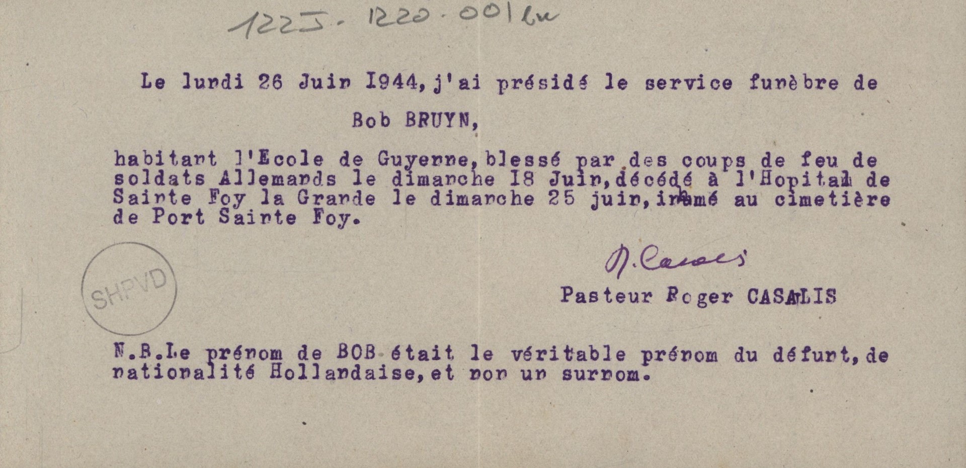 75 Permis d'inhumer 1922-1946 Charente (1939,1), Gironde (1925, 1), Bergerac (1939,1), Fougueyrolles (1924,1), Montcaret (1922, 1), Mussidan (1941, 1), Port-Ste-Foy (1922-1946, 60), St-Antoine-de-Breuil (1925-1942, 3), St-Méard-de-Gurçon (1924-1940, 4), Ste-Foy-la-Grande (1942-1945, 2) + "le lundi 26 juin 1944, j'ai présidé le service funèbre de Bob BRUYN, habitant l'École de Guyenne, blessé par des coups de feu de soldats allemands [...] inhumé au cimetière de Port-Ste-Foy. Pasteur Roger CASALIS. NB: le prénom de Bob était le véritable prénom du défunt, de nationalité hollandaise, et non un surnom."