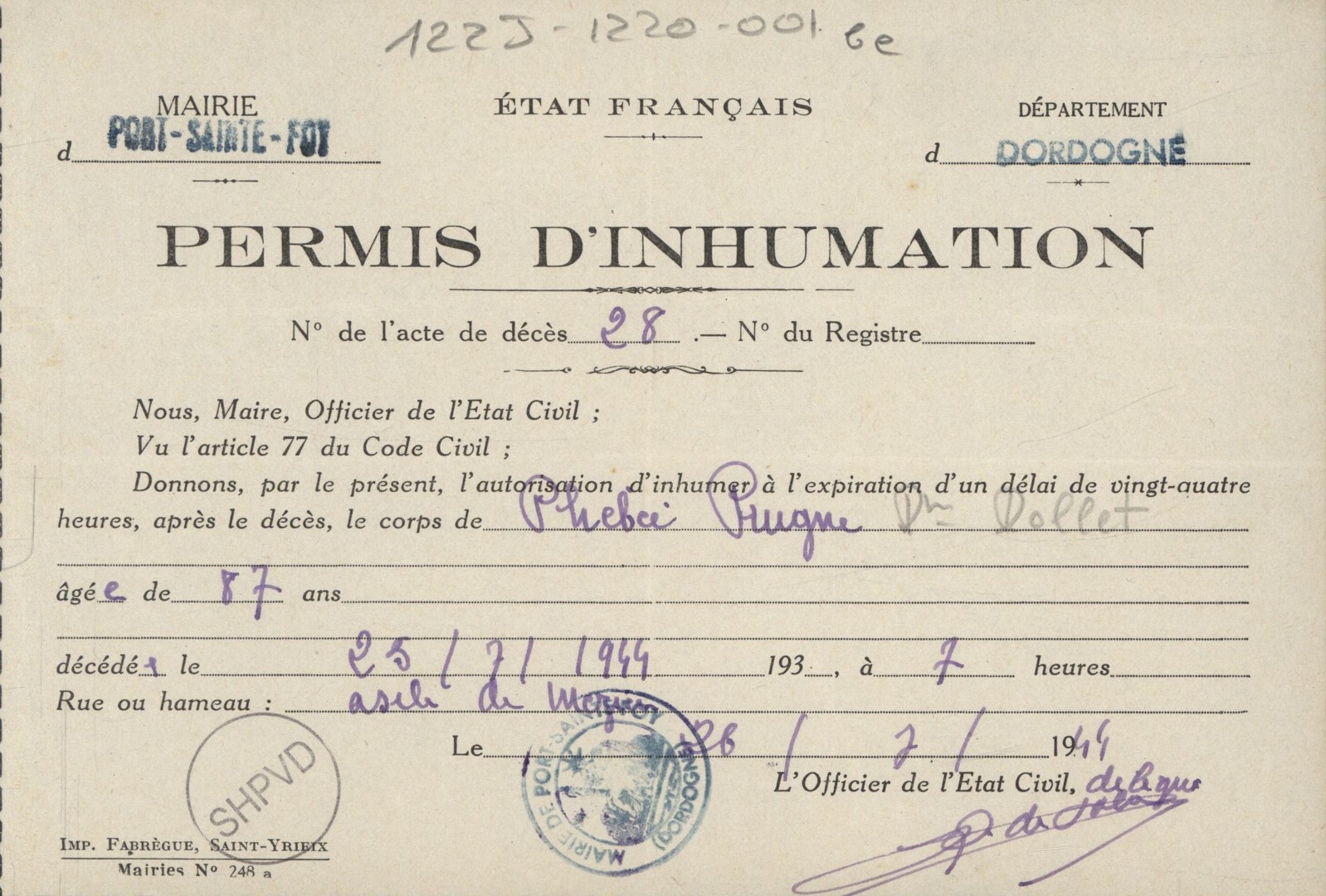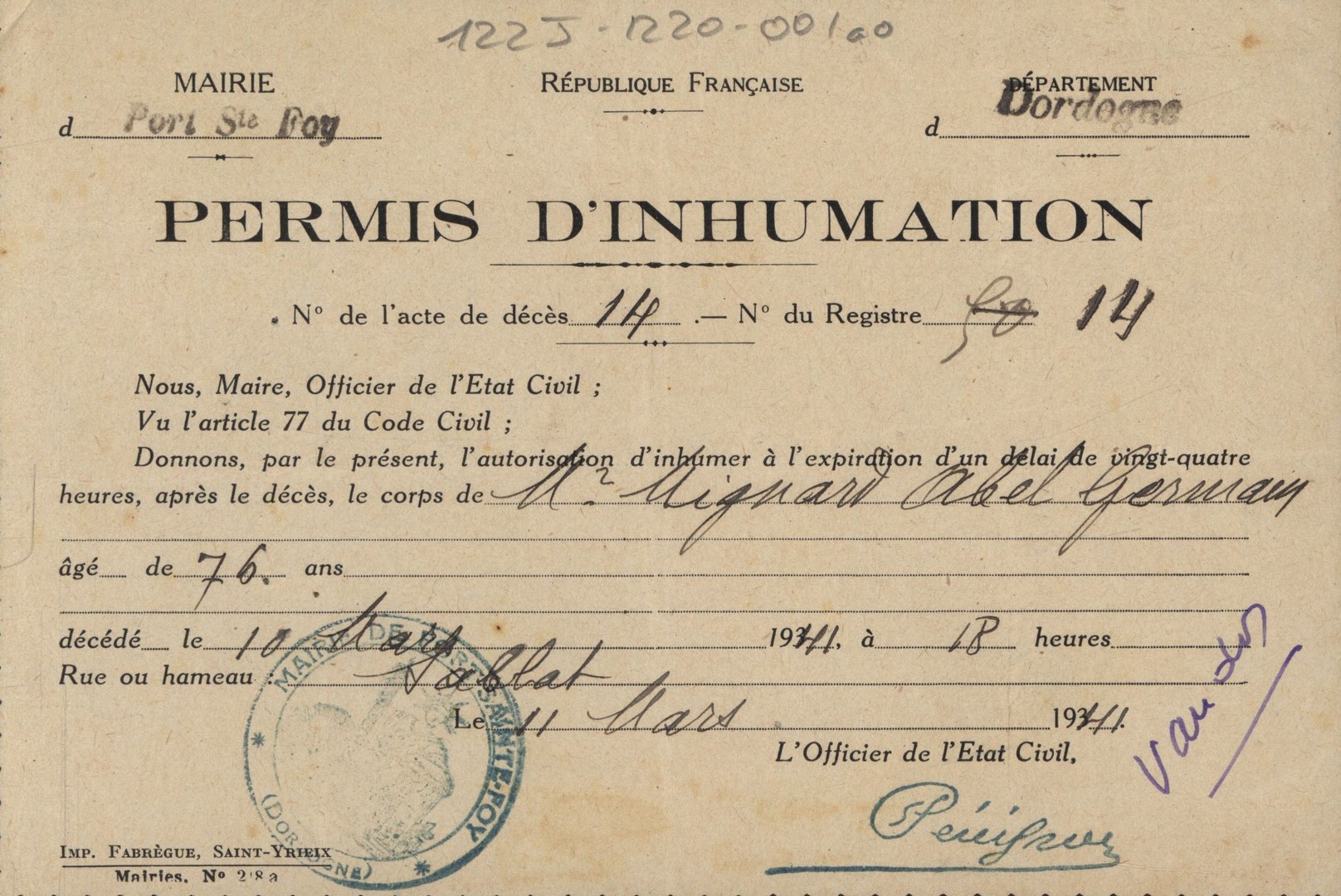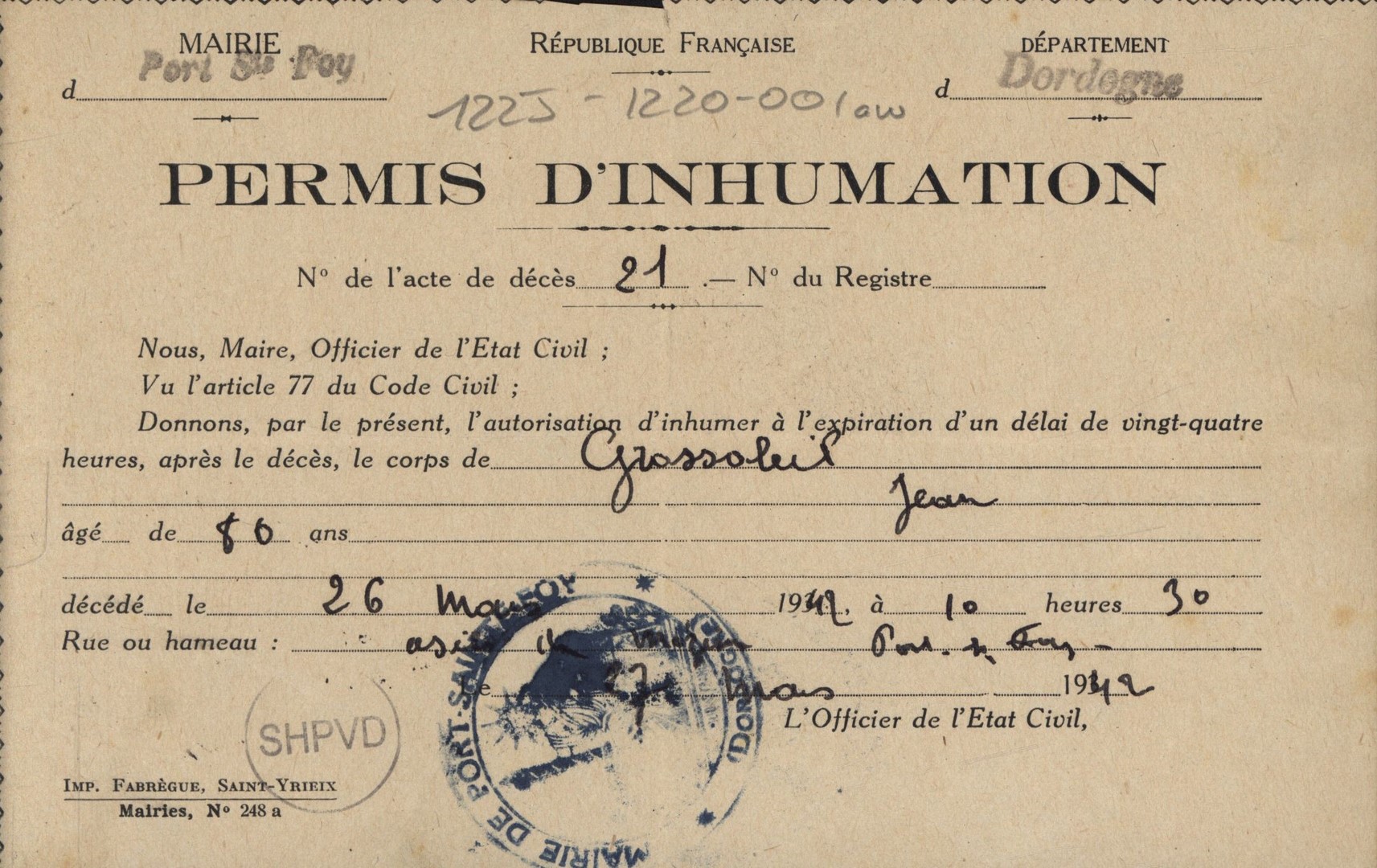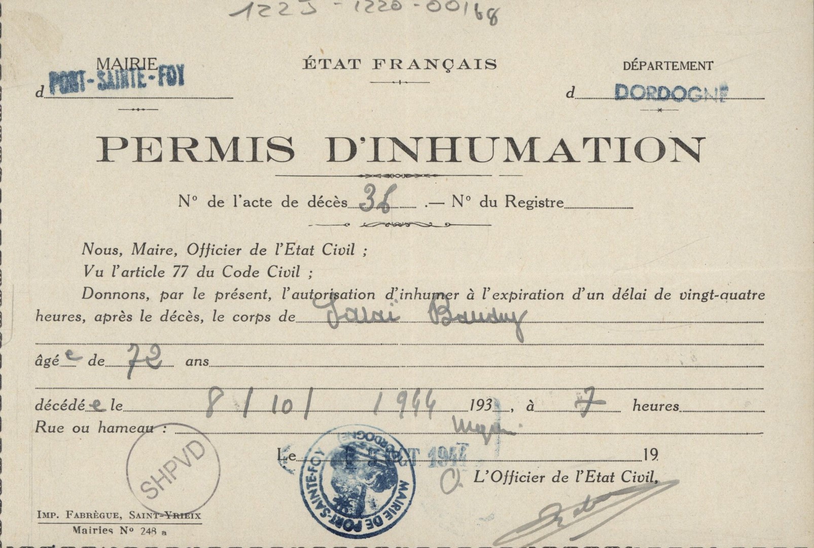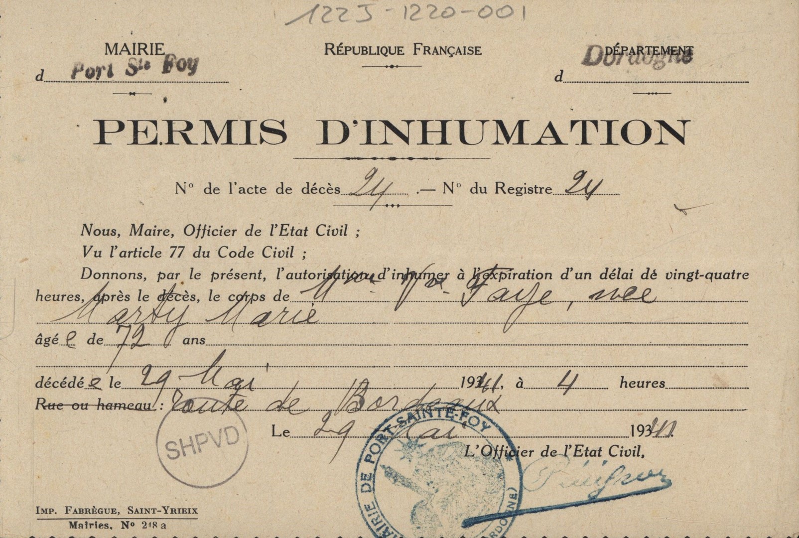 75 Permis d'inhumer 1922-1946 Charente (1939,1), Gironde (1925, 1), Bergerac (1939,1), Fougueyrolles (1924,1), Montcaret (1922, 1), Mussidan (1941, 1), Port-Ste-Foy (1922-1946, 60), St-Antoine-de-Breuil (1925-1942, 3), St-Méard-de-Gurçon (1924-1940, 4), Ste-Foy-la-Grande (1942-1945, 2) + "le lundi 26 juin 1944, j'ai présidé le service funèbre de Bob BRUYN, habitant l'École de Guyenne, blessé par des coups de feu de soldats allemands [...] inhumé au cimetière de Port-Ste-Foy. Pasteur Roger CASALIS. NB: le prénom de Bob était le véritable prénom du défunt, de nationalité hollandaise, et non un surnom."