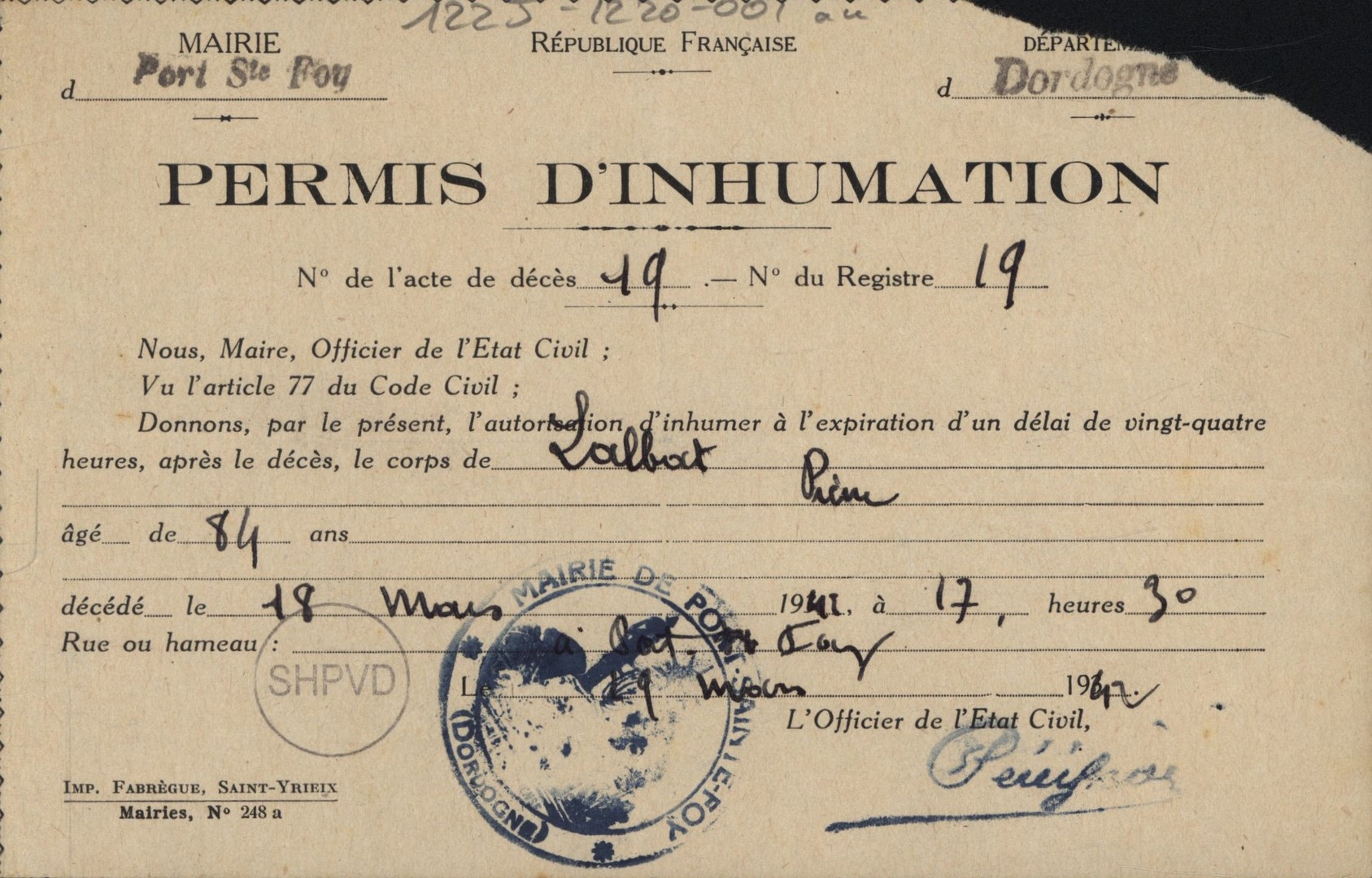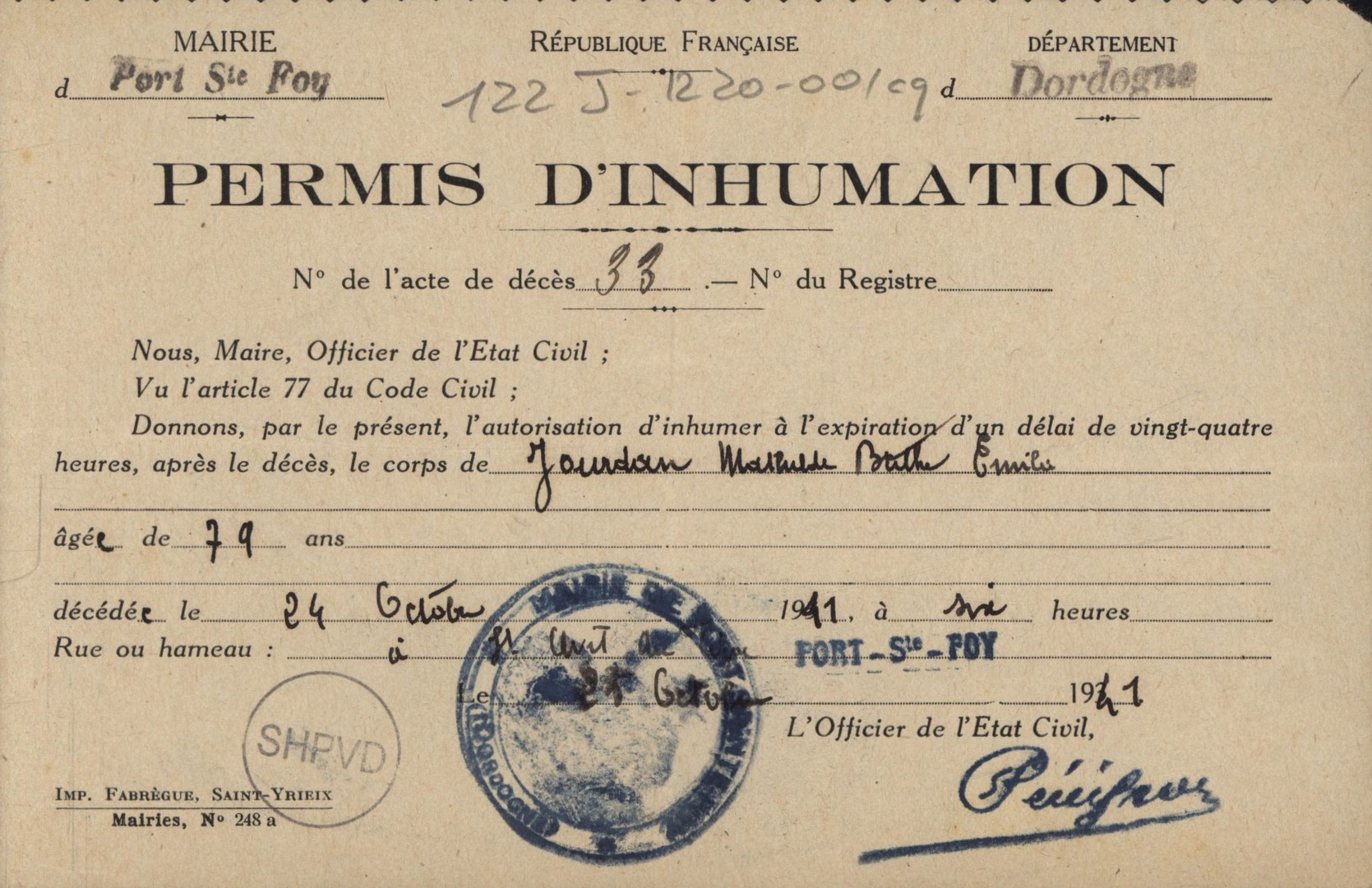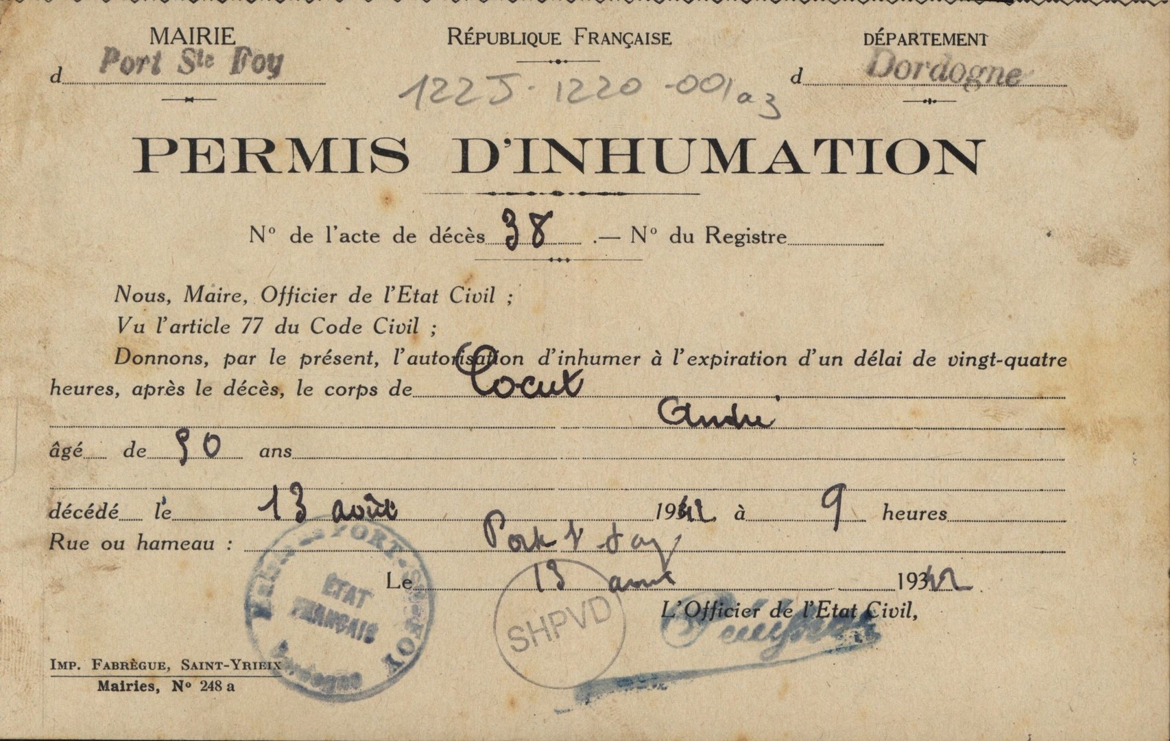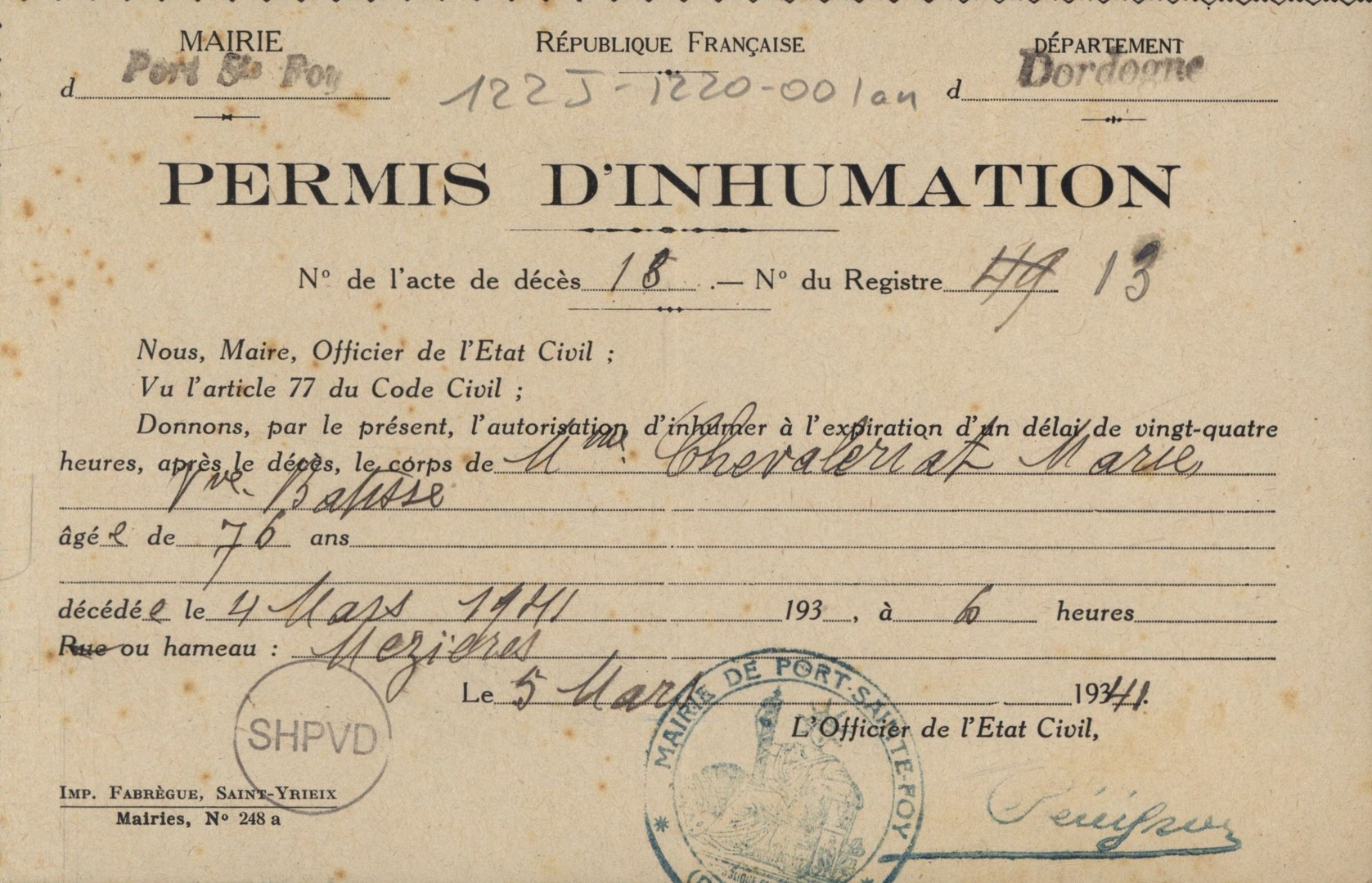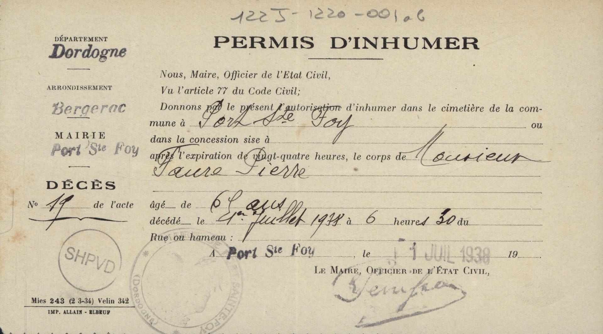 75 Permis d'inhumer 1922-1946 Charente (1939,1), Gironde (1925, 1), Bergerac (1939,1), Fougueyrolles (1924,1), Montcaret (1922, 1), Mussidan (1941, 1), Port-Ste-Foy (1922-1946, 60), St-Antoine-de-Breuil (1925-1942, 3), St-Méard-de-Gurçon (1924-1940, 4), Ste-Foy-la-Grande (1942-1945, 2) + "le lundi 26 juin 1944, j'ai présidé le service funèbre de Bob BRUYN, habitant l'École de Guyenne, blessé par des coups de feu de soldats allemands [...] inhumé au cimetière de Port-Ste-Foy. Pasteur Roger CASALIS. NB: le prénom de Bob était le véritable prénom du défunt, de nationalité hollandaise, et non un surnom."