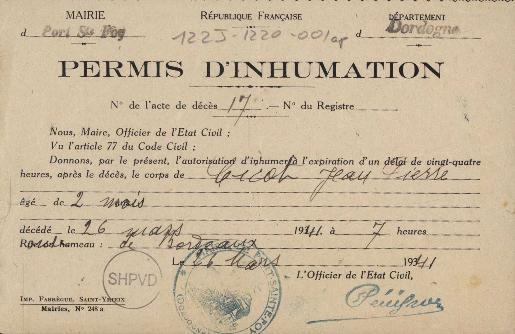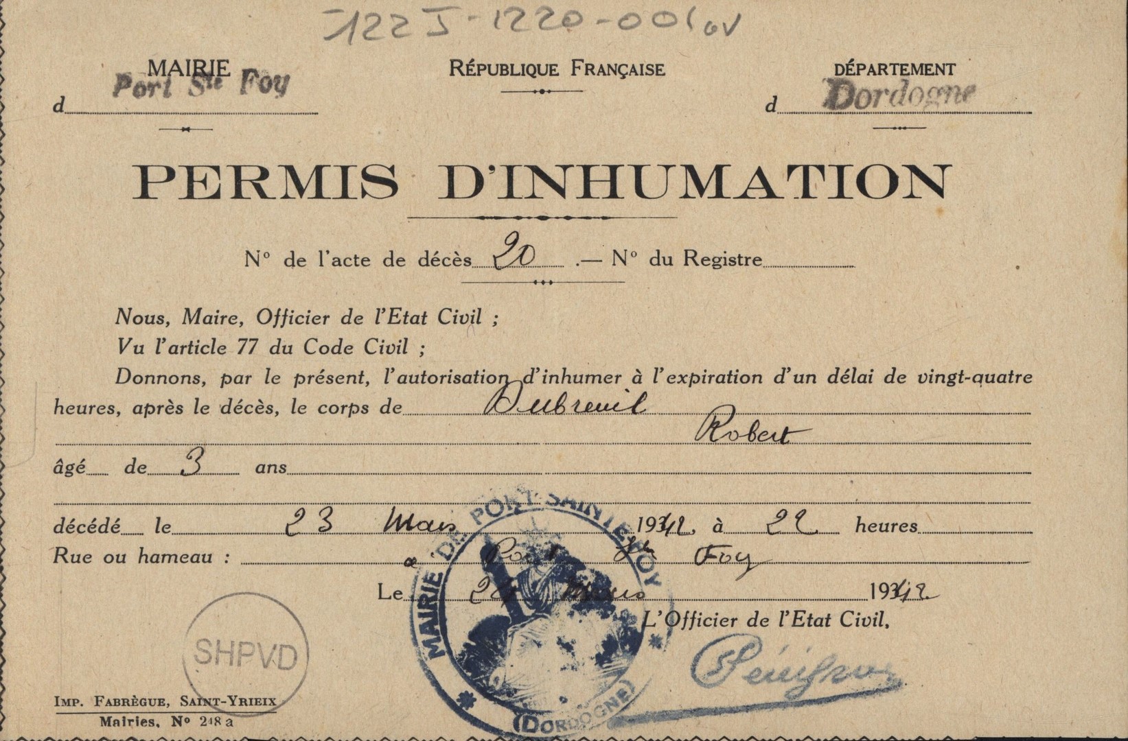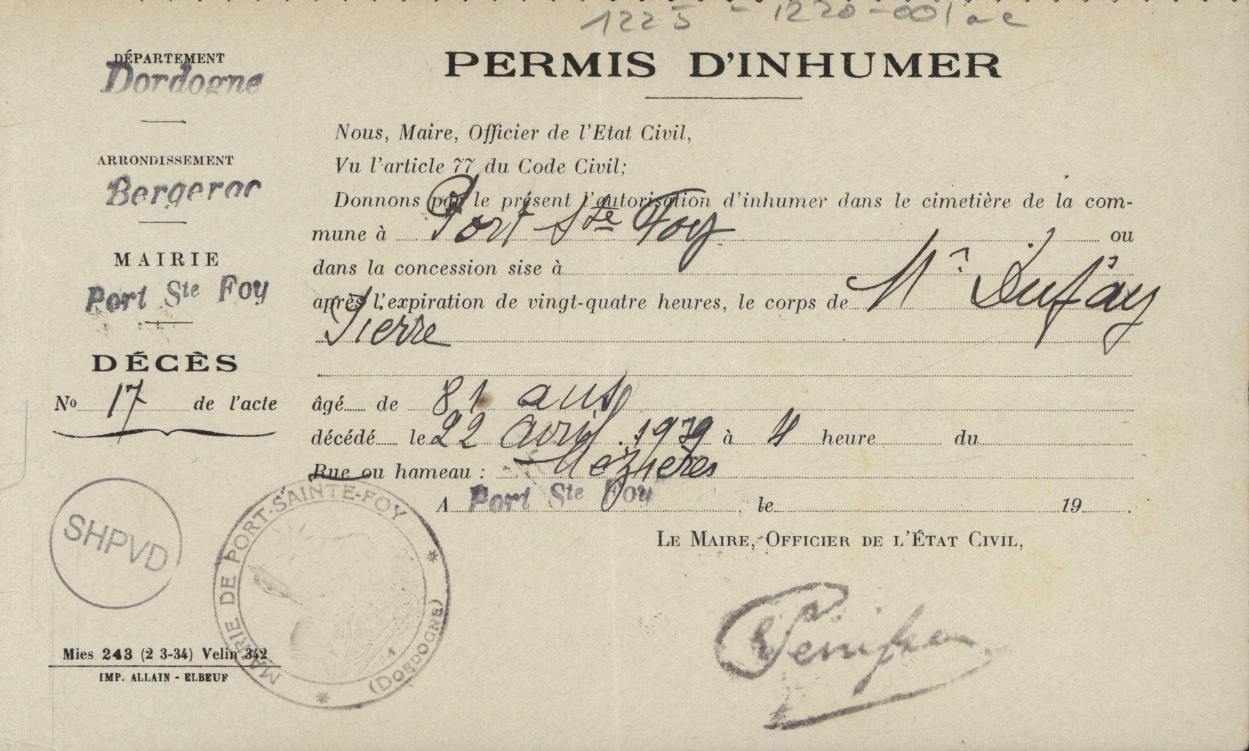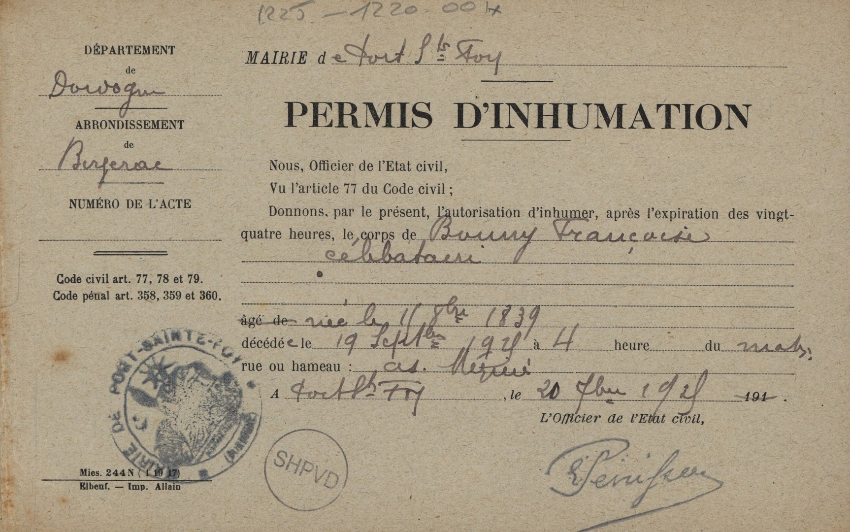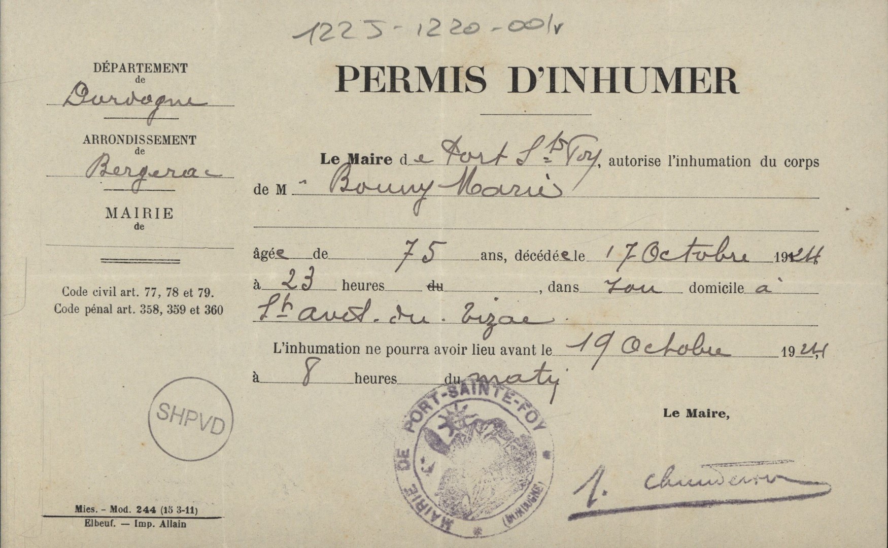 75 Permis d'inhumer 1922-1946 Charente (1939,1), Gironde (1925, 1), Bergerac (1939,1), Fougueyrolles (1924,1), Montcaret (1922, 1), Mussidan (1941, 1), Port-Ste-Foy (1922-1946, 60), St-Antoine-de-Breuil (1925-1942, 3), St-Méard-de-Gurçon (1924-1940, 4), Ste-Foy-la-Grande (1942-1945, 2) + "le lundi 26 juin 1944, j'ai présidé le service funèbre de Bob BRUYN, habitant l'École de Guyenne, blessé par des coups de feu de soldats allemands [...] inhumé au cimetière de Port-Ste-Foy. Pasteur Roger CASALIS. NB: le prénom de Bob était le véritable prénom du défunt, de nationalité hollandaise, et non un surnom."