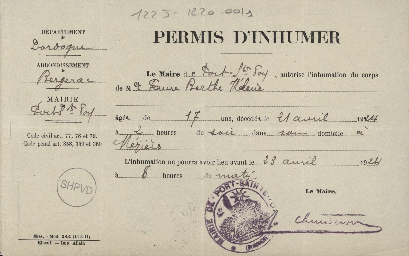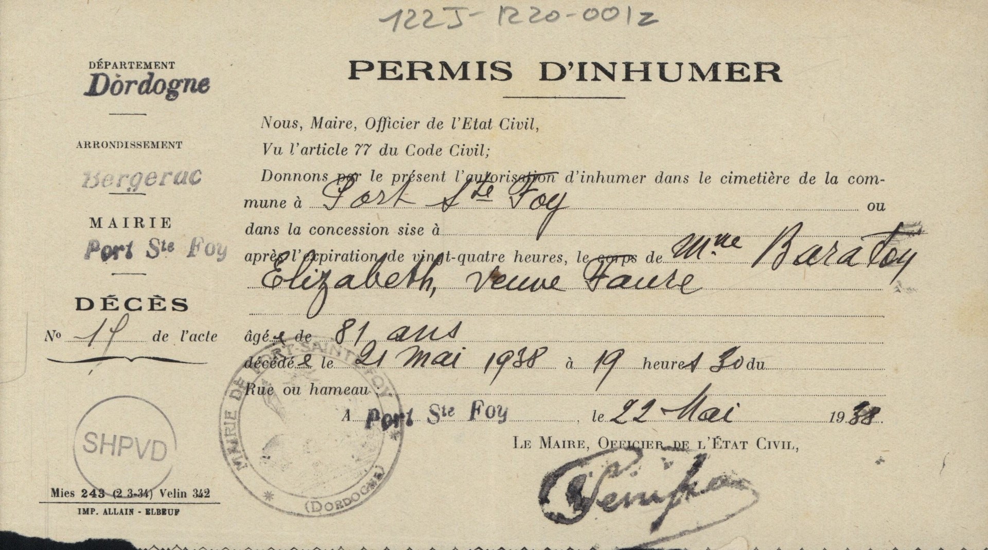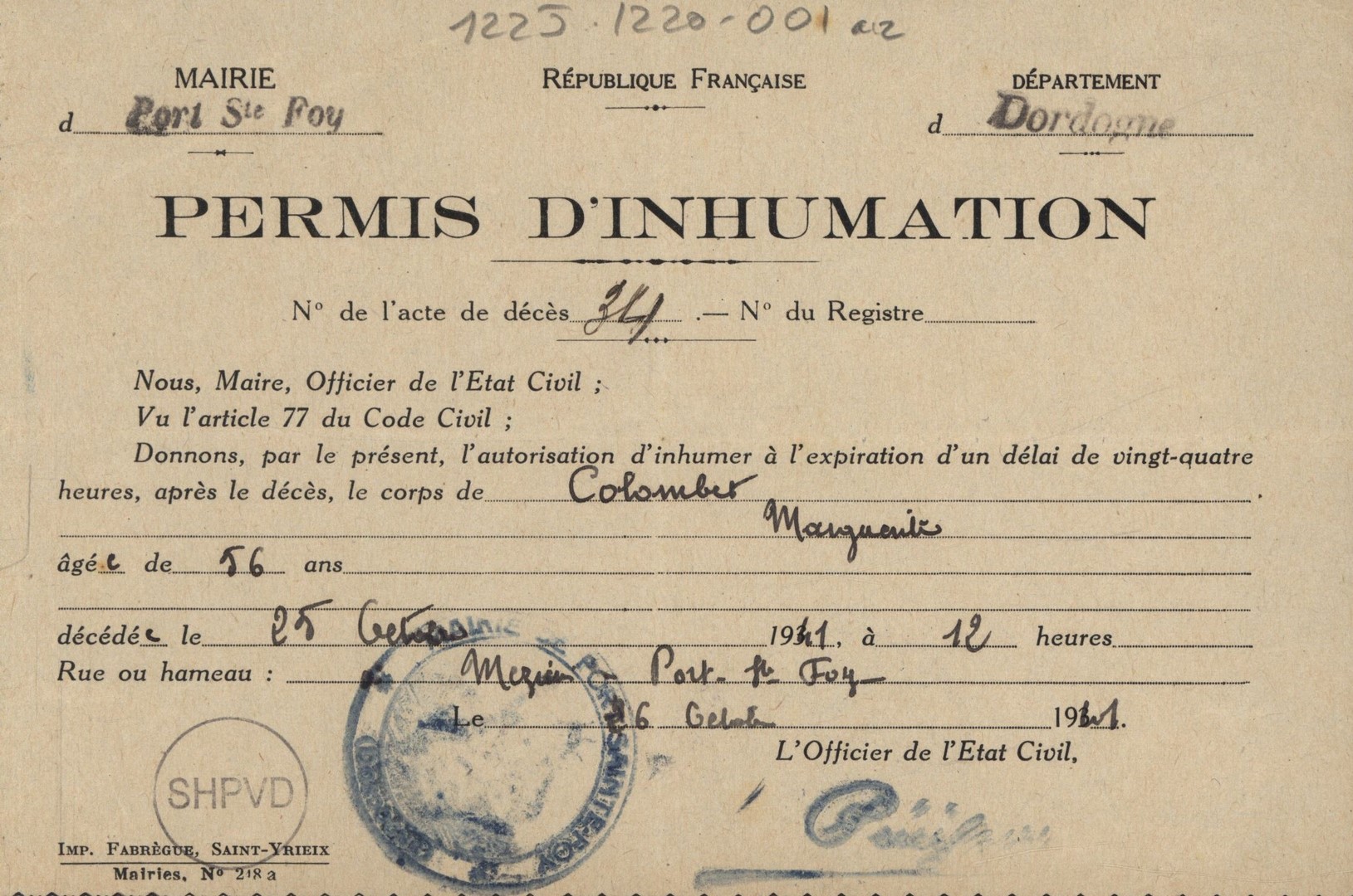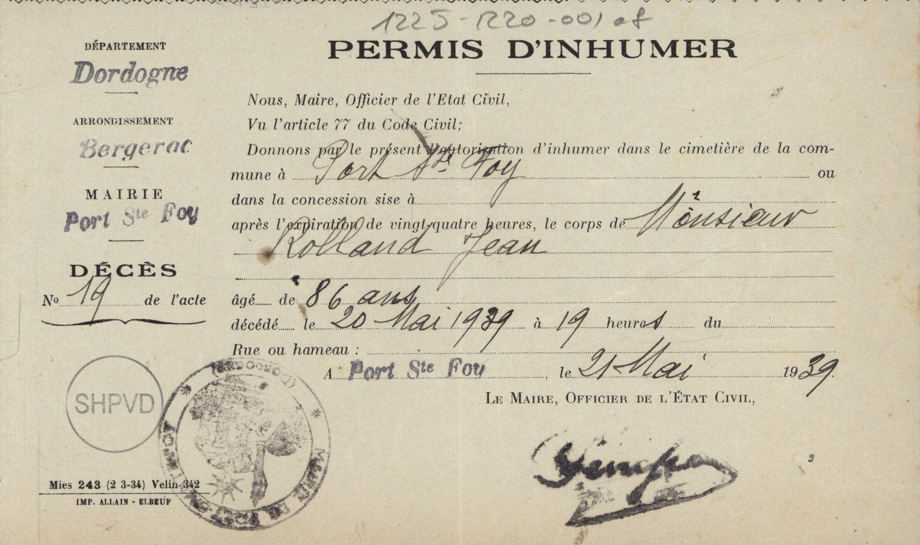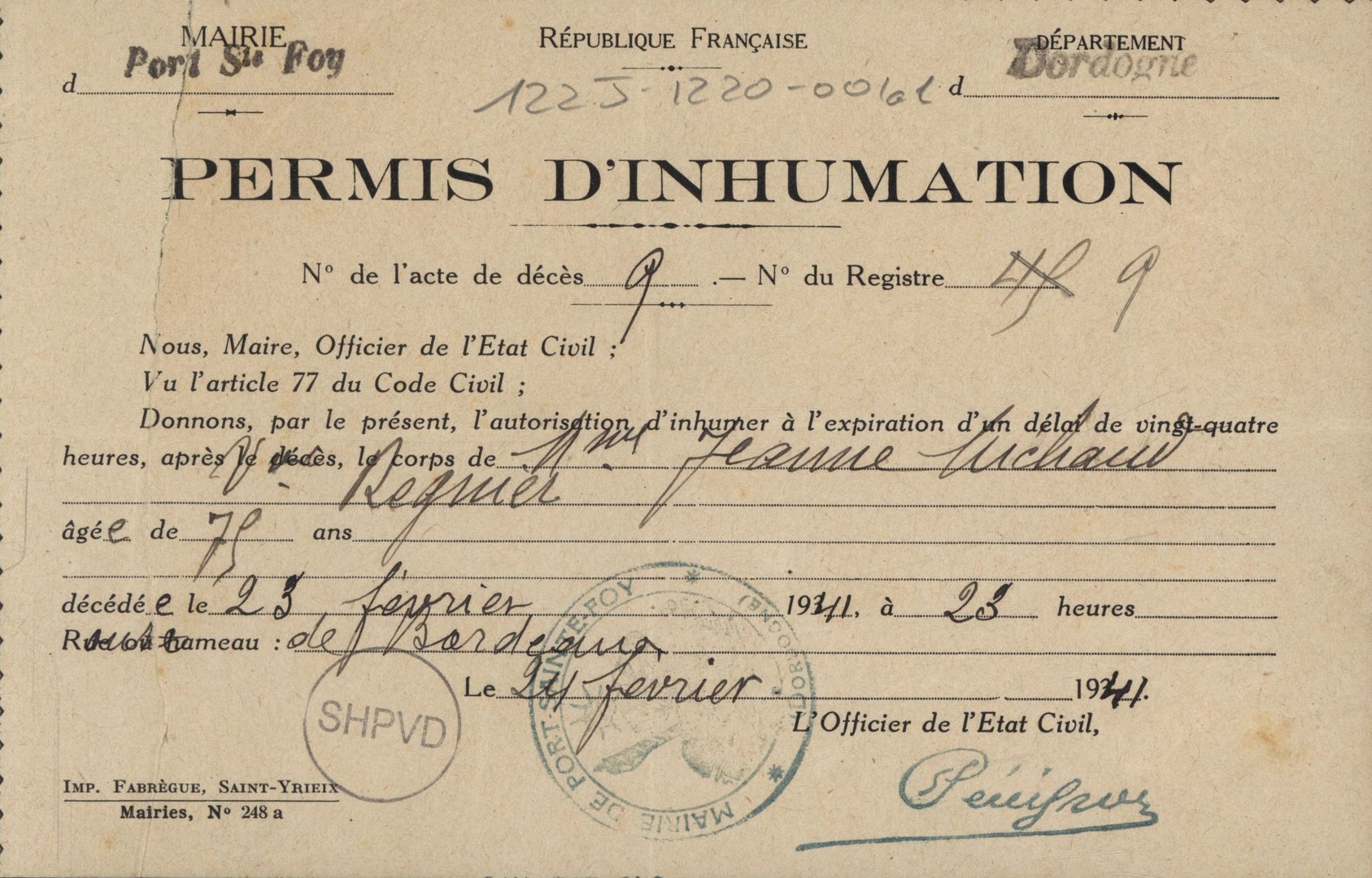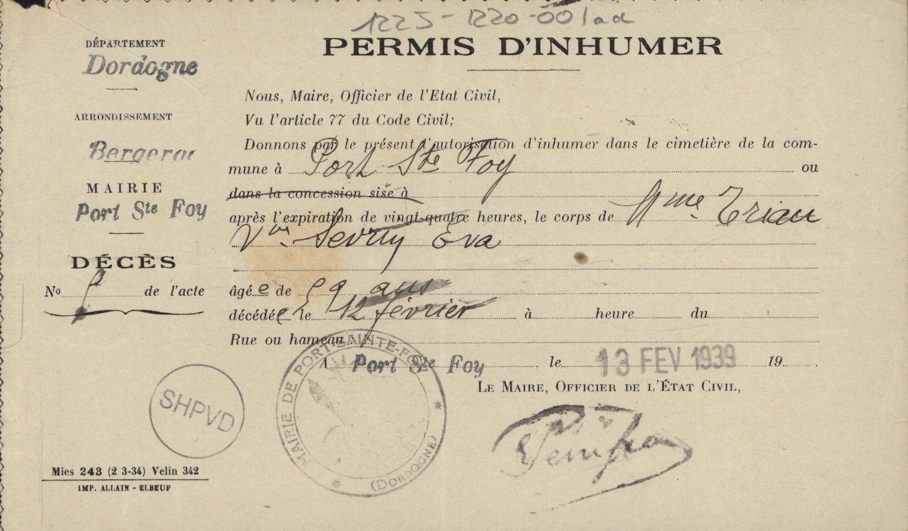 75 Permis d'inhumer 1922-1946 Charente (1939,1), Gironde (1925, 1), Bergerac (1939,1), Fougueyrolles (1924,1), Montcaret (1922, 1), Mussidan (1941, 1), Port-Ste-Foy (1922-1946, 60), St-Antoine-de-Breuil (1925-1942, 3), St-Méard-de-Gurçon (1924-1940, 4), Ste-Foy-la-Grande (1942-1945, 2) + "le lundi 26 juin 1944, j'ai présidé le service funèbre de Bob BRUYN, habitant l'École de Guyenne, blessé par des coups de feu de soldats allemands [...] inhumé au cimetière de Port-Ste-Foy. Pasteur Roger CASALIS. NB: le prénom de Bob était le véritable prénom du défunt, de nationalité hollandaise, et non un surnom."