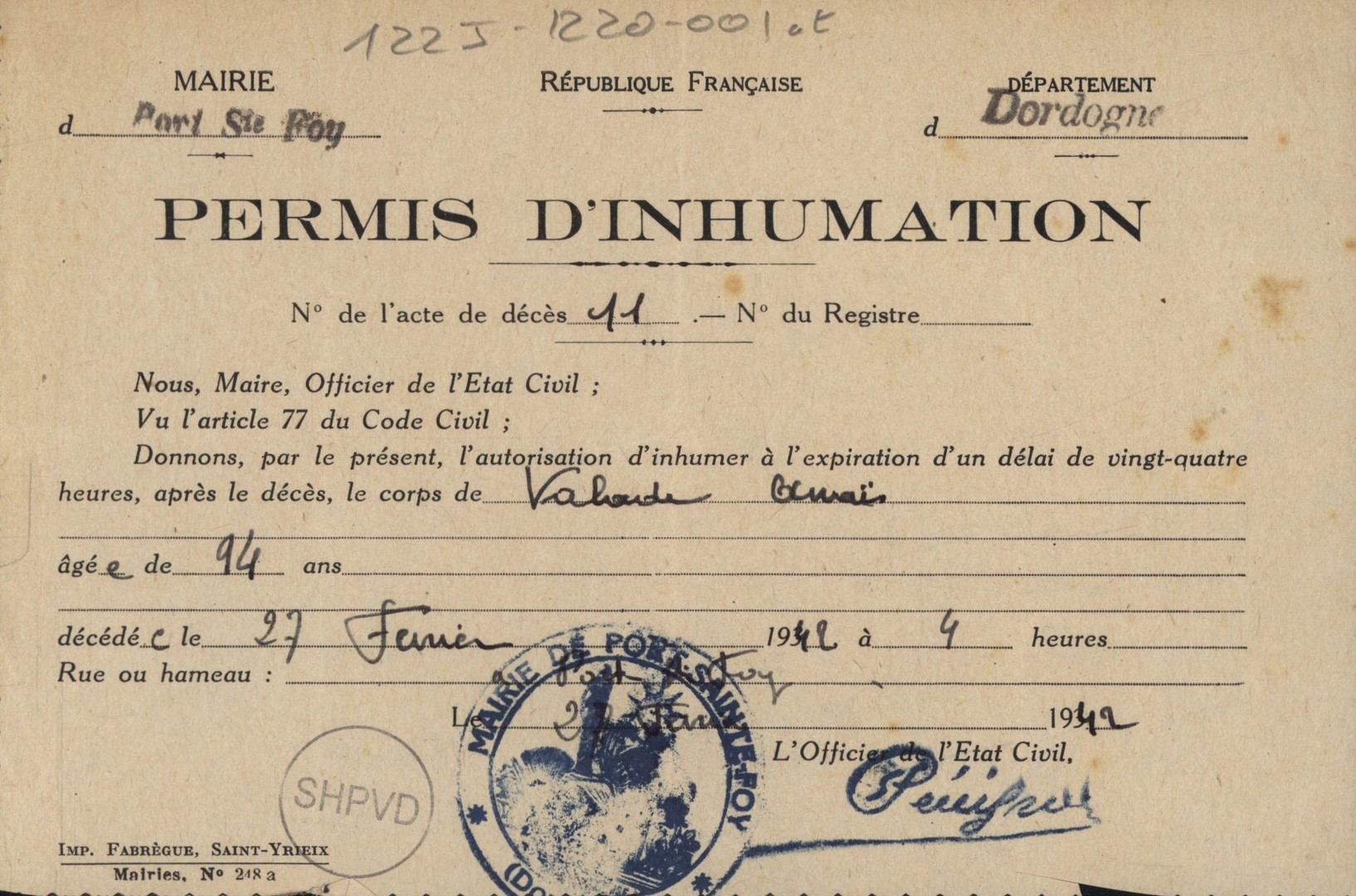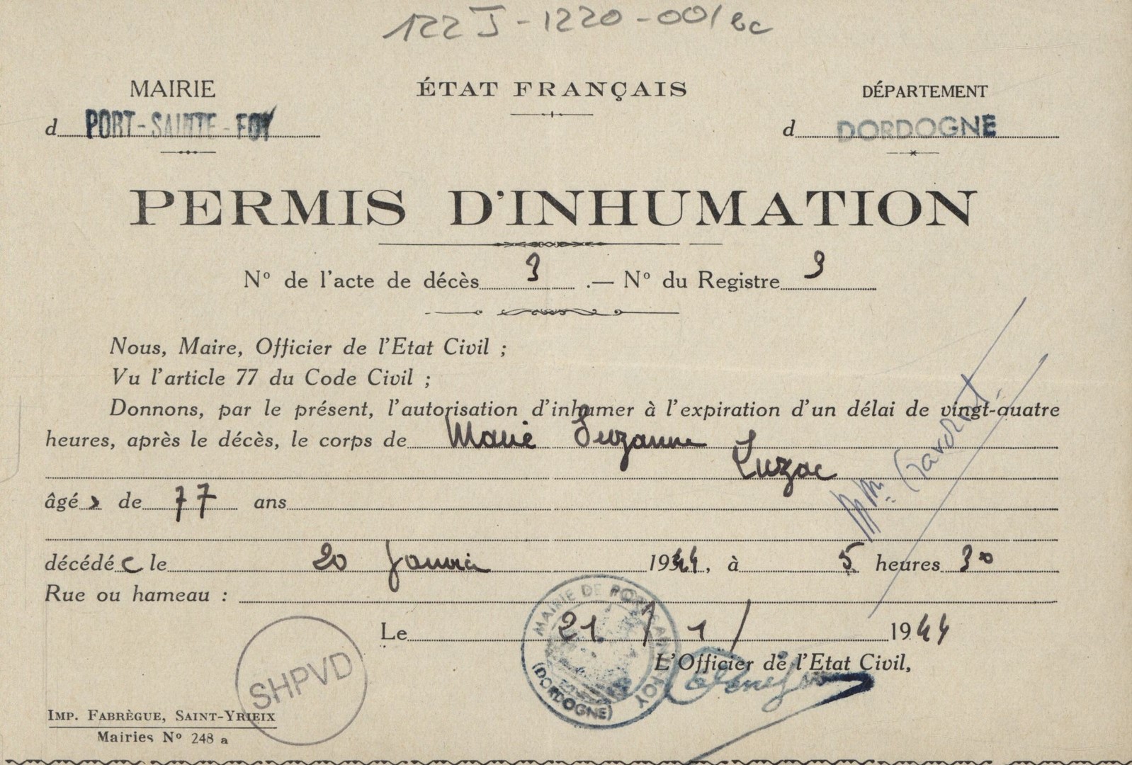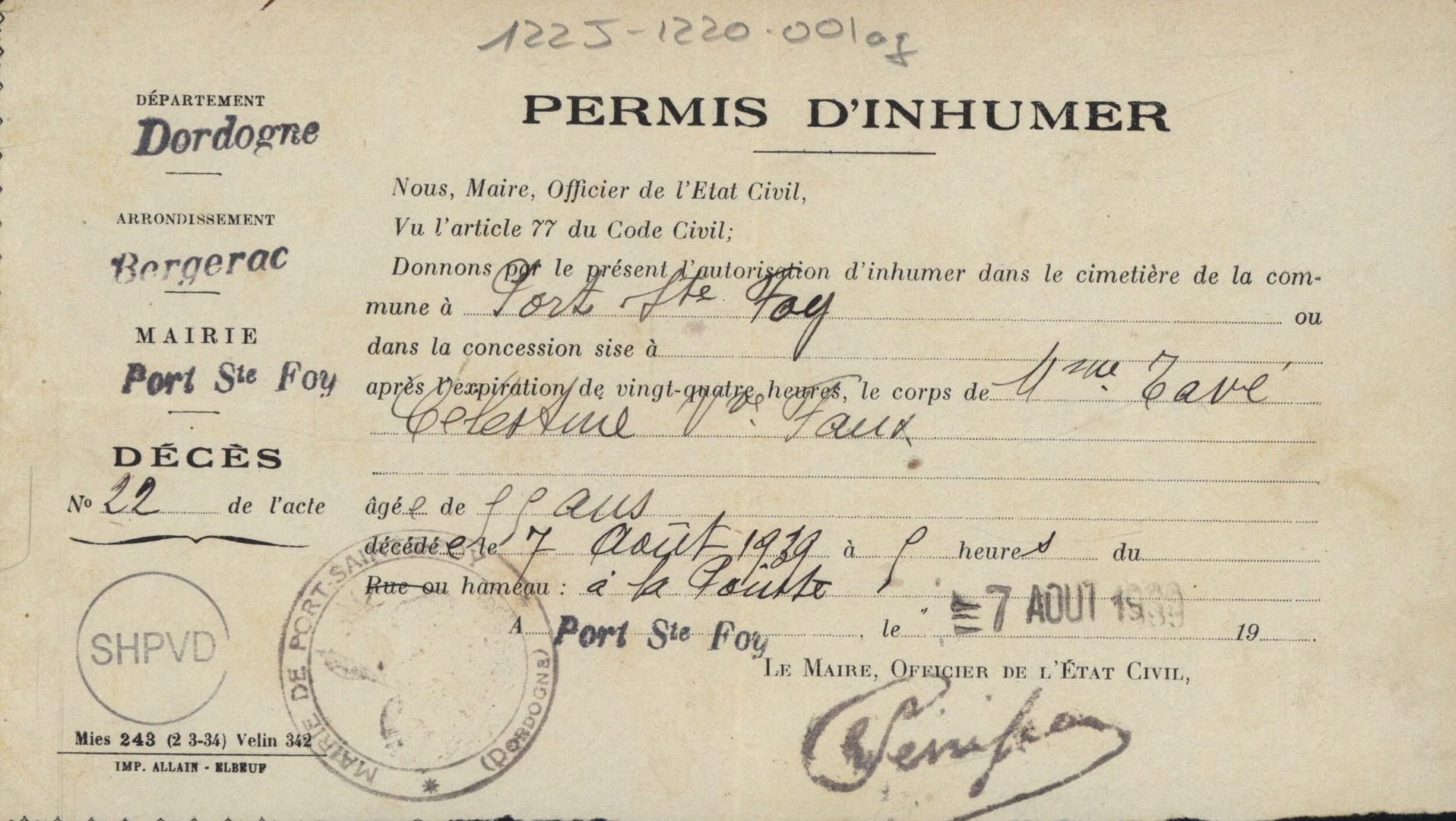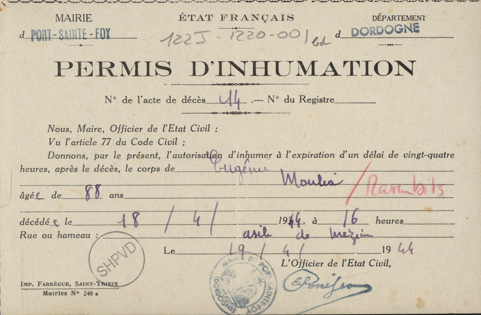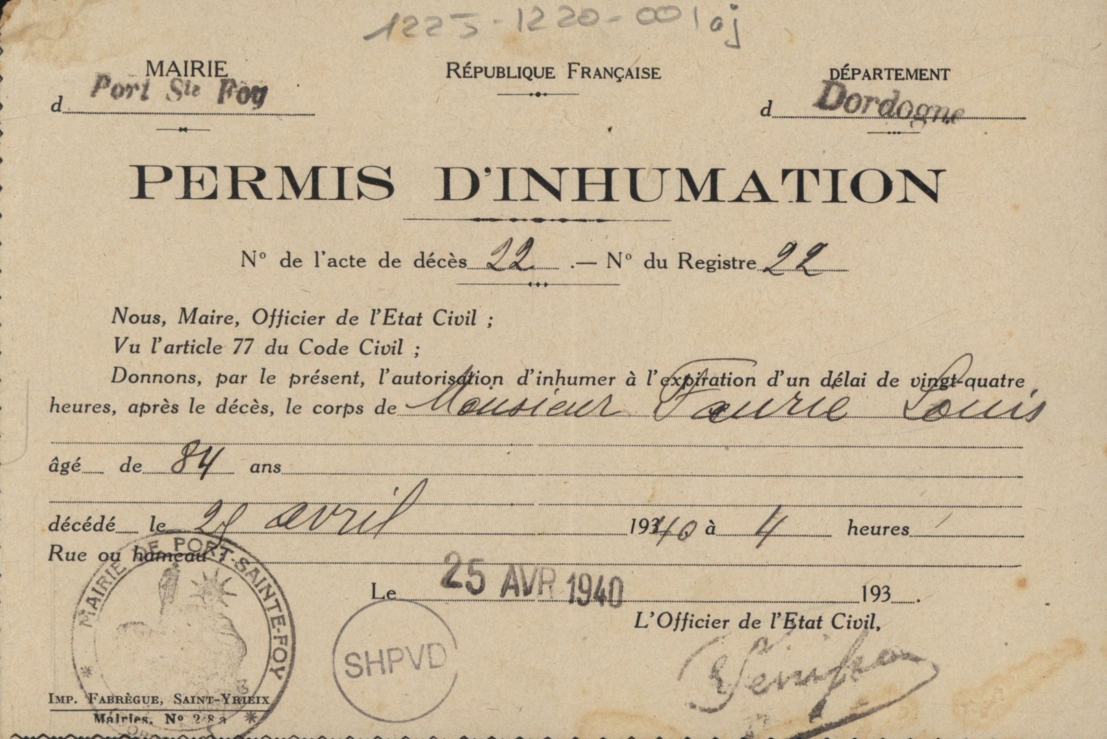 75 Permis d'inhumer 1922-1946 Charente (1939,1), Gironde (1925, 1), Bergerac (1939,1), Fougueyrolles (1924,1), Montcaret (1922, 1), Mussidan (1941, 1), Port-Ste-Foy (1922-1946, 60), St-Antoine-de-Breuil (1925-1942, 3), St-Méard-de-Gurçon (1924-1940, 4), Ste-Foy-la-Grande (1942-1945, 2) + "le lundi 26 juin 1944, j'ai présidé le service funèbre de Bob BRUYN, habitant l'École de Guyenne, blessé par des coups de feu de soldats allemands [...] inhumé au cimetière de Port-Ste-Foy. Pasteur Roger CASALIS. NB: le prénom de Bob était le véritable prénom du défunt, de nationalité hollandaise, et non un surnom."