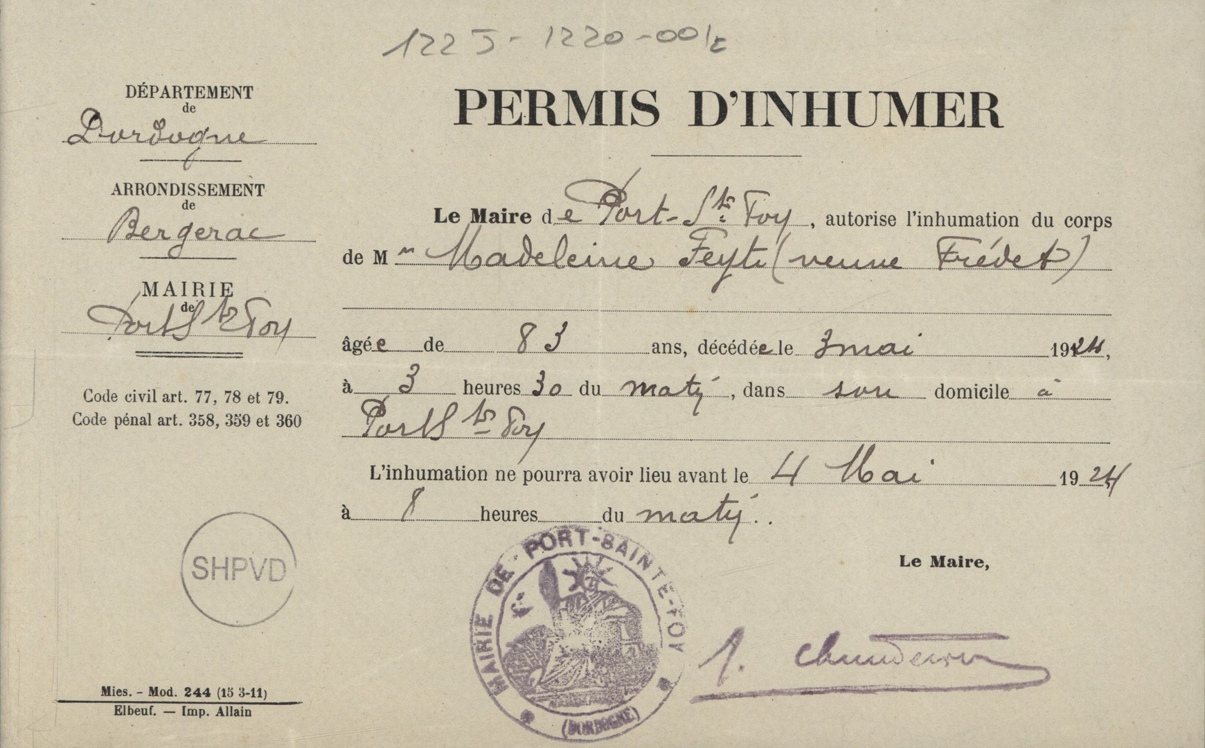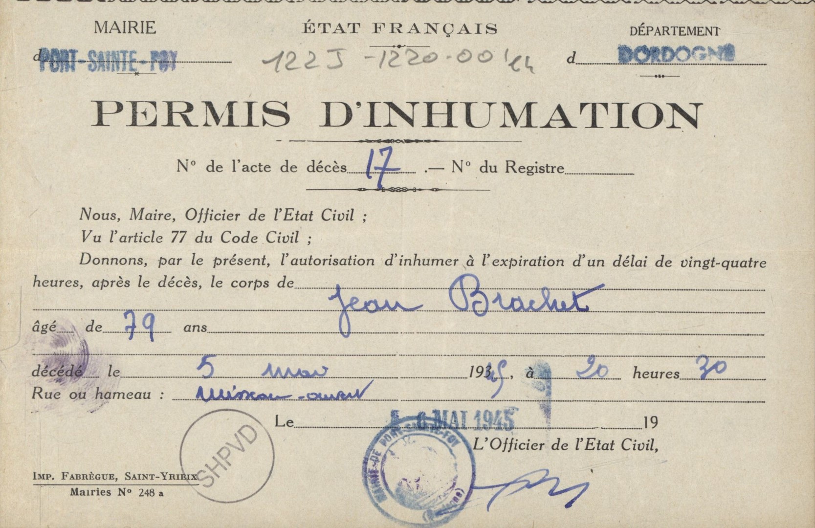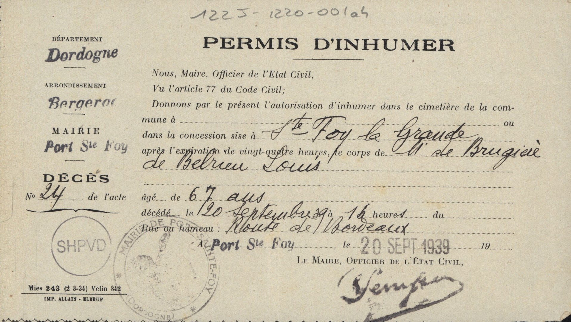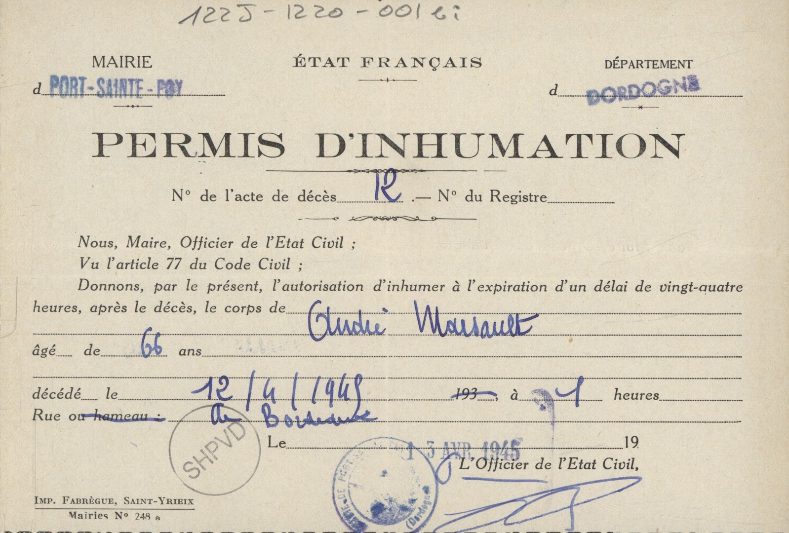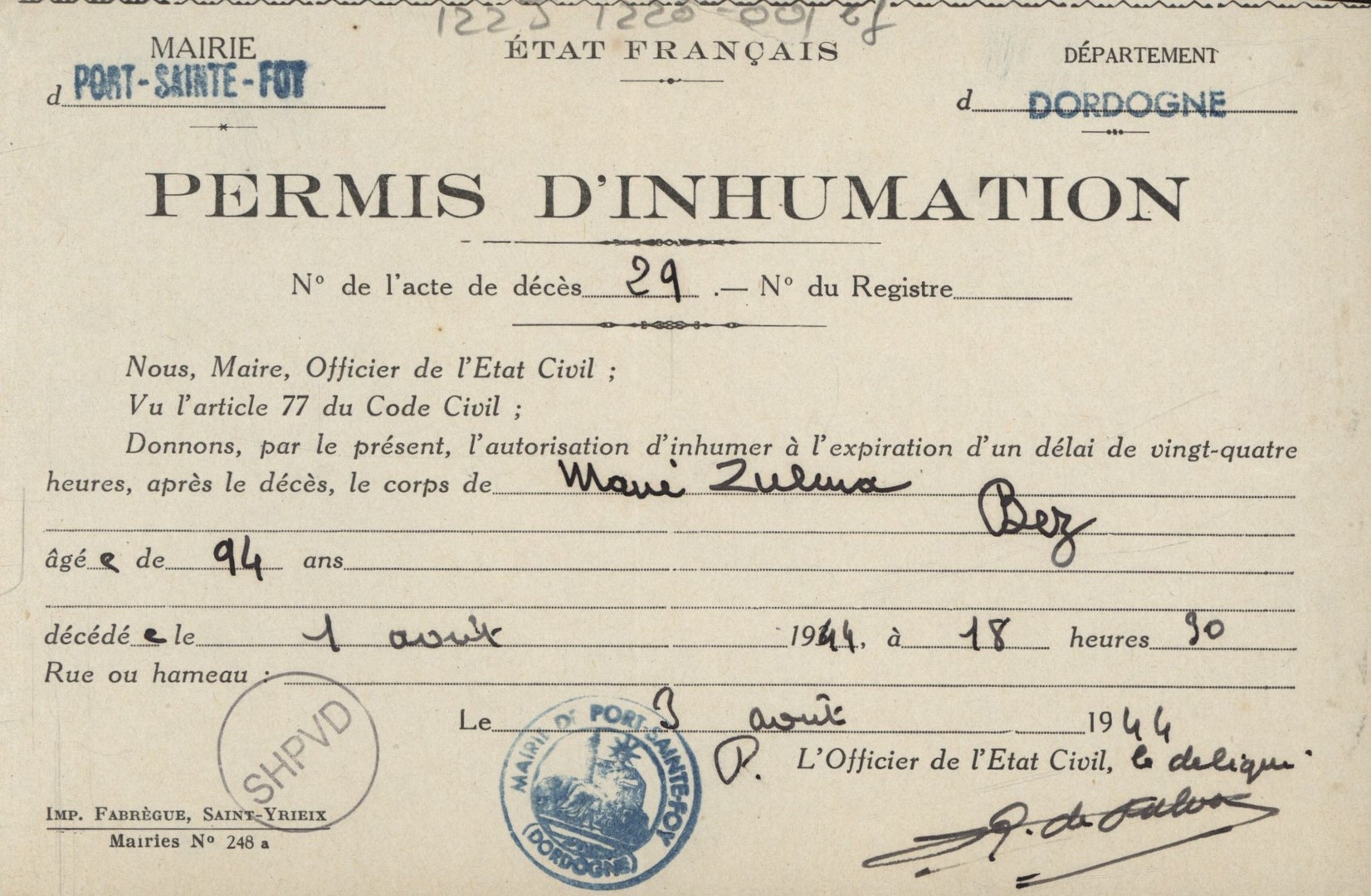75 Permis d'inhumer 1922-1946 Charente (1939,1), Gironde (1925, 1), Bergerac (1939,1), Fougueyrolles (1924,1), Montcaret (1922, 1), Mussidan (1941, 1), Port-Ste-Foy (1922-1946, 60), St-Antoine-de-Breuil (1925-1942, 3), St-Méard-de-Gurçon (1924-1940, 4), Ste-Foy-la-Grande (1942-1945, 2) + "le lundi 26 juin 1944, j'ai présidé le service funèbre de Bob BRUYN, habitant l'École de Guyenne, blessé par des coups de feu de soldats allemands [...] inhumé au cimetière de Port-Ste-Foy. Pasteur Roger CASALIS. NB: le prénom de Bob était le véritable prénom du défunt, de nationalité hollandaise, et non un surnom."
