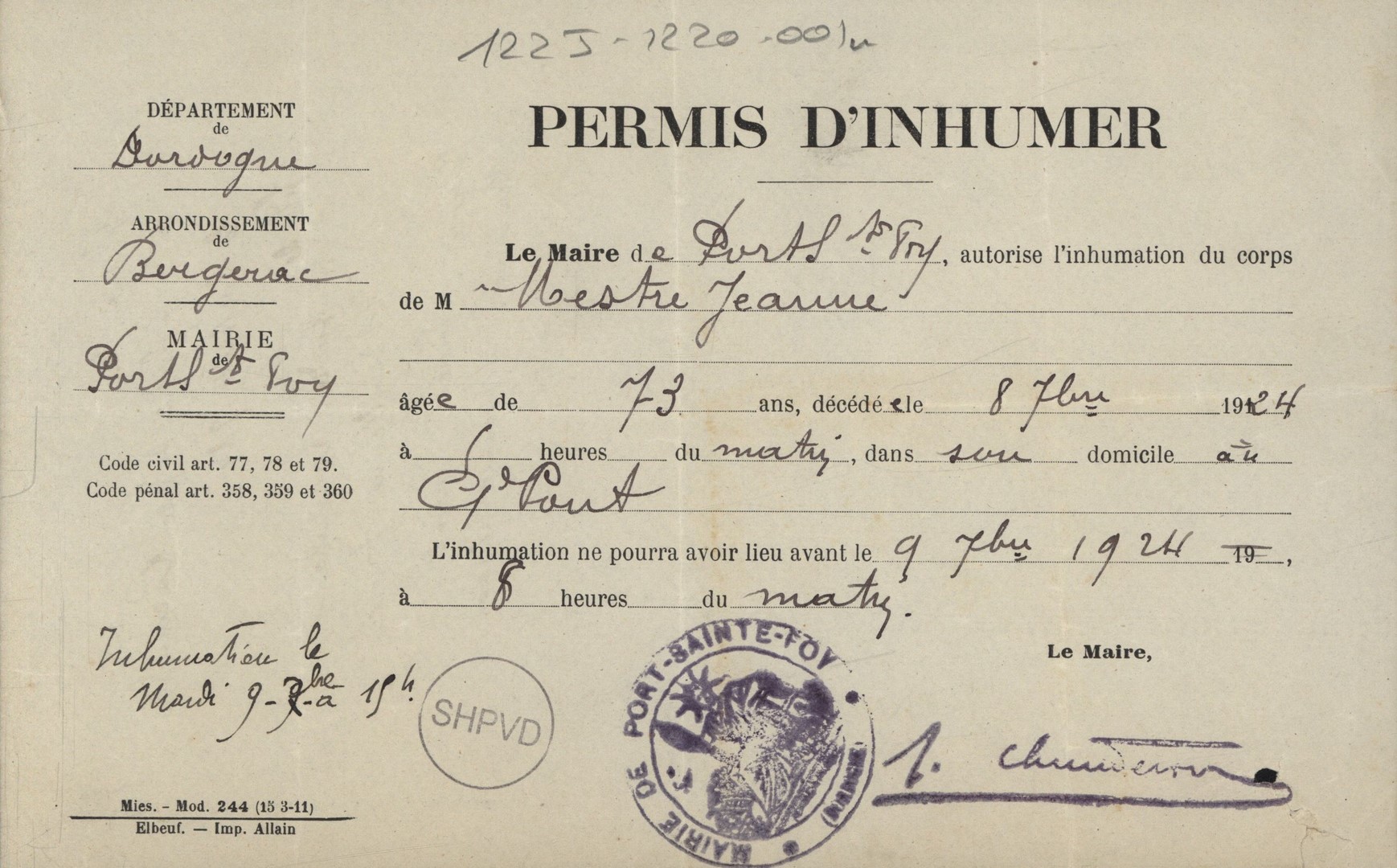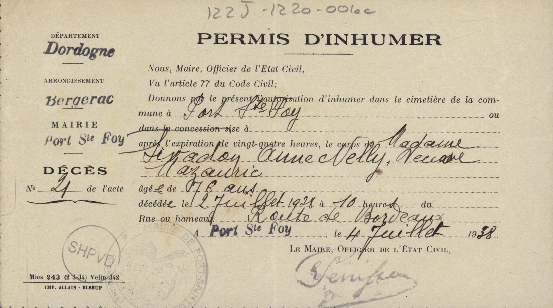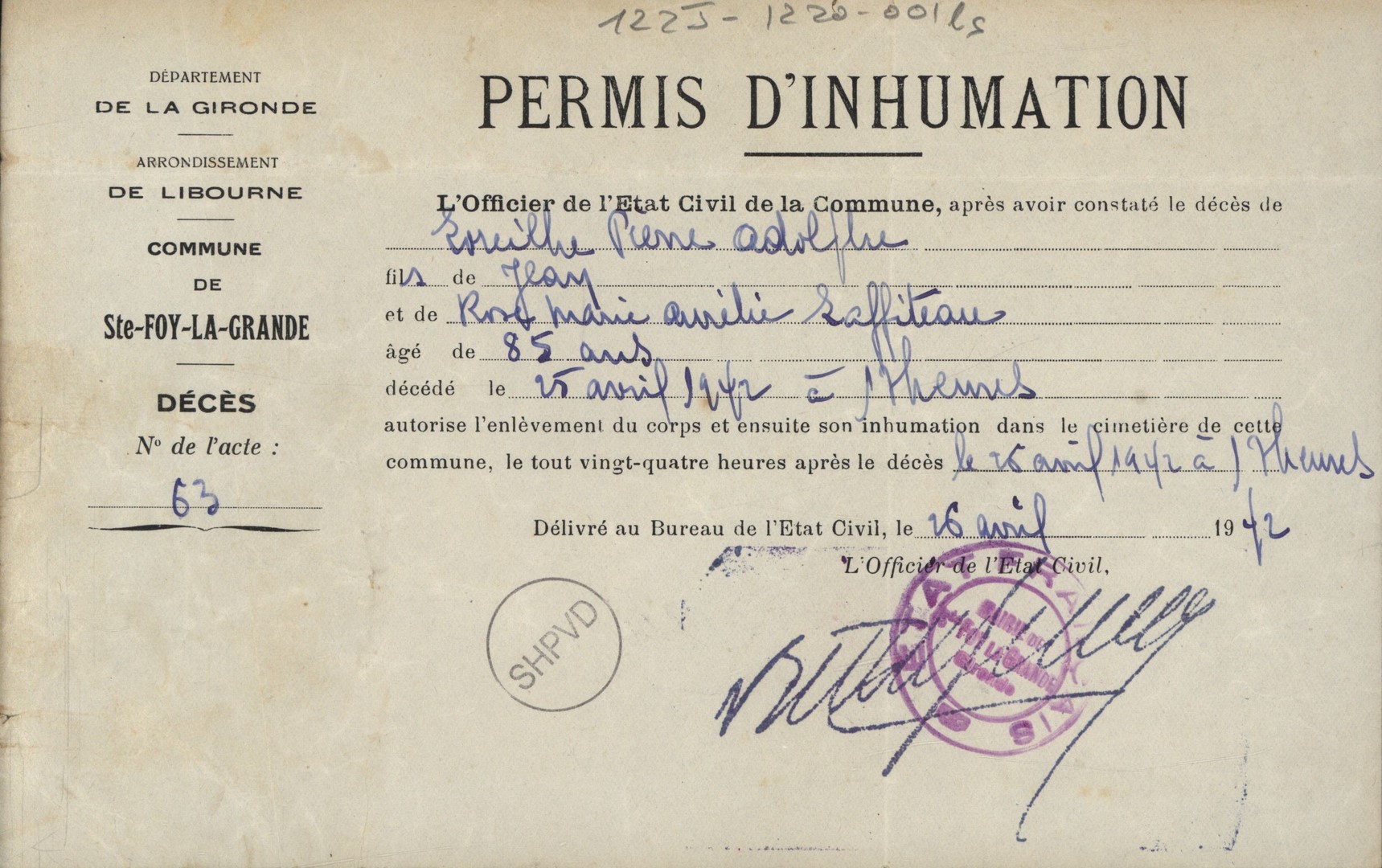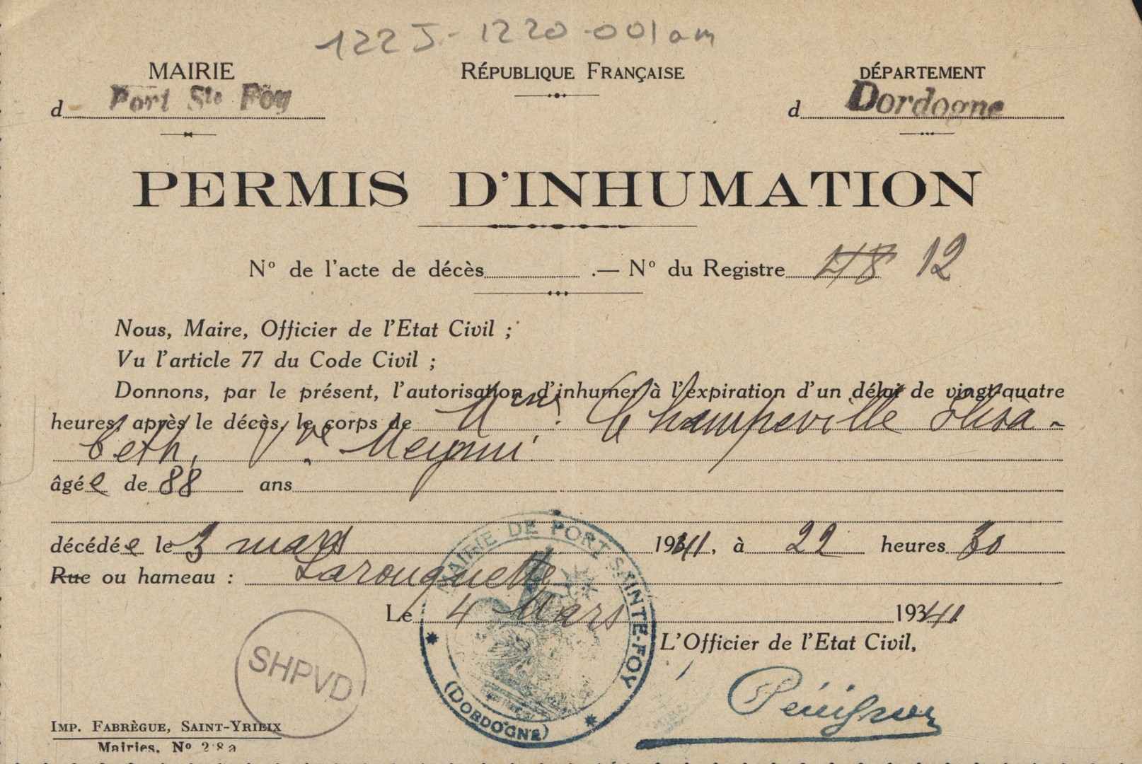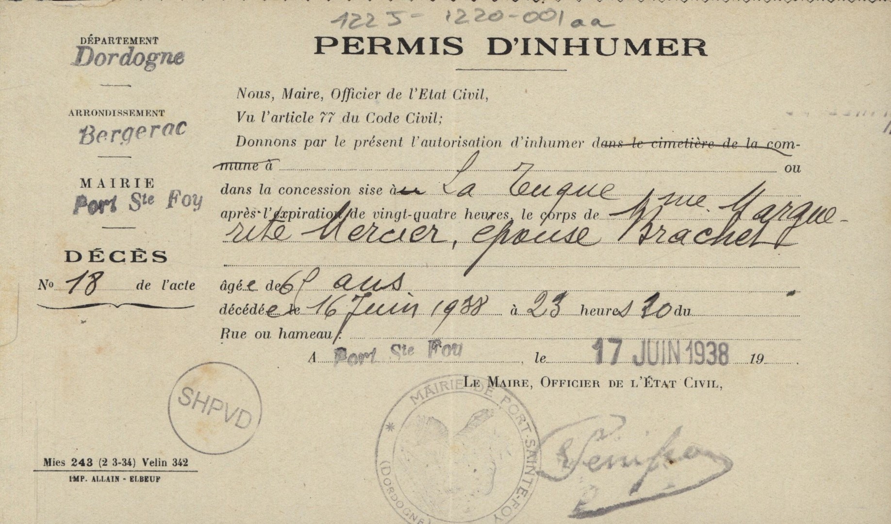 75 Permis d'inhumer 1922-1946 Charente (1939,1), Gironde (1925, 1), Bergerac (1939,1), Fougueyrolles (1924,1), Montcaret (1922, 1), Mussidan (1941, 1), Port-Ste-Foy (1922-1946, 60), St-Antoine-de-Breuil (1925-1942, 3), St-Méard-de-Gurçon (1924-1940, 4), Ste-Foy-la-Grande (1942-1945, 2) + "le lundi 26 juin 1944, j'ai présidé le service funèbre de Bob BRUYN, habitant l'École de Guyenne, blessé par des coups de feu de soldats allemands [...] inhumé au cimetière de Port-Ste-Foy. Pasteur Roger CASALIS. NB: le prénom de Bob était le véritable prénom du défunt, de nationalité hollandaise, et non un surnom."