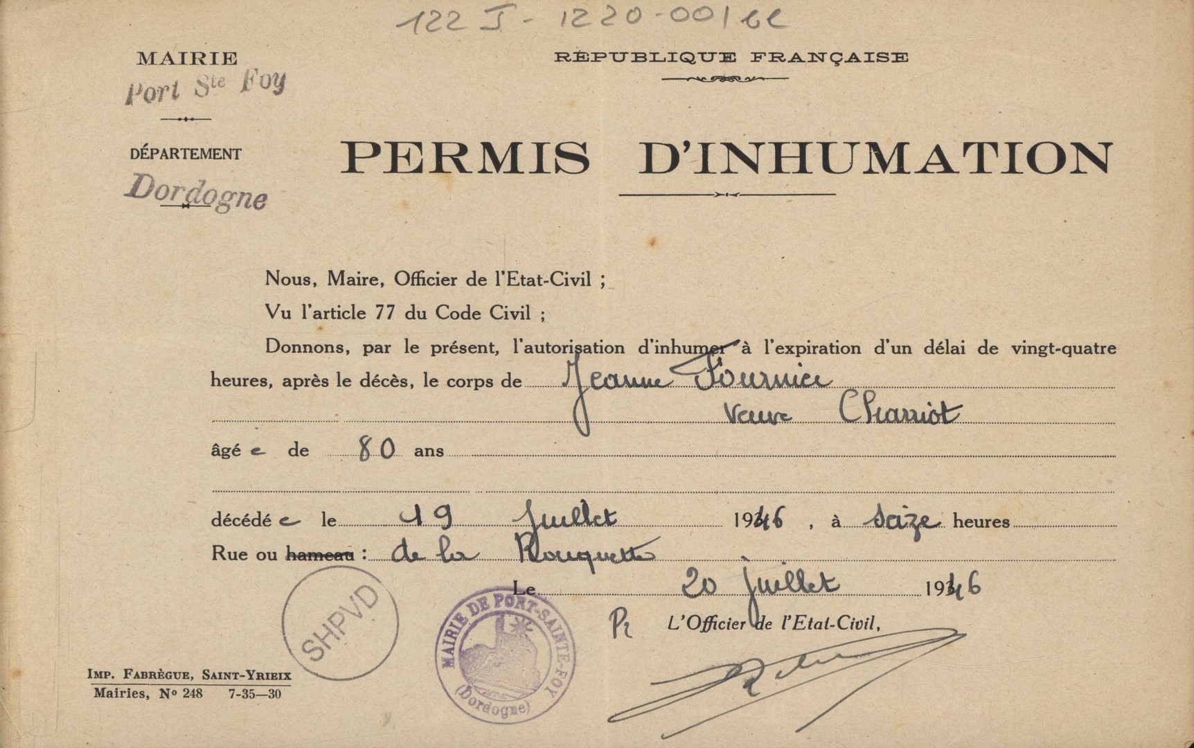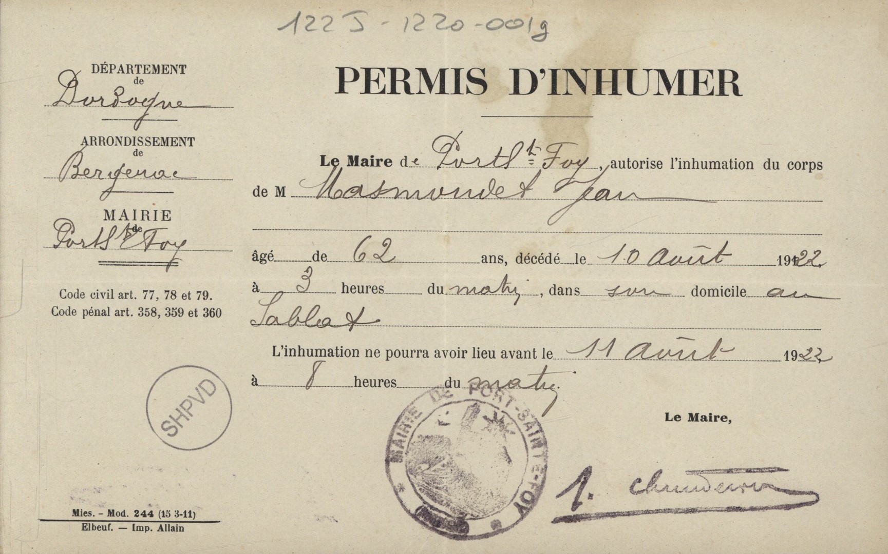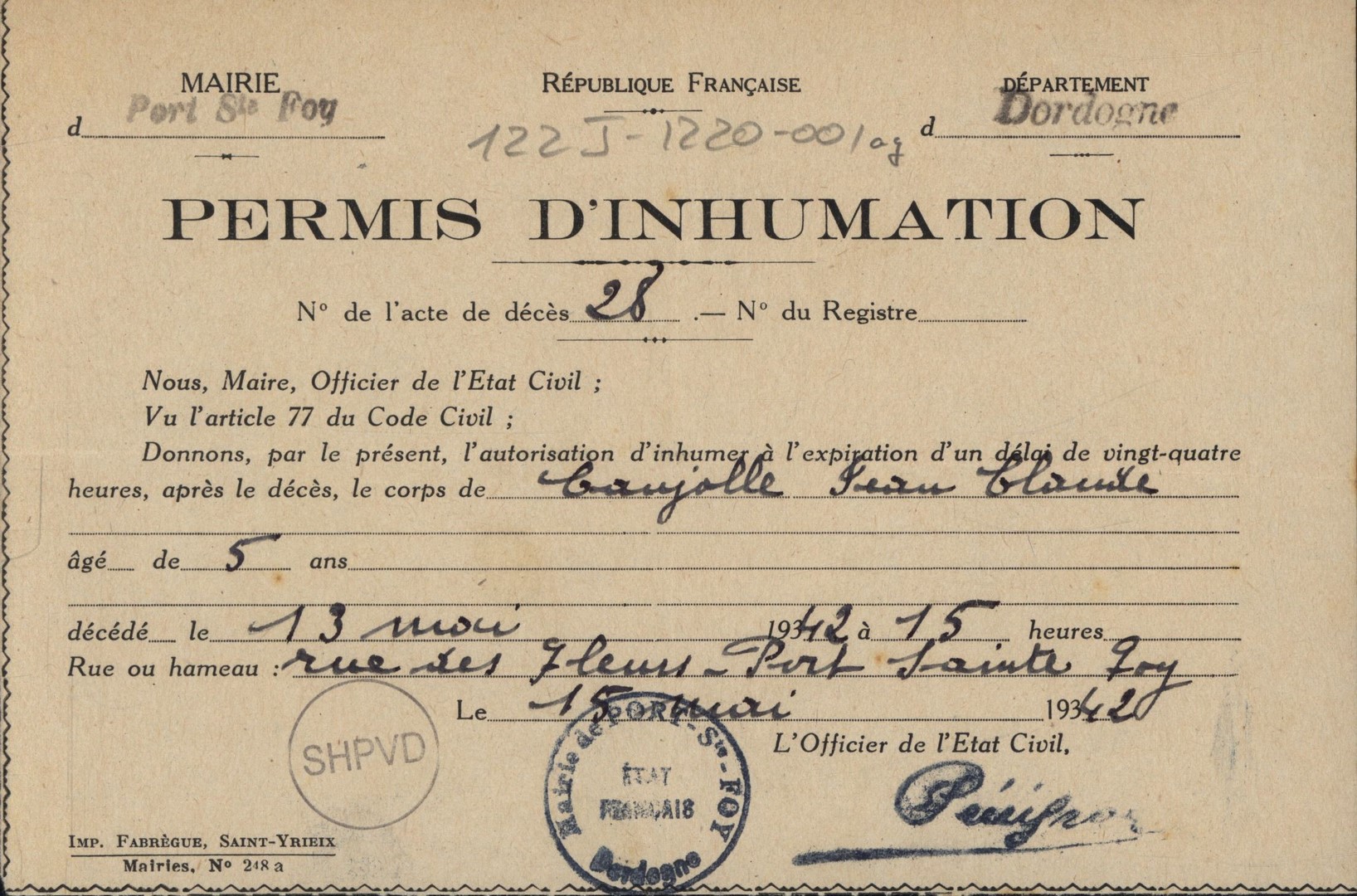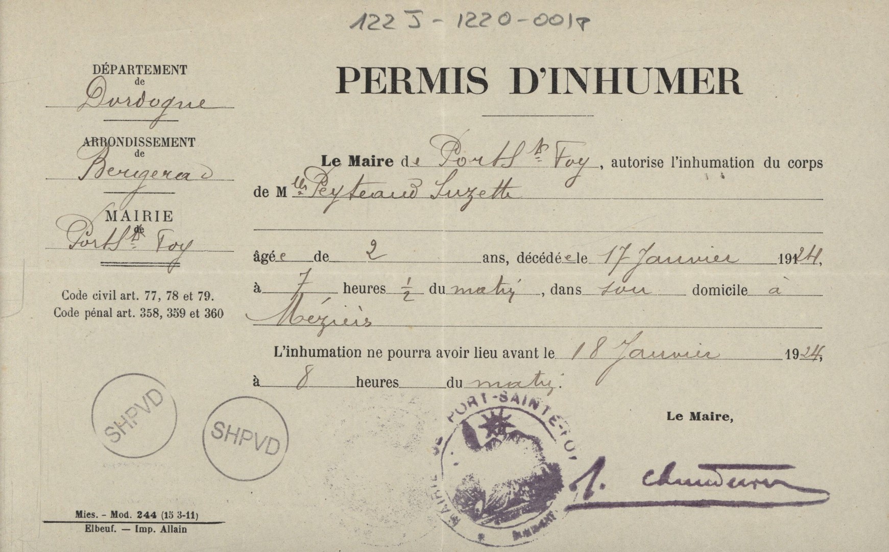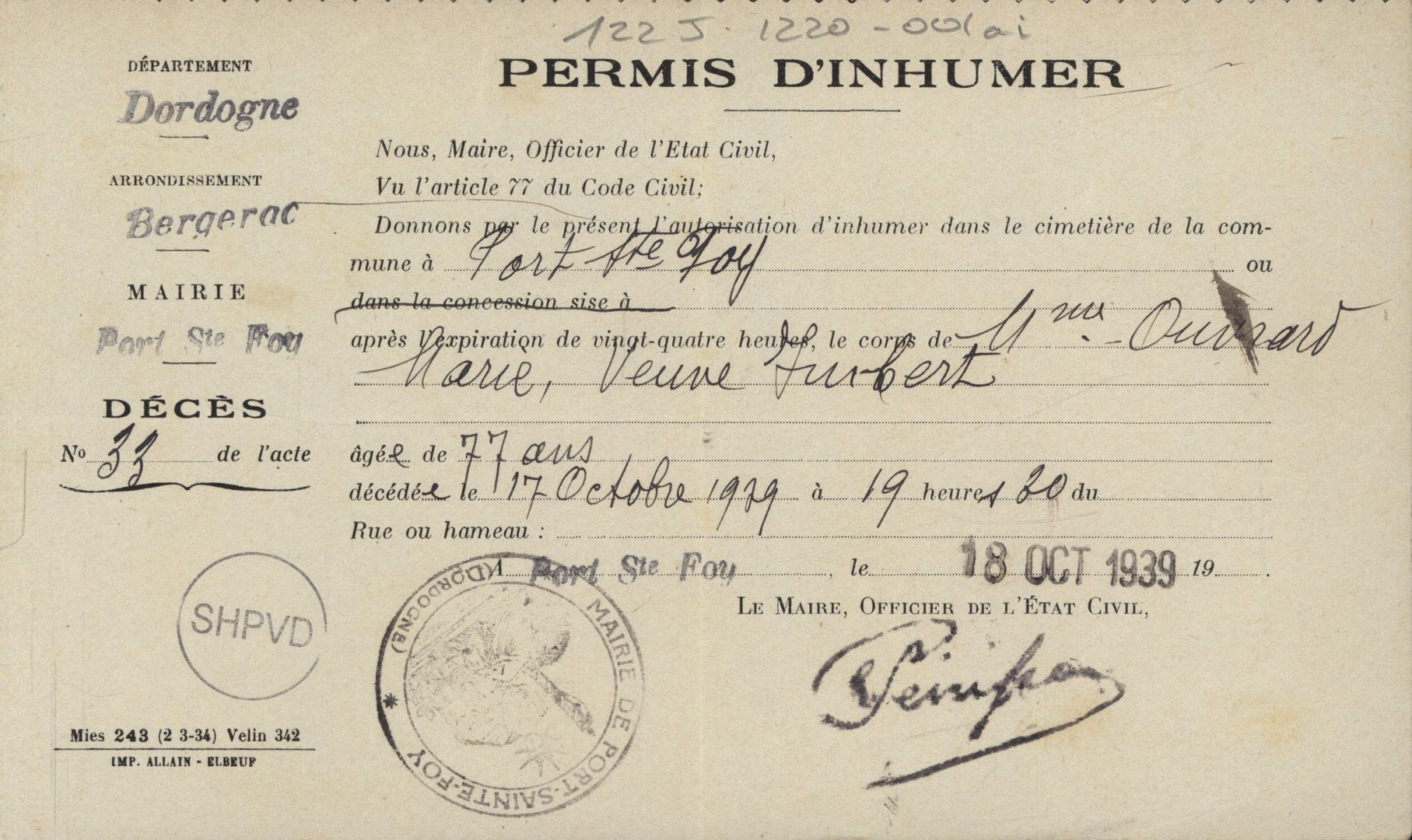 75 Permis d'inhumer 1922-1946 Charente (1939,1), Gironde (1925, 1), Bergerac (1939,1), Fougueyrolles (1924,1), Montcaret (1922, 1), Mussidan (1941, 1), Port-Ste-Foy (1922-1946, 60), St-Antoine-de-Breuil (1925-1942, 3), St-Méard-de-Gurçon (1924-1940, 4), Ste-Foy-la-Grande (1942-1945, 2) + "le lundi 26 juin 1944, j'ai présidé le service funèbre de Bob BRUYN, habitant l'École de Guyenne, blessé par des coups de feu de soldats allemands [...] inhumé au cimetière de Port-Ste-Foy. Pasteur Roger CASALIS. NB: le prénom de Bob était le véritable prénom du défunt, de nationalité hollandaise, et non un surnom."