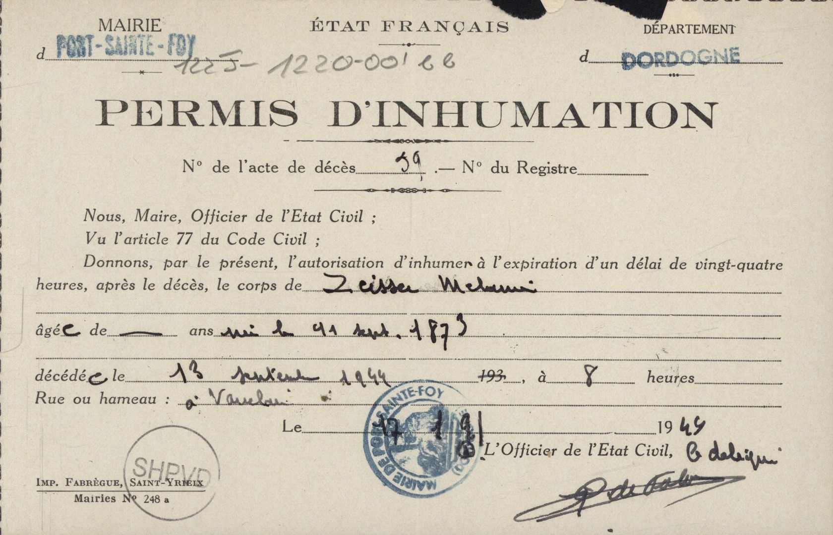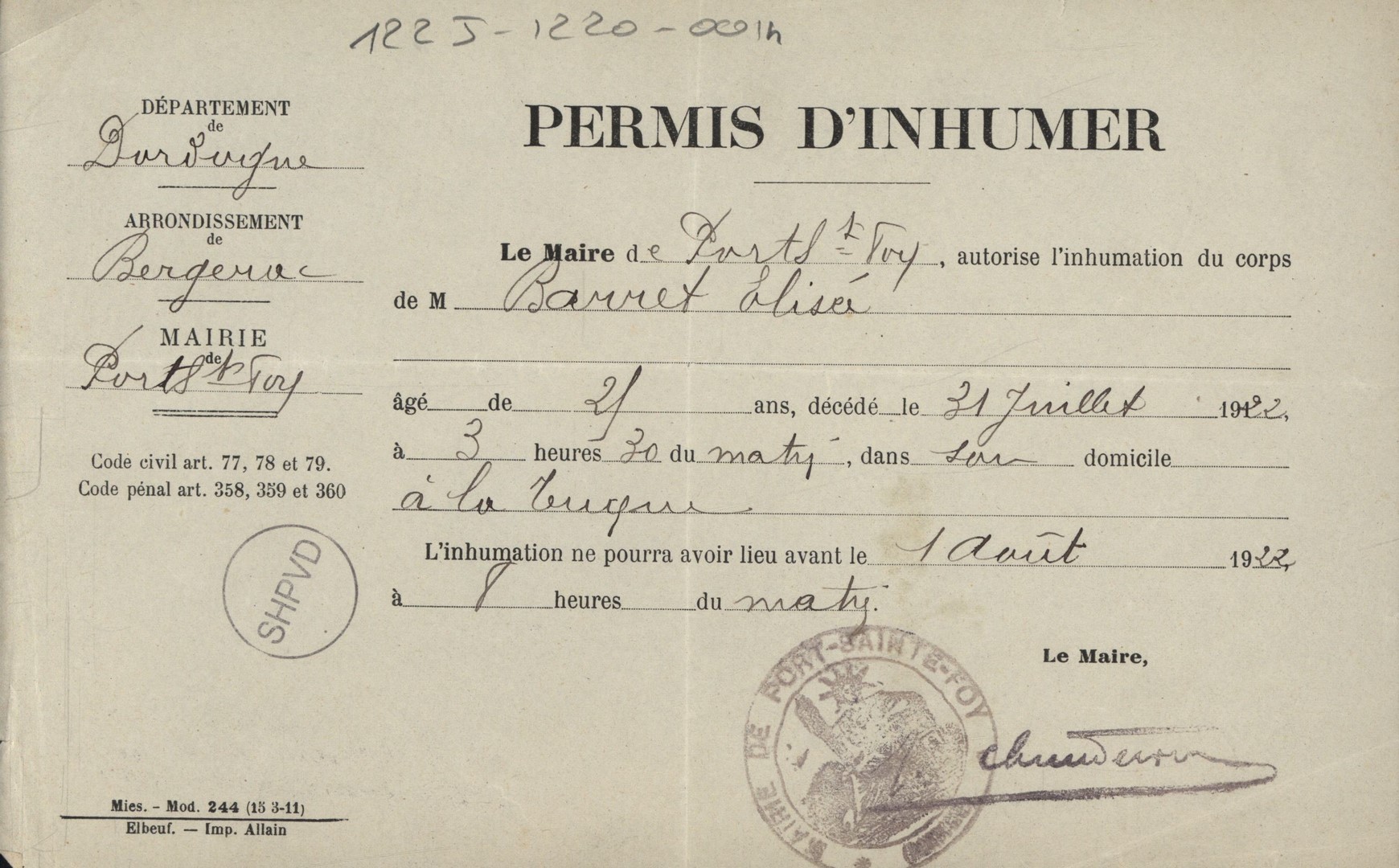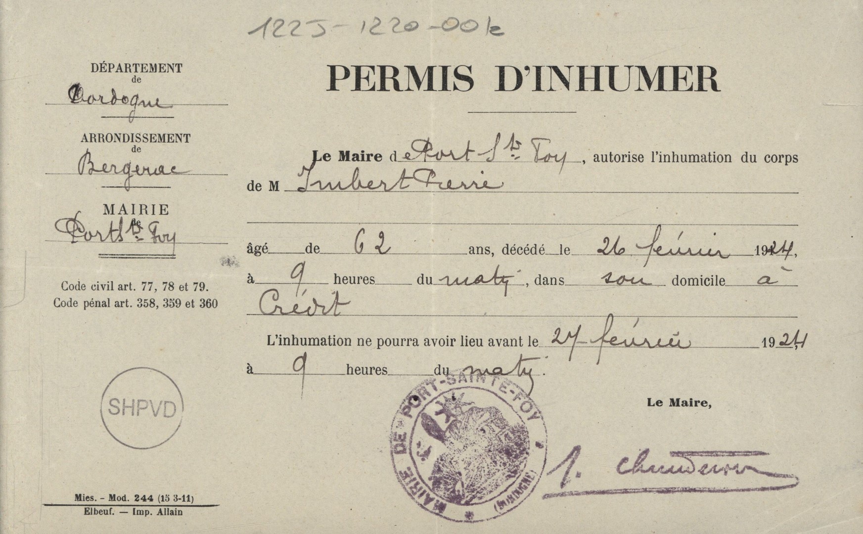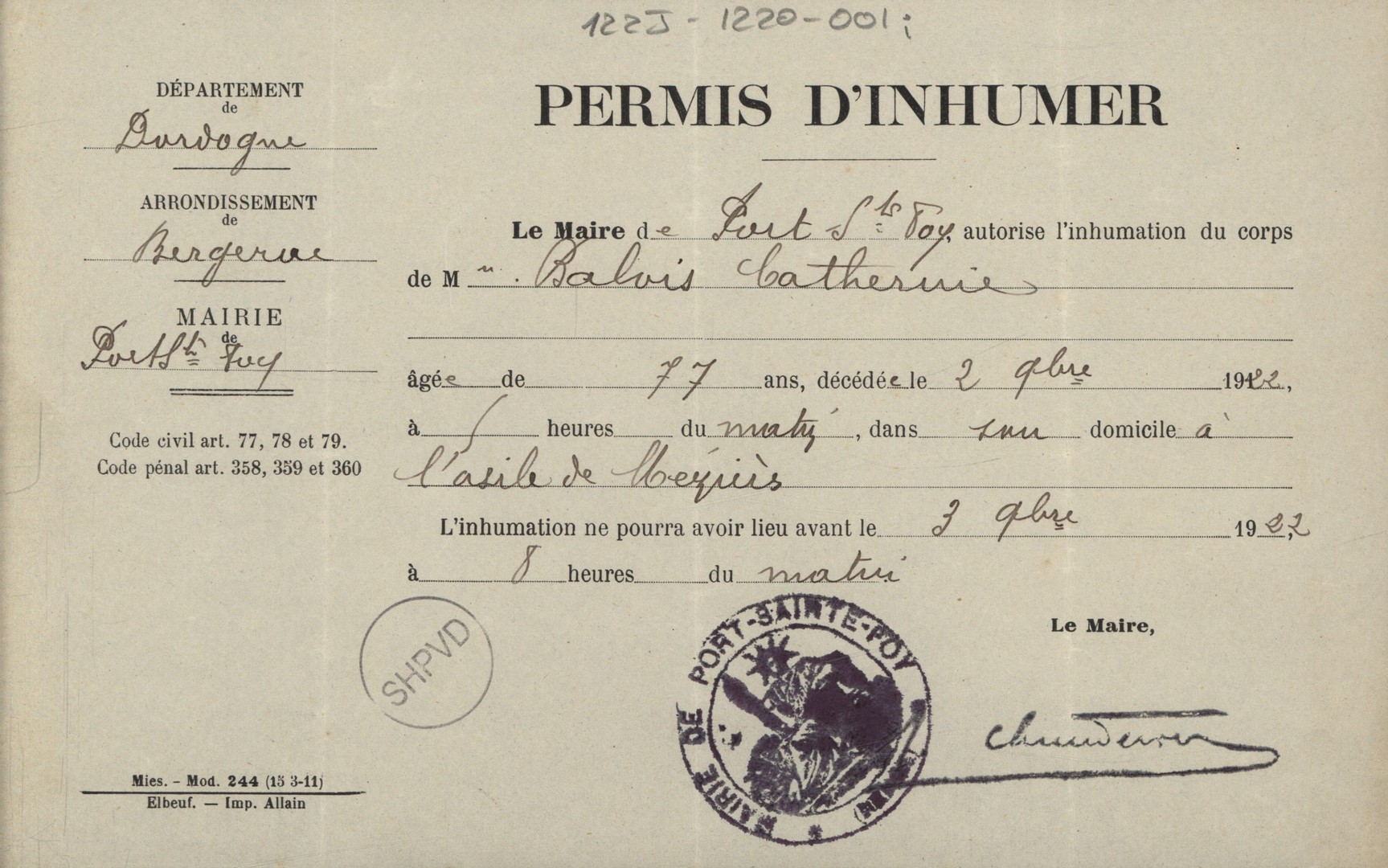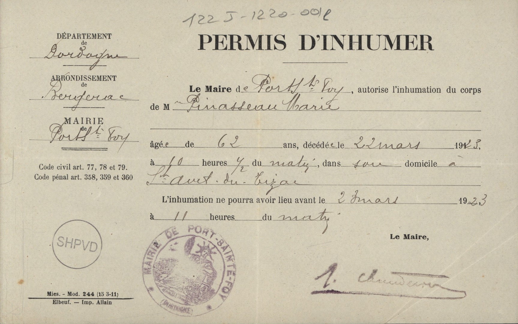 75 Permis d'inhumer 1922-1946 Charente (1939,1), Gironde (1925, 1), Bergerac (1939,1), Fougueyrolles (1924,1), Montcaret (1922, 1), Mussidan (1941, 1), Port-Ste-Foy (1922-1946, 60), St-Antoine-de-Breuil (1925-1942, 3), St-Méard-de-Gurçon (1924-1940, 4), Ste-Foy-la-Grande (1942-1945, 2) + "le lundi 26 juin 1944, j'ai présidé le service funèbre de Bob BRUYN, habitant l'École de Guyenne, blessé par des coups de feu de soldats allemands [...] inhumé au cimetière de Port-Ste-Foy. Pasteur Roger CASALIS. NB: le prénom de Bob était le véritable prénom du défunt, de nationalité hollandaise, et non un surnom."
