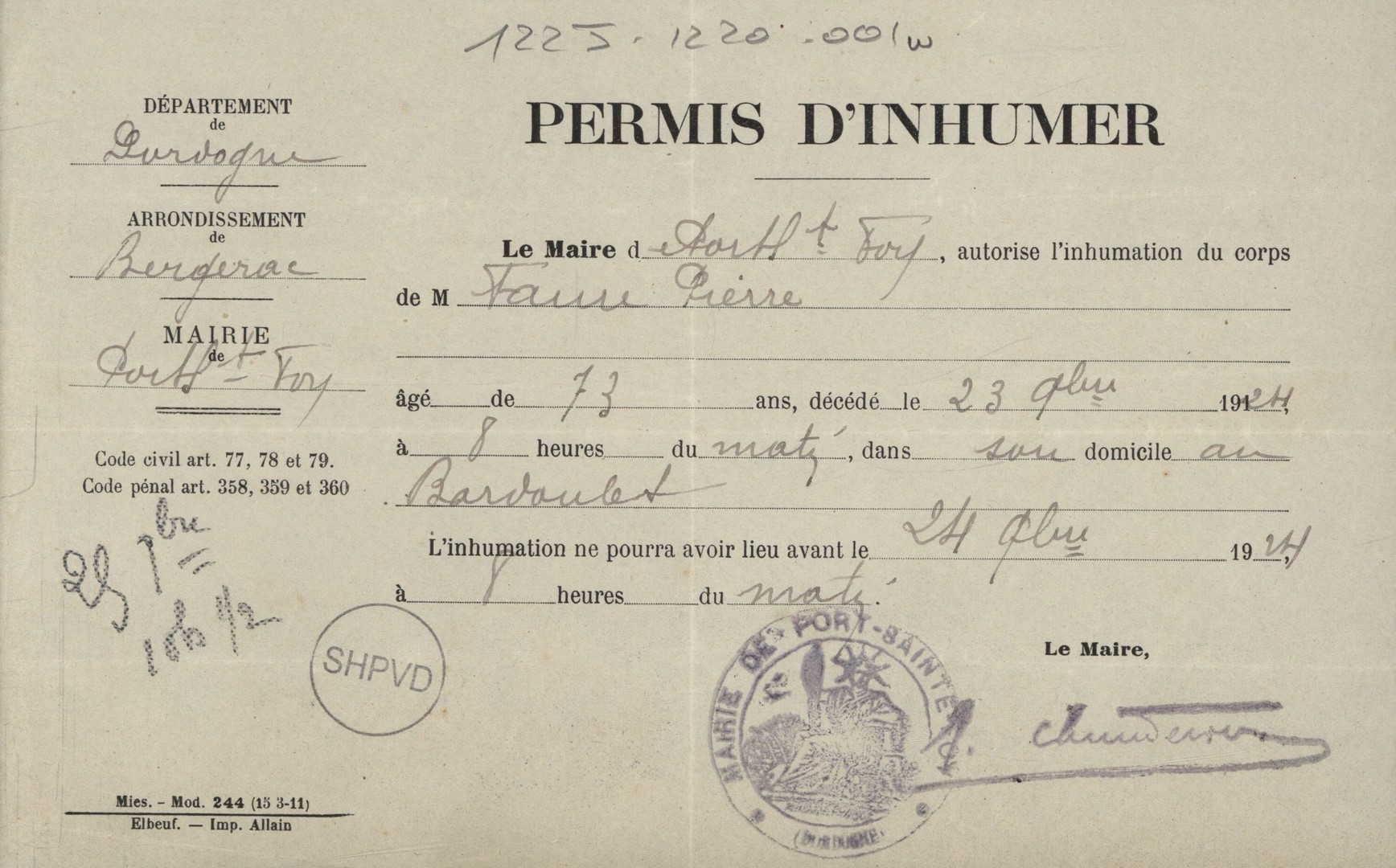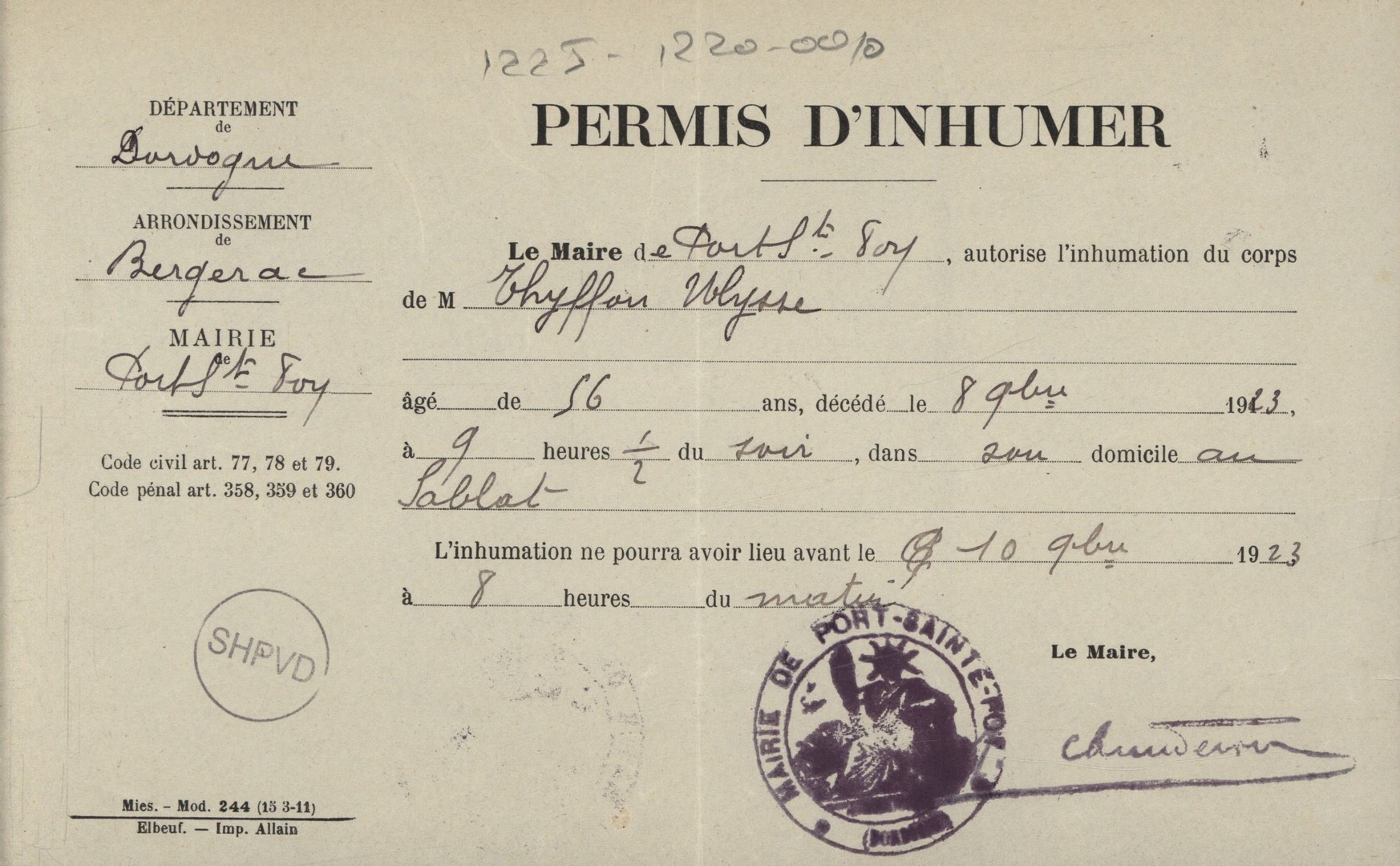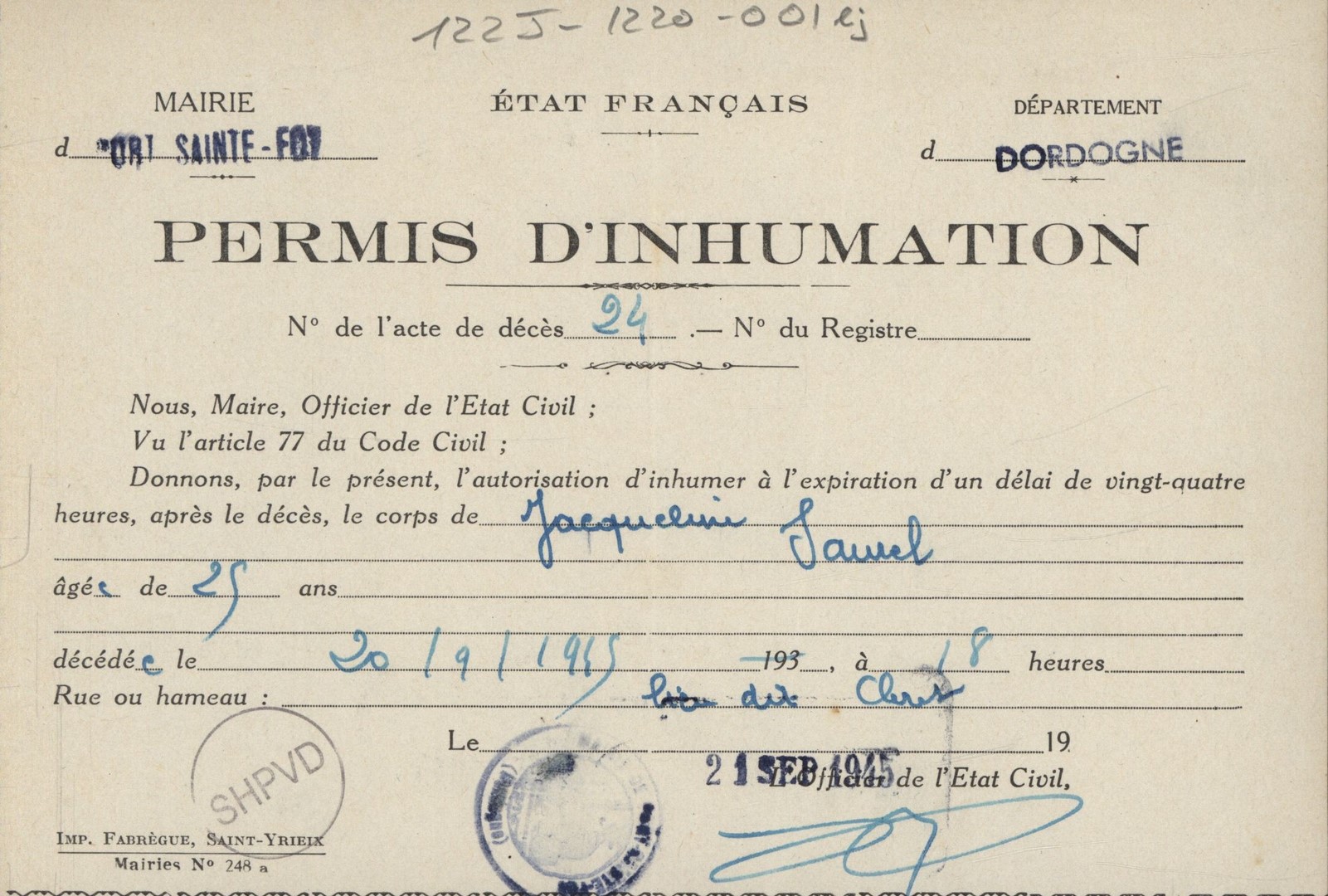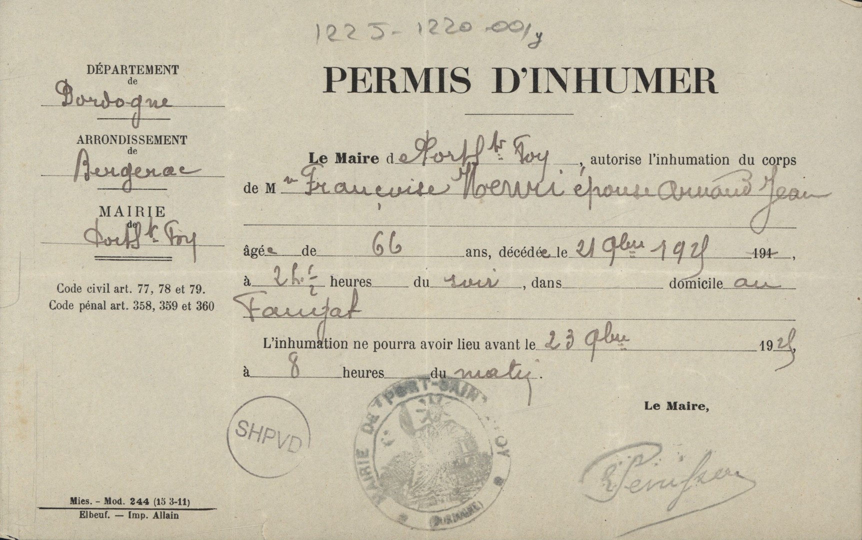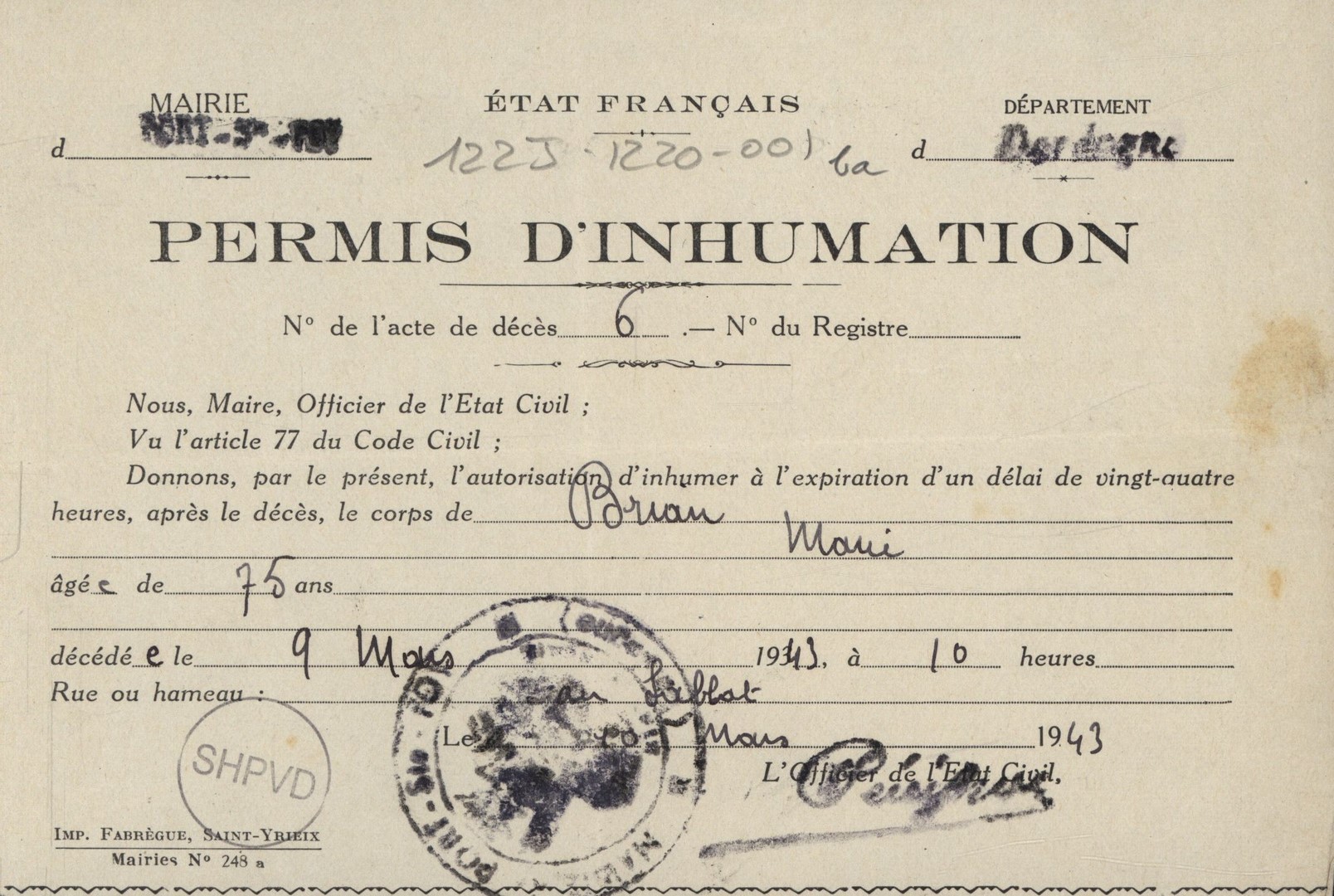 75 Permis d'inhumer 1922-1946 Charente (1939,1), Gironde (1925, 1), Bergerac (1939,1), Fougueyrolles (1924,1), Montcaret (1922, 1), Mussidan (1941, 1), Port-Ste-Foy (1922-1946, 60), St-Antoine-de-Breuil (1925-1942, 3), St-Méard-de-Gurçon (1924-1940, 4), Ste-Foy-la-Grande (1942-1945, 2) + "le lundi 26 juin 1944, j'ai présidé le service funèbre de Bob BRUYN, habitant l'École de Guyenne, blessé par des coups de feu de soldats allemands [...] inhumé au cimetière de Port-Ste-Foy. Pasteur Roger CASALIS. NB: le prénom de Bob était le véritable prénom du défunt, de nationalité hollandaise, et non un surnom."