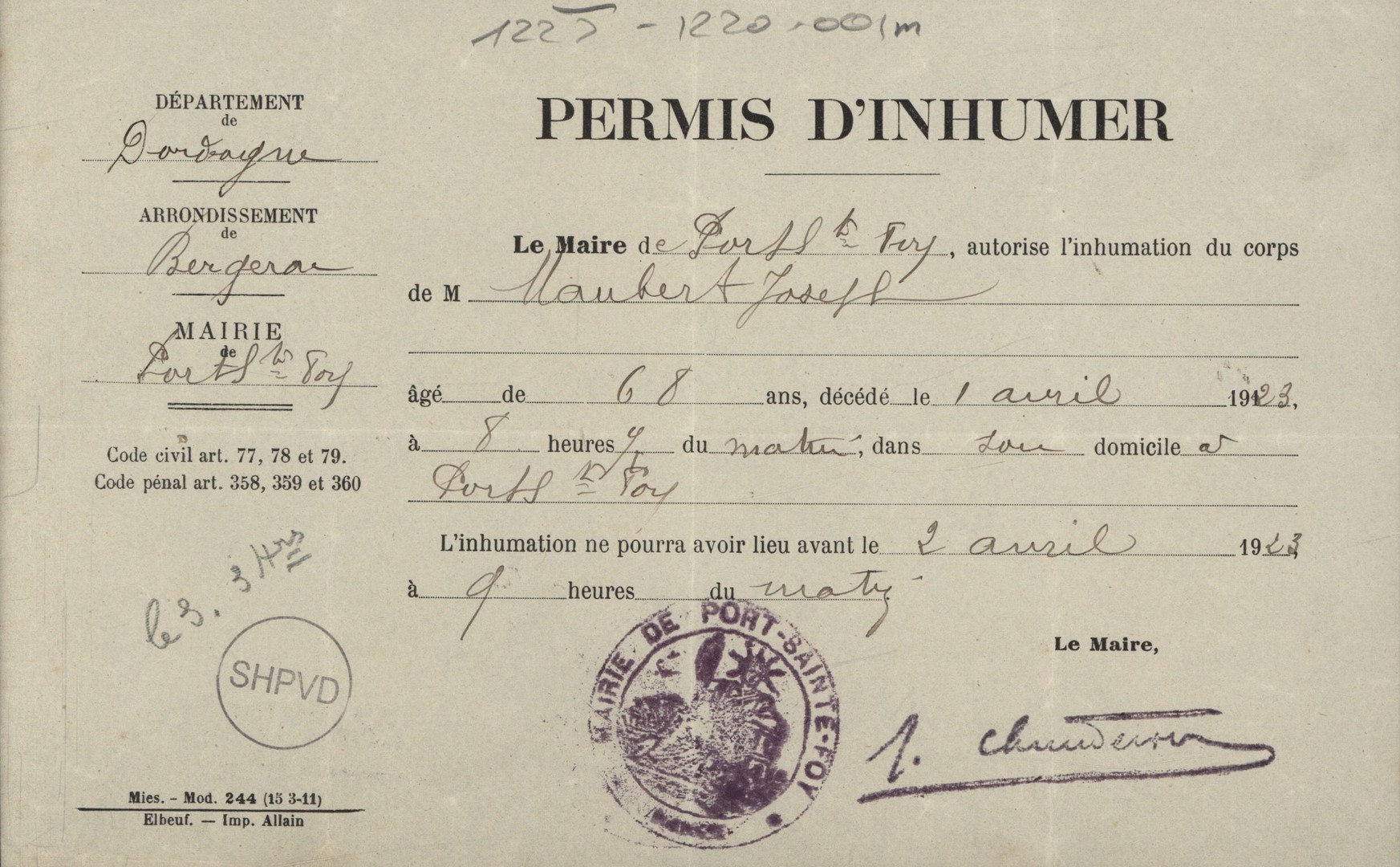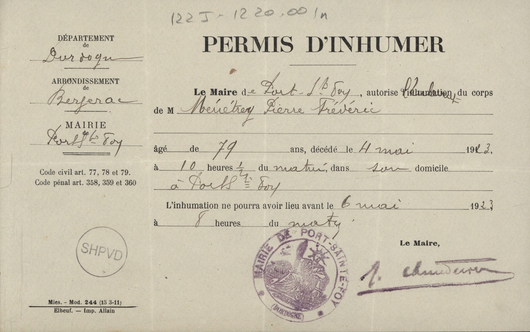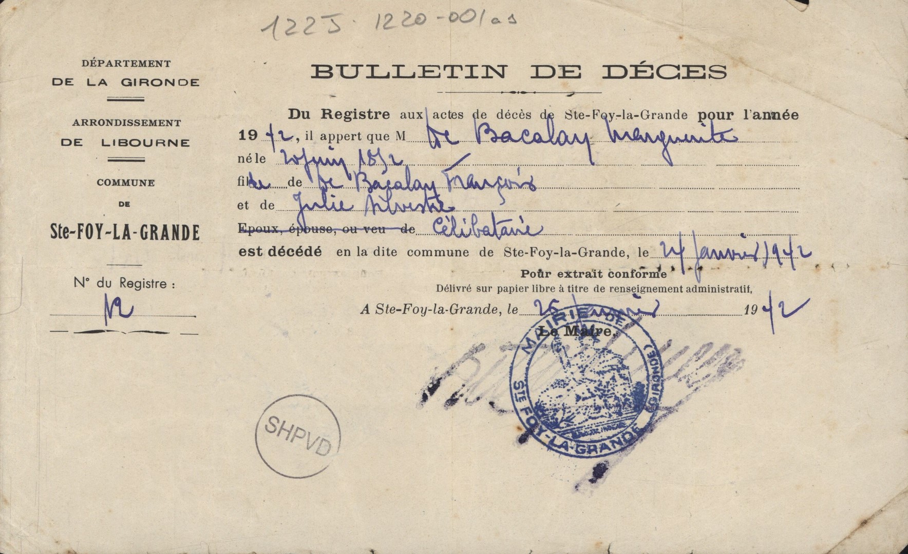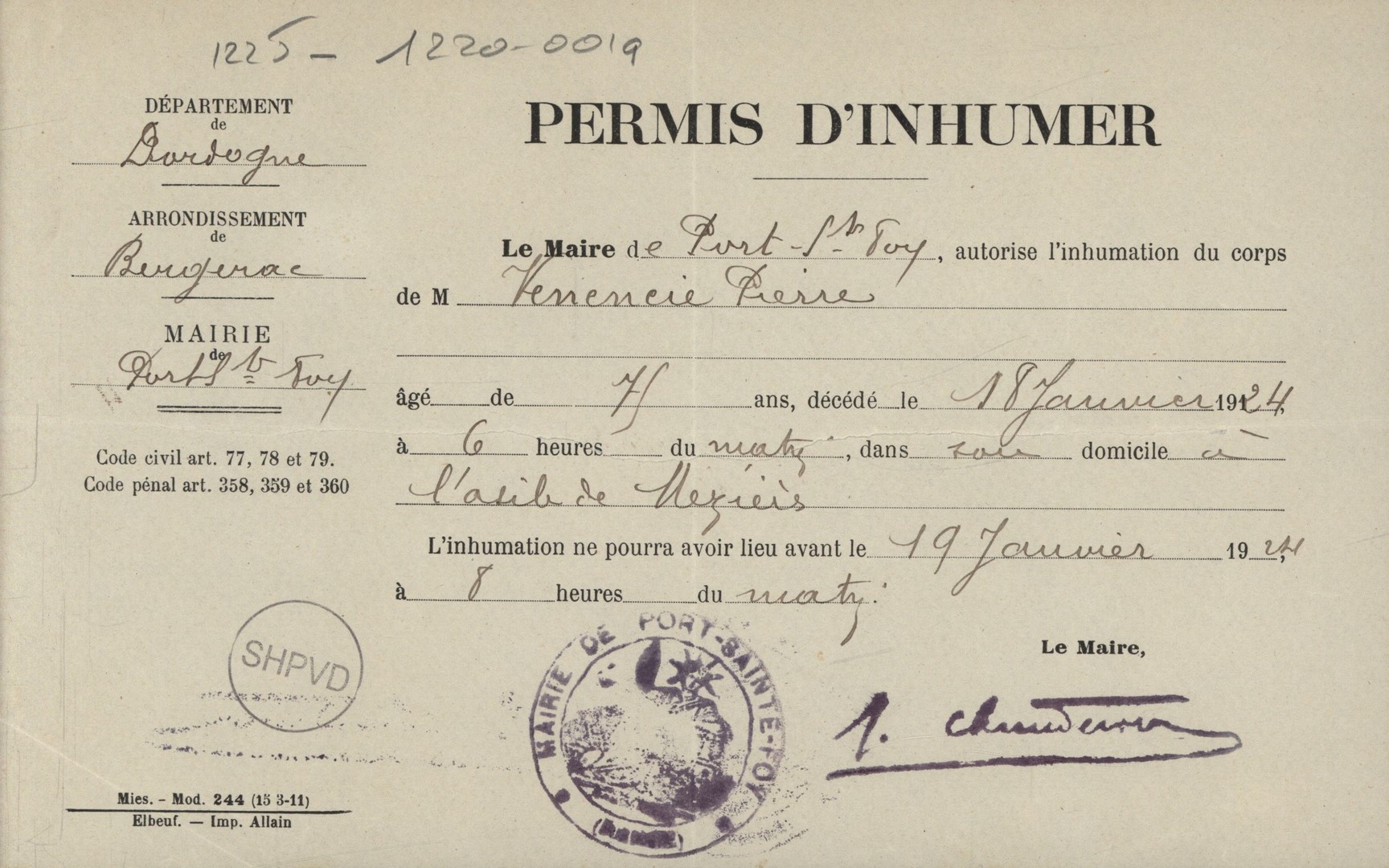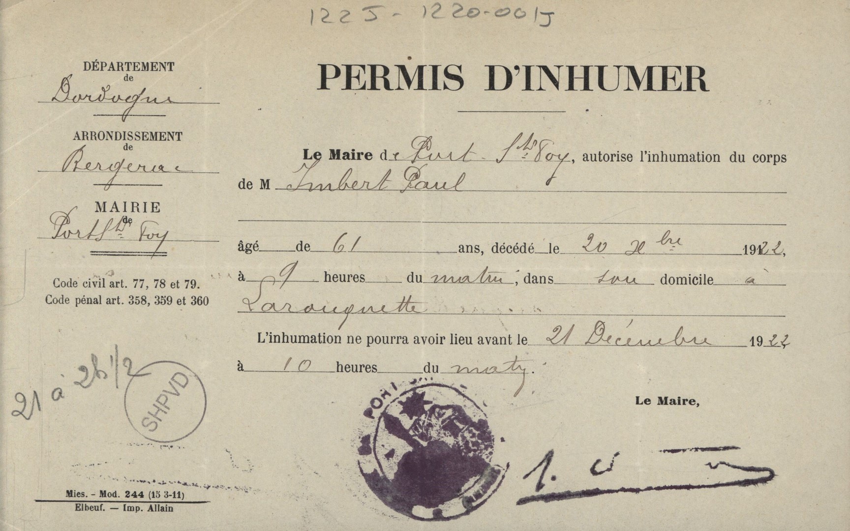 75 Permis d'inhumer 1922-1946 Charente (1939,1), Gironde (1925, 1), Bergerac (1939,1), Fougueyrolles (1924,1), Montcaret (1922, 1), Mussidan (1941, 1), Port-Ste-Foy (1922-1946, 60), St-Antoine-de-Breuil (1925-1942, 3), St-Méard-de-Gurçon (1924-1940, 4), Ste-Foy-la-Grande (1942-1945, 2) + "le lundi 26 juin 1944, j'ai présidé le service funèbre de Bob BRUYN, habitant l'École de Guyenne, blessé par des coups de feu de soldats allemands [...] inhumé au cimetière de Port-Ste-Foy. Pasteur Roger CASALIS. NB: le prénom de Bob était le véritable prénom du défunt, de nationalité hollandaise, et non un surnom."