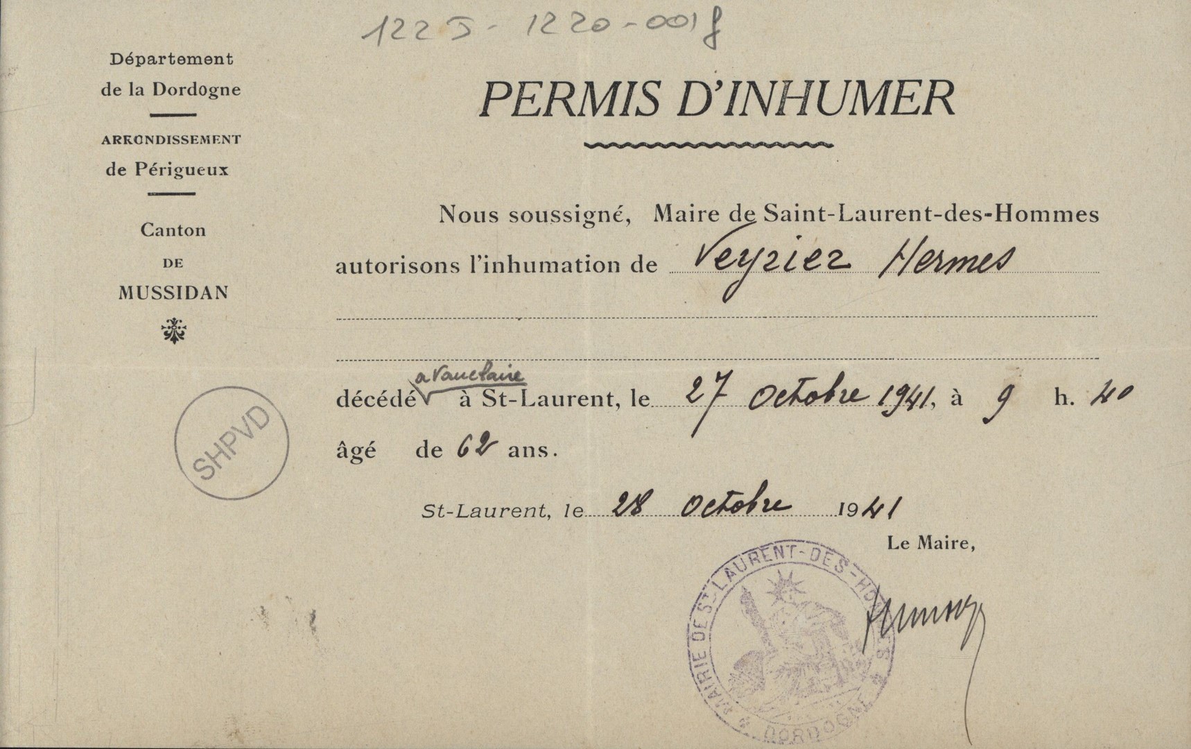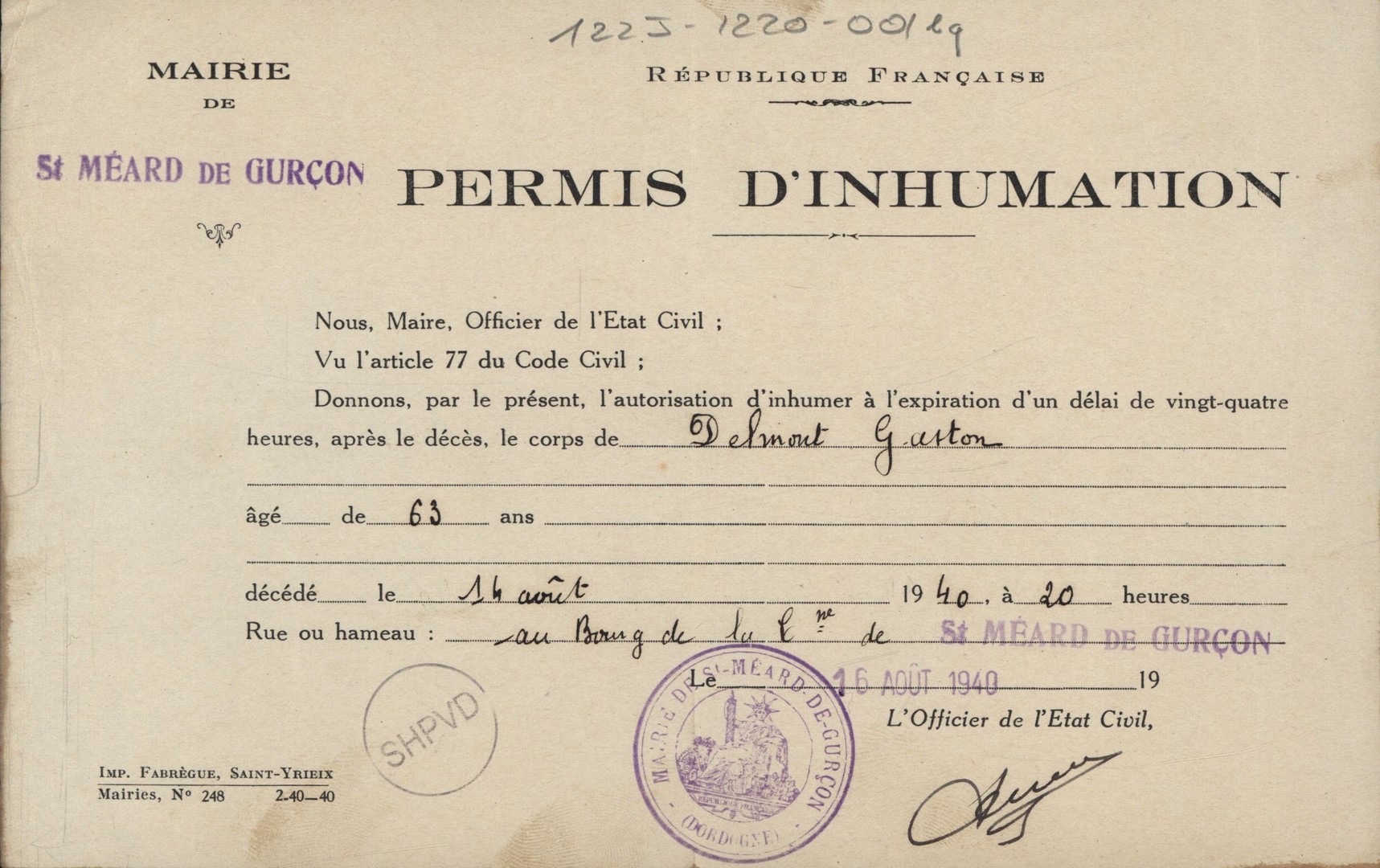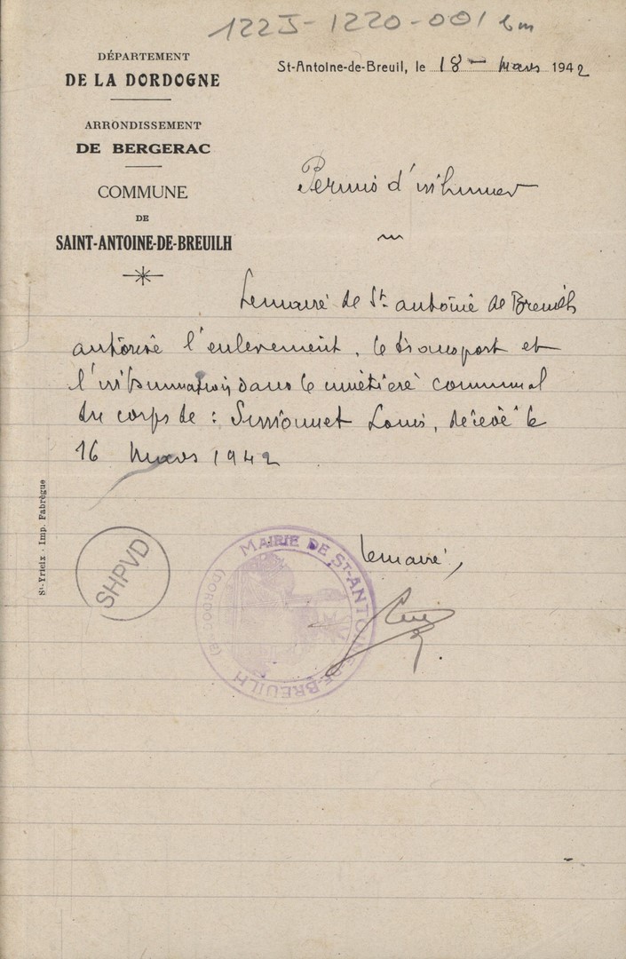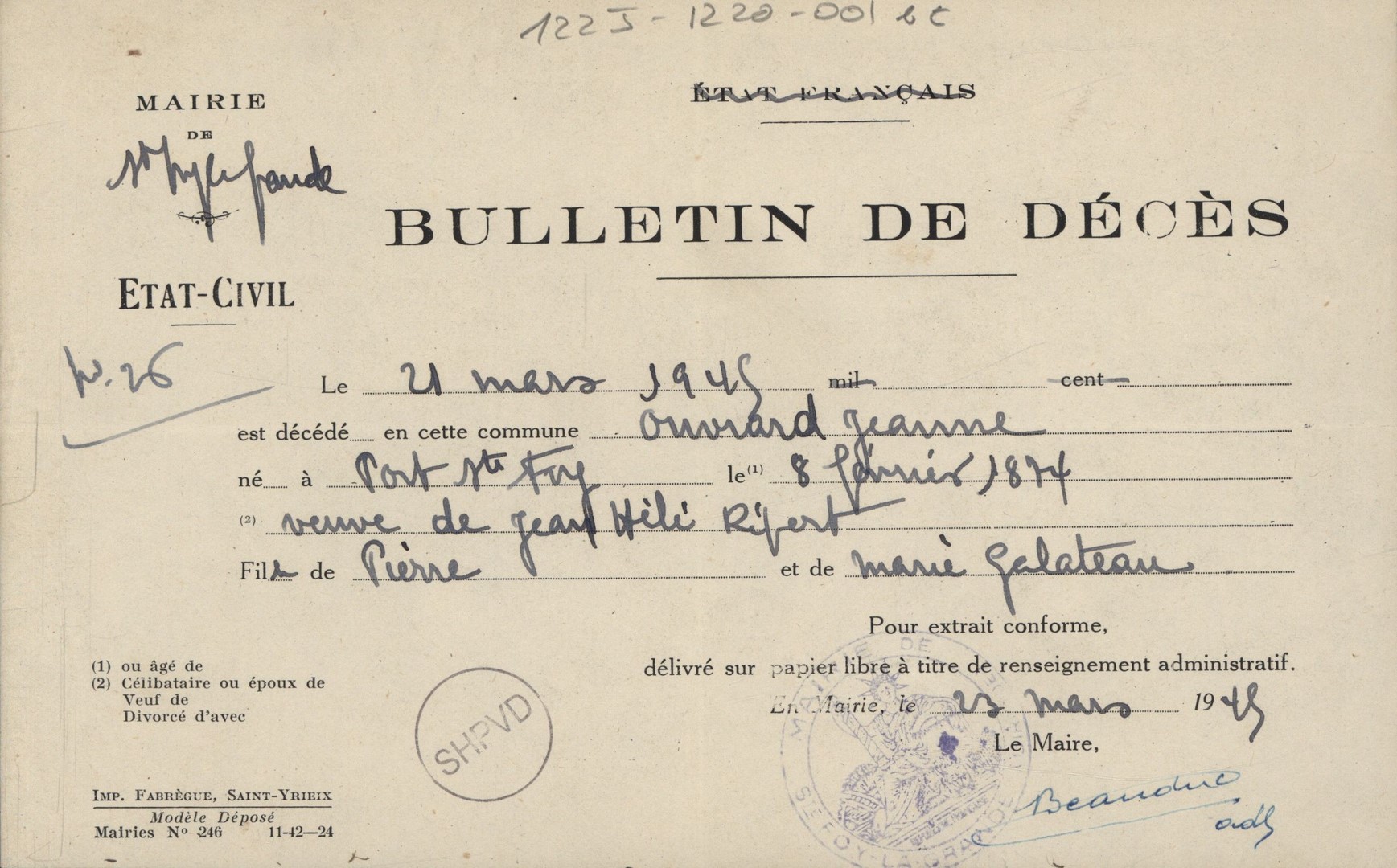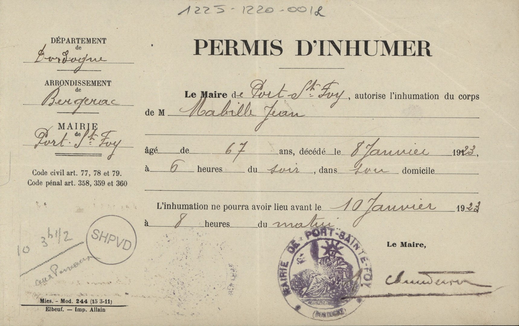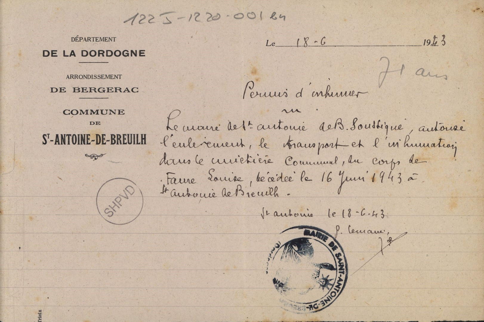 75 Permis d'inhumer 1922-1946 Charente (1939,1), Gironde (1925, 1), Bergerac (1939,1), Fougueyrolles (1924,1), Montcaret (1922, 1), Mussidan (1941, 1), Port-Ste-Foy (1922-1946, 60), St-Antoine-de-Breuil (1925-1942, 3), St-Méard-de-Gurçon (1924-1940, 4), Ste-Foy-la-Grande (1942-1945, 2) + "le lundi 26 juin 1944, j'ai présidé le service funèbre de Bob BRUYN, habitant l'École de Guyenne, blessé par des coups de feu de soldats allemands [...] inhumé au cimetière de Port-Ste-Foy. Pasteur Roger CASALIS. NB: le prénom de Bob était le véritable prénom du défunt, de nationalité hollandaise, et non un surnom."