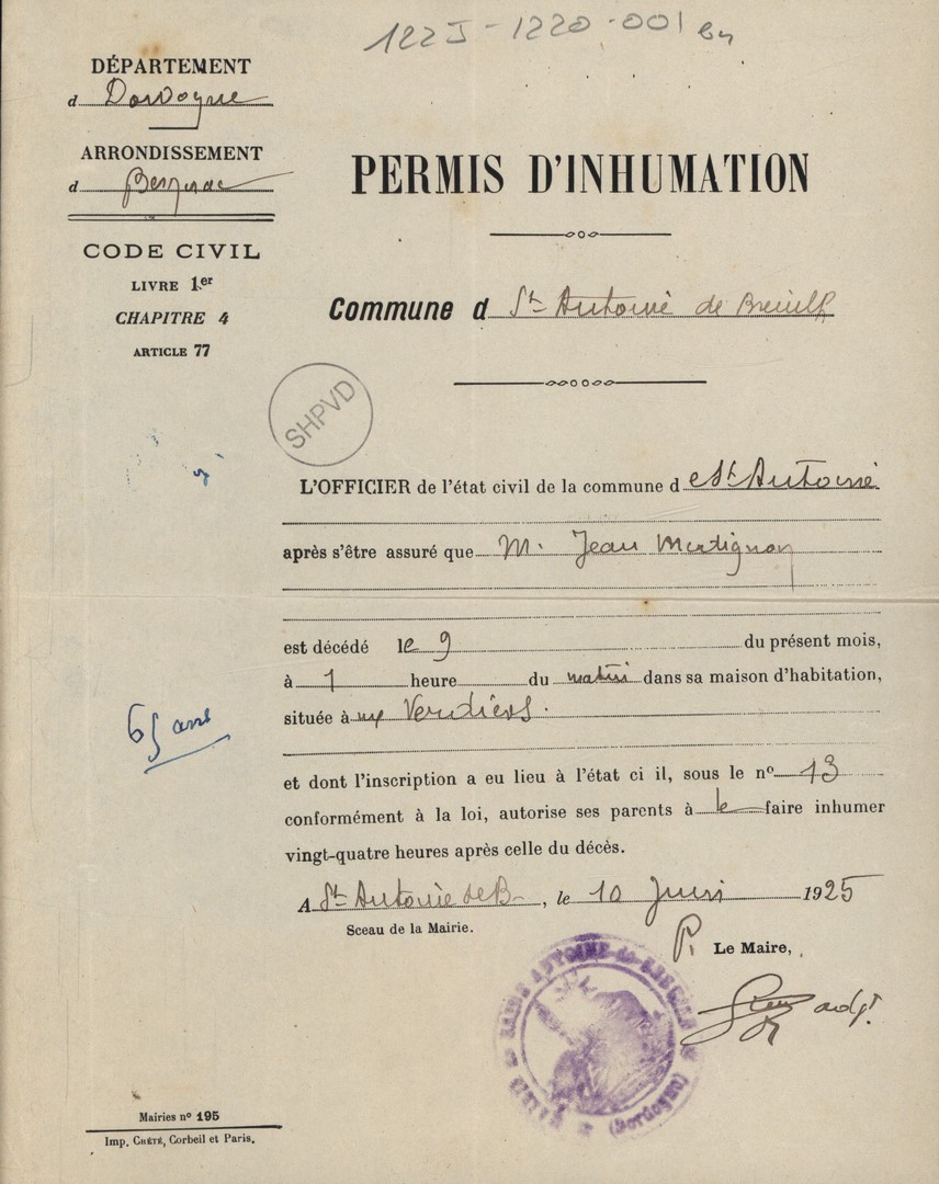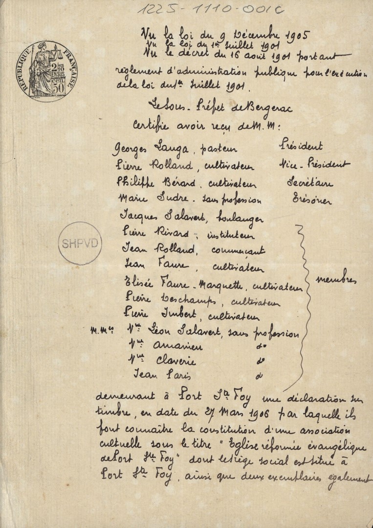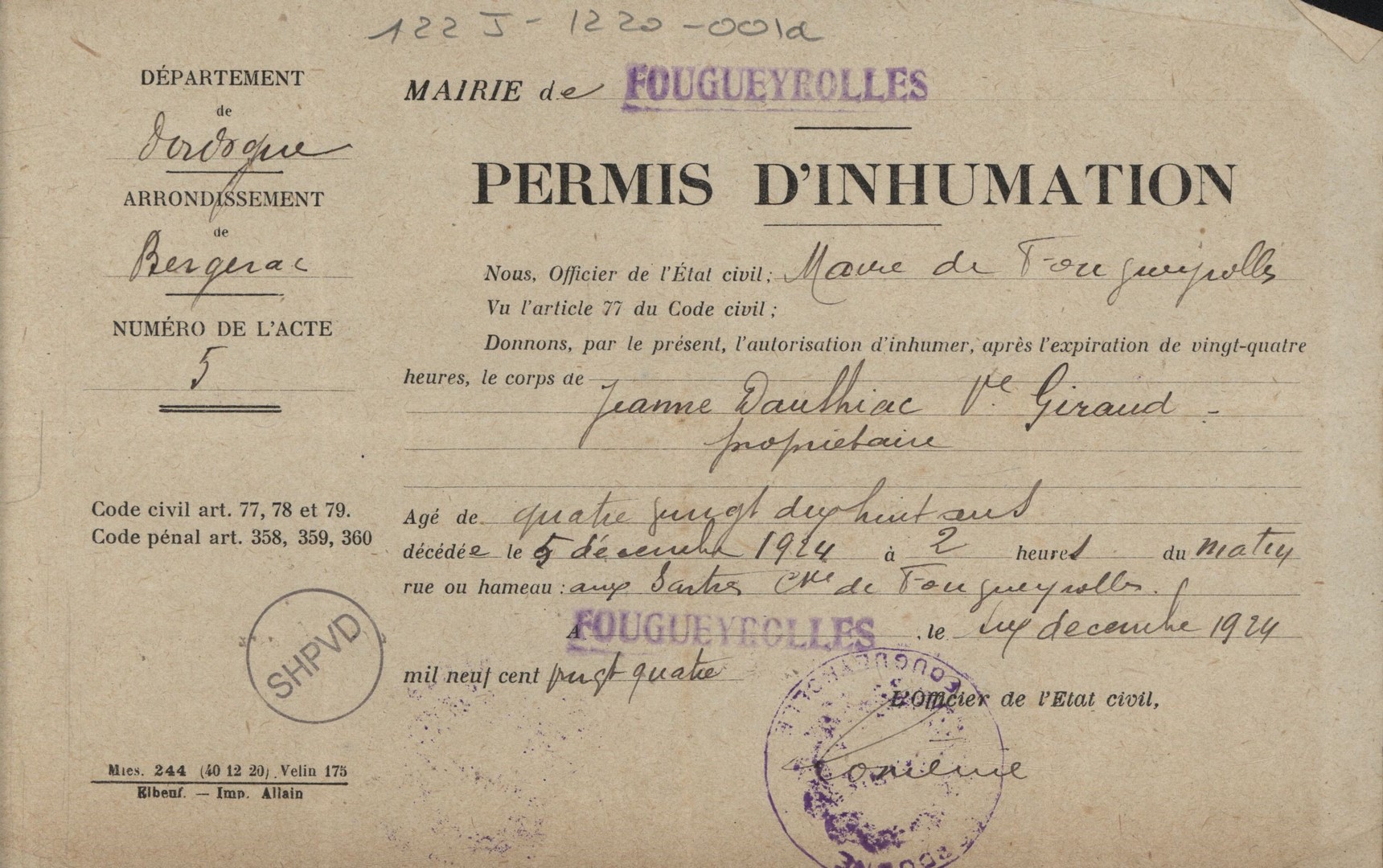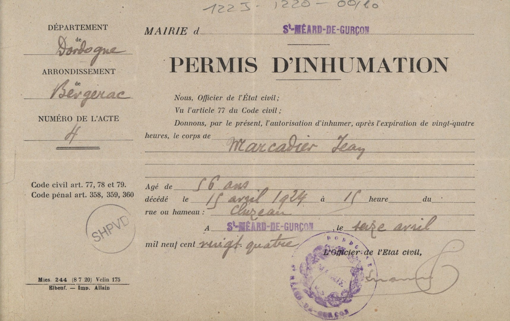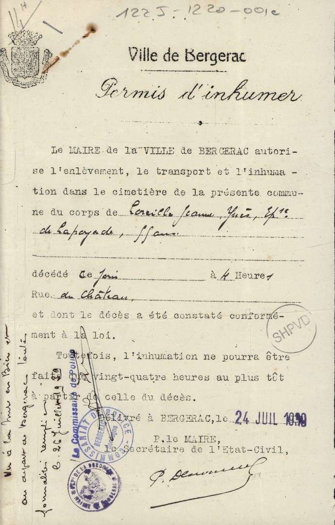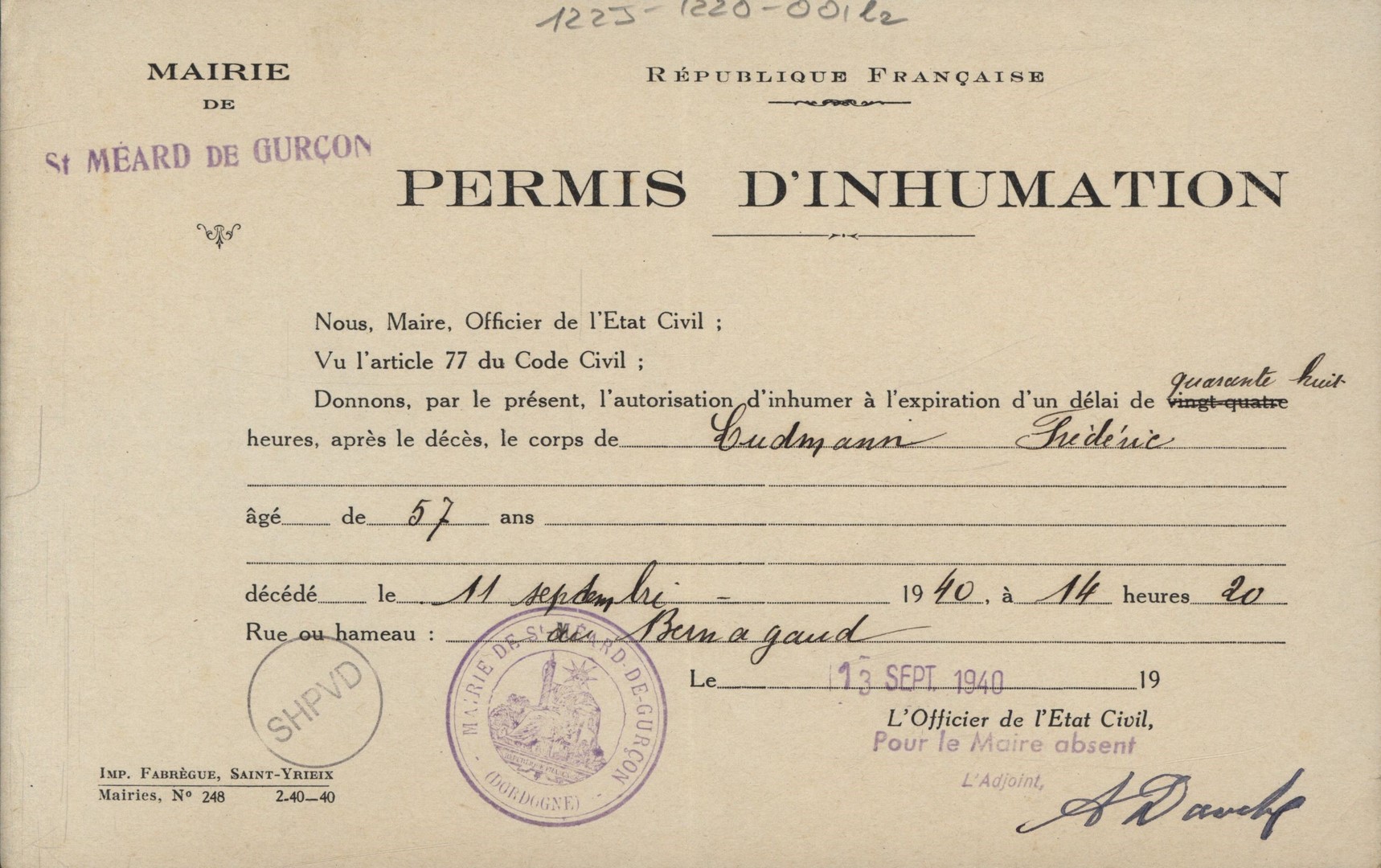 75 Permis d'inhumer 1922-1946 Charente (1939,1), Gironde (1925, 1), Bergerac (1939,1), Fougueyrolles (1924,1), Montcaret (1922, 1), Mussidan (1941, 1), Port-Ste-Foy (1922-1946, 60), St-Antoine-de-Breuil (1925-1942, 3), St-Méard-de-Gurçon (1924-1940, 4), Ste-Foy-la-Grande (1942-1945, 2) + "le lundi 26 juin 1944, j'ai présidé le service funèbre de Bob BRUYN, habitant l'École de Guyenne, blessé par des coups de feu de soldats allemands [...] inhumé au cimetière de Port-Ste-Foy. Pasteur Roger CASALIS. NB: le prénom de Bob était le véritable prénom du défunt, de nationalité hollandaise, et non un surnom."
