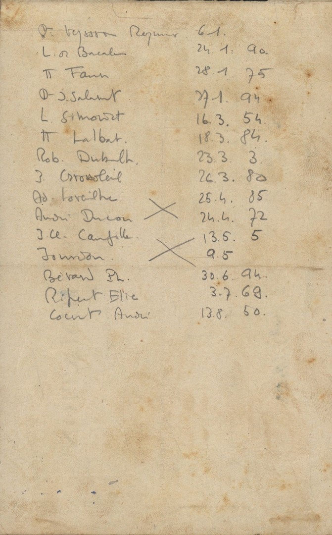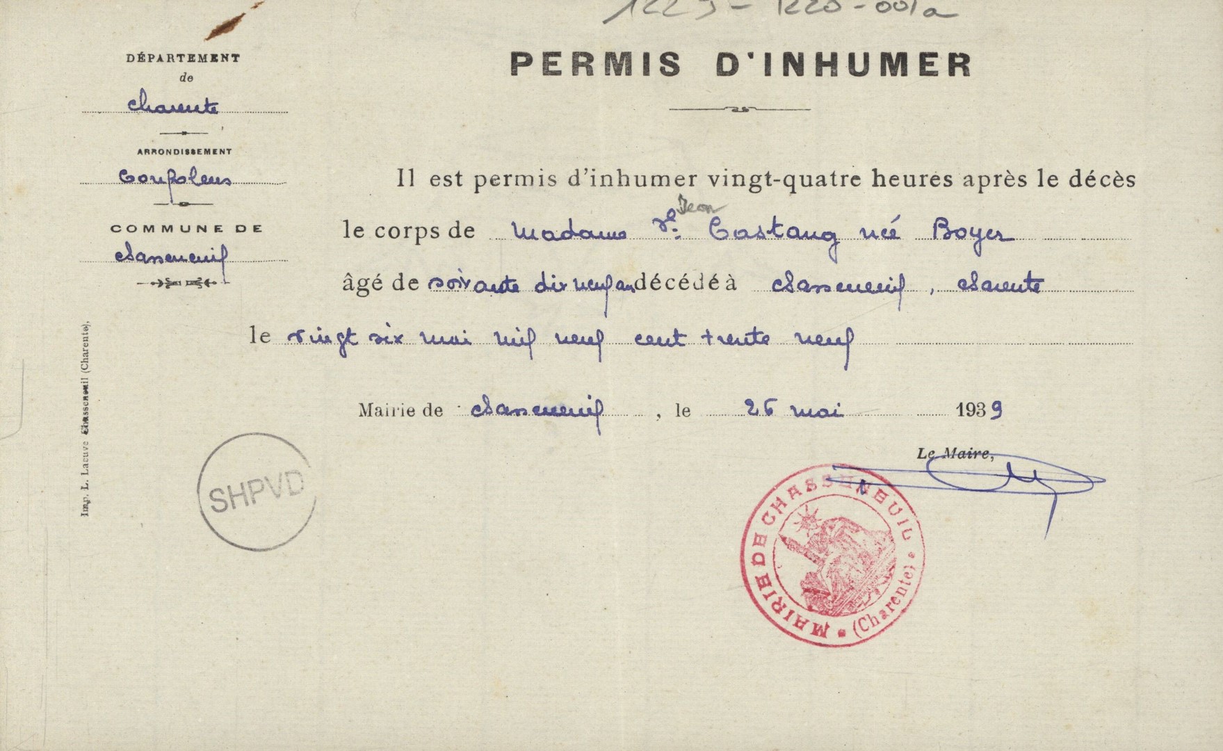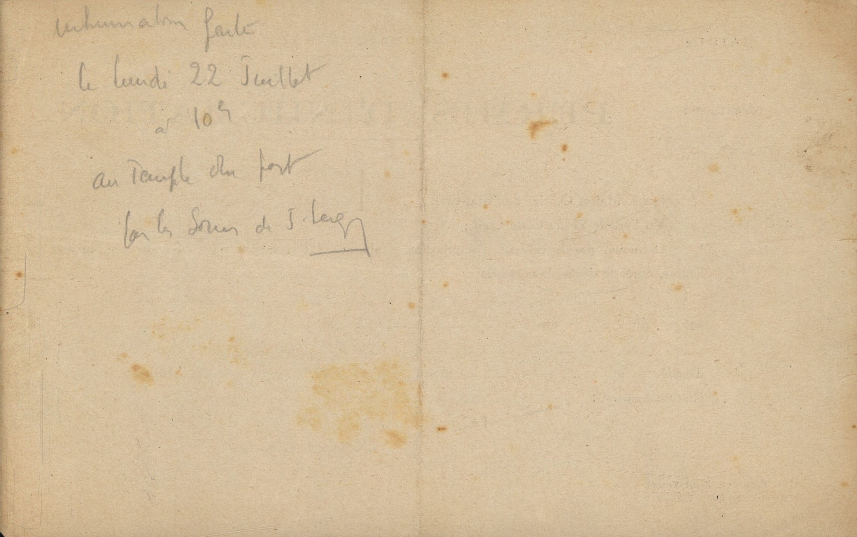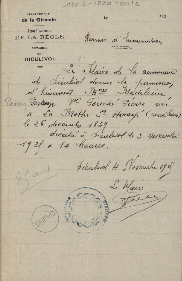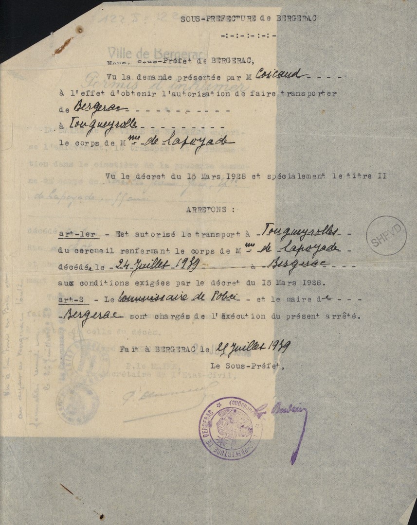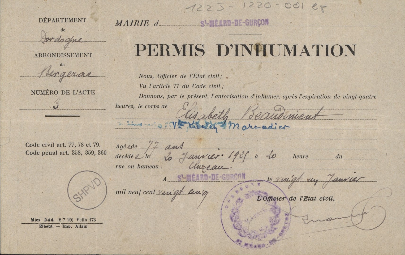 75 Permis d'inhumer 1922-1946 Charente (1939,1), Gironde (1925, 1), Bergerac (1939,1), Fougueyrolles (1924,1), Montcaret (1922, 1), Mussidan (1941, 1), Port-Ste-Foy (1922-1946, 60), St-Antoine-de-Breuil (1925-1942, 3), St-Méard-de-Gurçon (1924-1940, 4), Ste-Foy-la-Grande (1942-1945, 2) + "le lundi 26 juin 1944, j'ai présidé le service funèbre de Bob BRUYN, habitant l'École de Guyenne, blessé par des coups de feu de soldats allemands [...] inhumé au cimetière de Port-Ste-Foy. Pasteur Roger CASALIS. NB: le prénom de Bob était le véritable prénom du défunt, de nationalité hollandaise, et non un surnom."