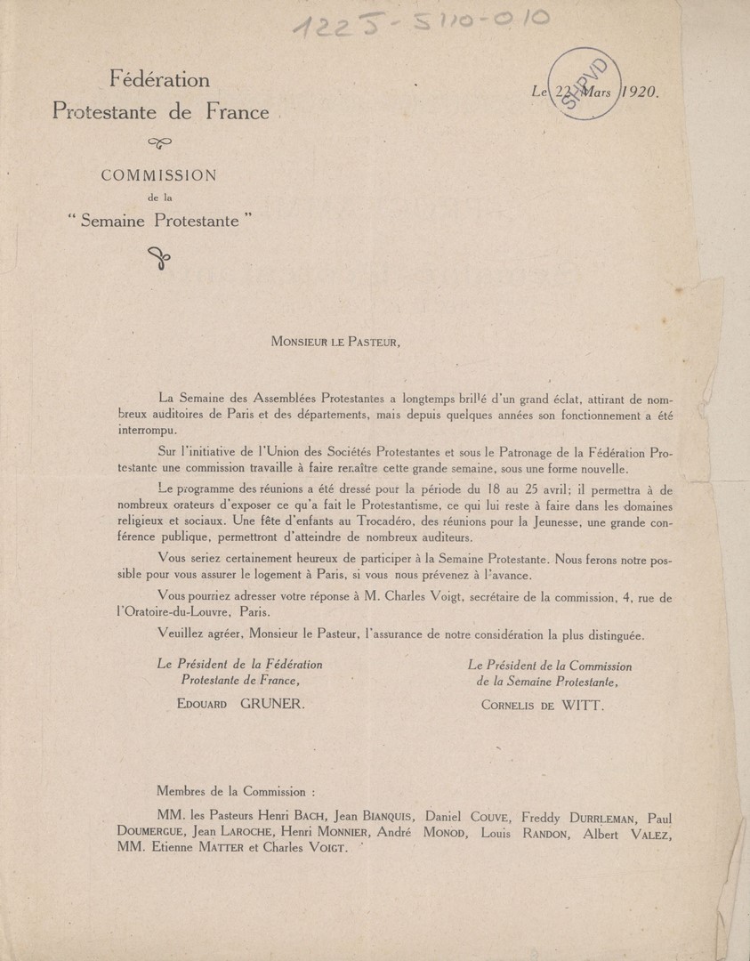 Comité Général de l'Union nationale des Églises réformées : circulaire adressée aux présidents et trésoriers des Conseils presbytéraux, concernant l'administration et la gestion financière des Eglises. "Il semble que depuis la guerre [...] un certain laisser-aller se soit introduit parmi nous quant à l'observation des règles relatives au fonctionnement des Associations cultuelles et à leur gestion financière". + circulaire du comité régional de l'Union nationale des Églises réformées (IV° région, Gironde et Dordogne) demandant la liste des membres du bureau et du Conseil presbytéral. Signée E. BACH