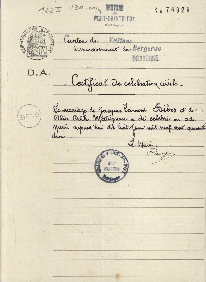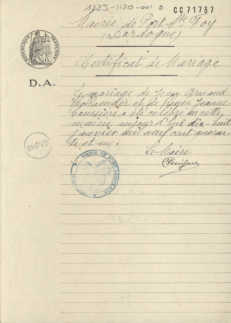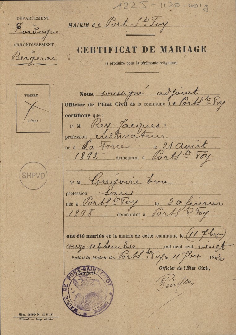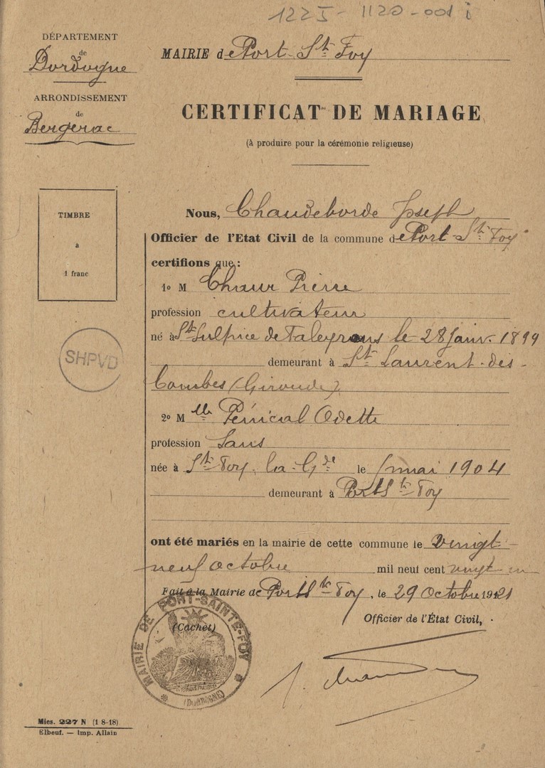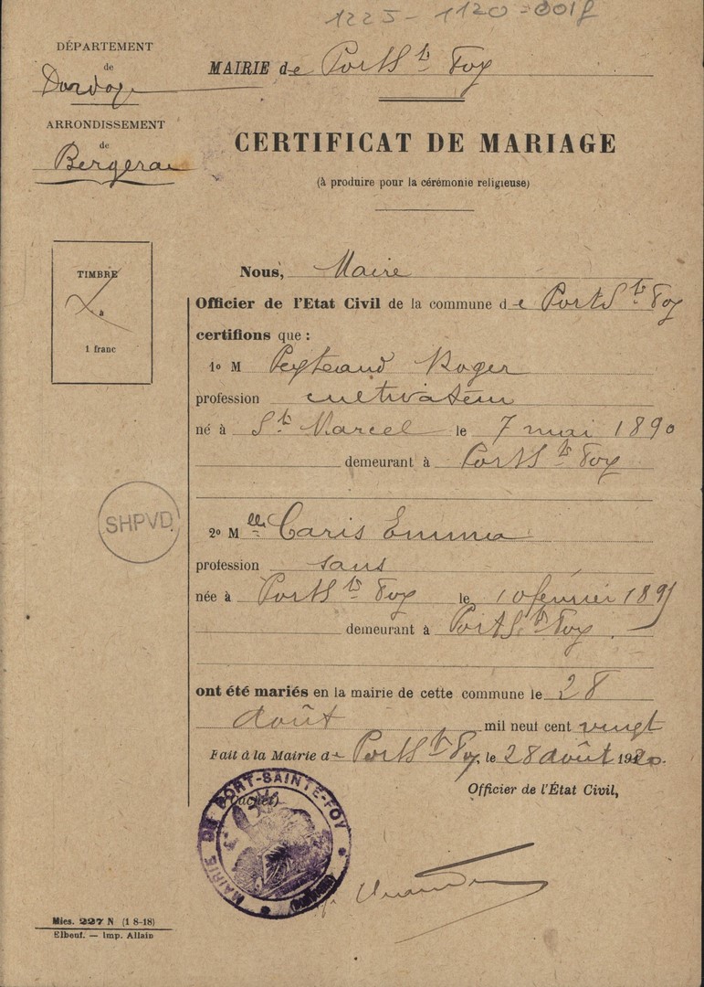 23 Bulletins de mariage civil. 1920-1950. Corrèze (1, 1942), le Fleix (1, 1947),Fougueyrolles (2, 1930), Pineuilh (1, 1927), Port-Ste-Foy (14, 1920 à 1950), Razac-de-Saussignac (1, 1935), St-Méard-de-Gurçon (2, 1930), St-Rémy (1, 1927). A noter: le mariage célébré en Corrèze est celui d'Olivier Hatzfeld habitant Port-Ste-Foy avec une jeune fille de Versailles, en 1942. Zone libre? + formulaire de certificat de mariage religieux (vierge), années 1900. (2 ex.)