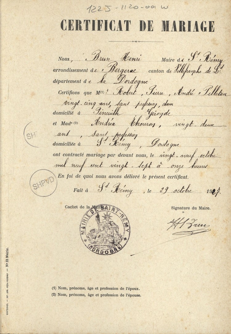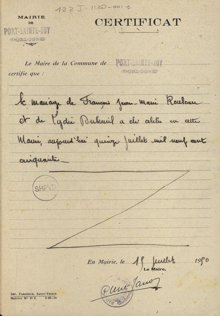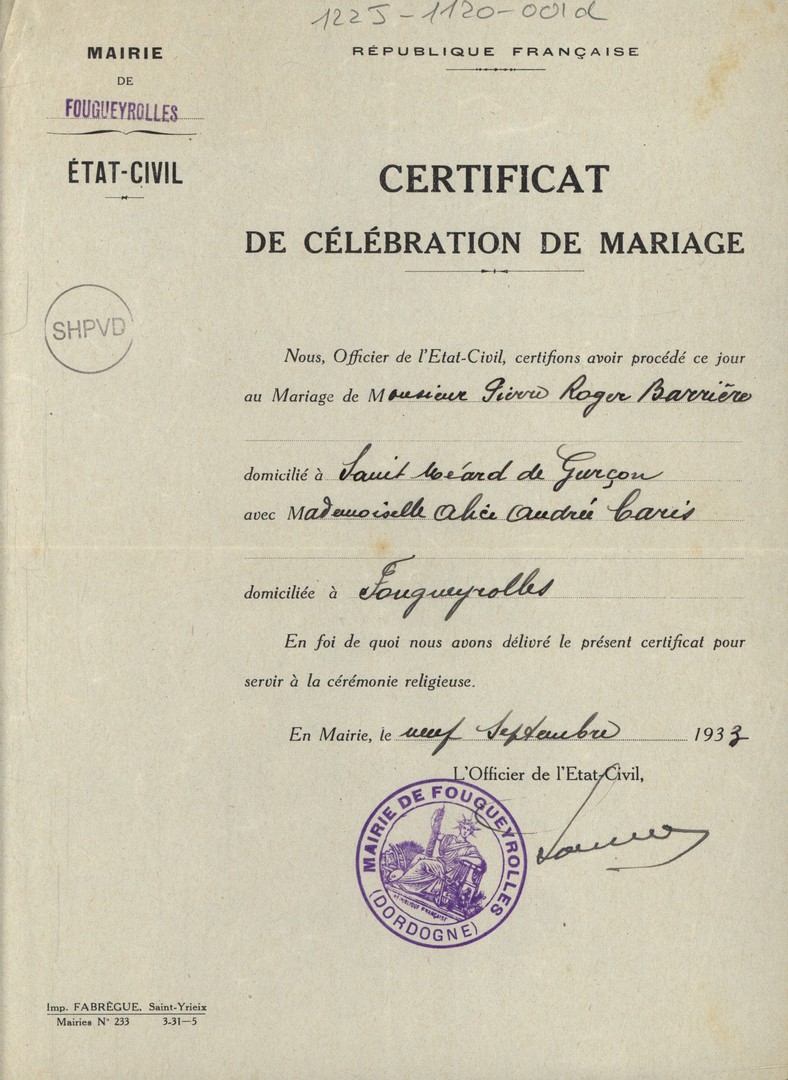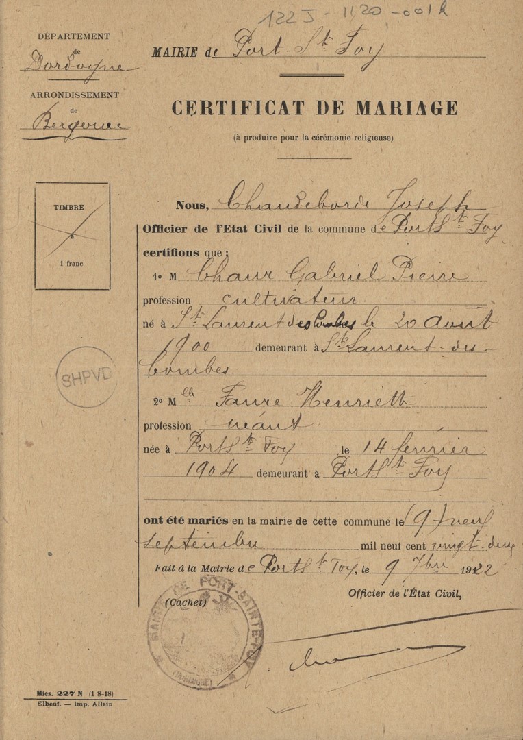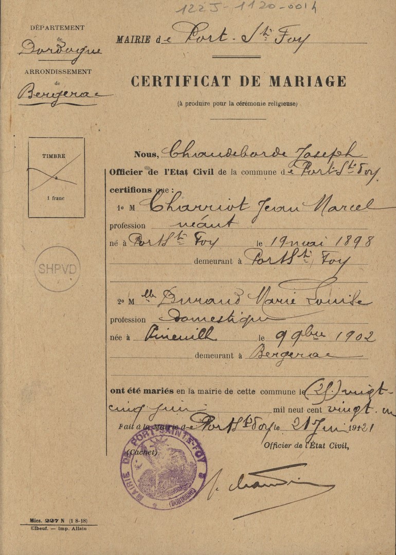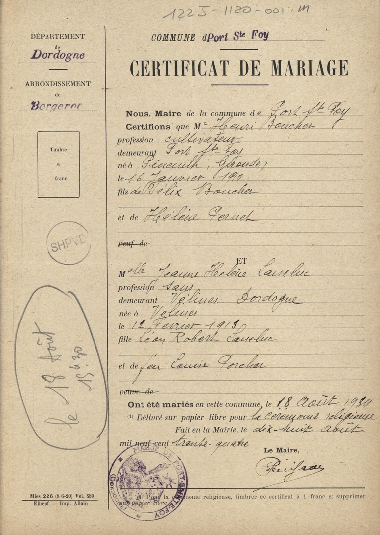 23 Bulletins de mariage civil. 1920-1950. Corrèze (1, 1942), le Fleix (1, 1947),Fougueyrolles (2, 1930), Pineuilh (1, 1927), Port-Ste-Foy (14, 1920 à 1950), Razac-de-Saussignac (1, 1935), St-Méard-de-Gurçon (2, 1930), St-Rémy (1, 1927). A noter: le mariage célébré en Corrèze est celui d'Olivier Hatzfeld habitant Port-Ste-Foy avec une jeune fille de Versailles, en 1942. Zone libre? + formulaire de certificat de mariage religieux (vierge), années 1900. (2 ex.)